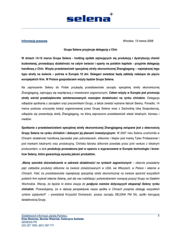 Informacja prasowa Wrocław, 13 marca 2008 Grupa Selena przyjmuje delegację z Chin W dniach 14-15 marca Grupa Selena - holding spółek zajmujących się produkcją i dystrybucją chemii budowlanej, prowadzący działalność na całym świecie i oparty na polskim kapitale - przyjmie delegację handlową z Chin. Wizyta przedstawicieli specjalnej strefy ekonomicznej Zhangjiagang – największej tego typu strefy na świecie – potrwa w Europie 10 dni. Delegaci zwiedzać będą zakłady należące do pięciu europejskich firm. W Polsce gospodarzem wizyty będzie Grupa Selena. Na zaproszenie Seleny do Polski przybędą przedstawiciele zarządu specjalnej strefy ekonomicznej Zhangjiagang, zajmujący się współpracą z inwestorami zagranicznymi. Celem wizyty w Europie jest promocja strefy wśród przedsiębiorstw zainteresowanych rozwojem działalności na rynku chińskim. Delegacja odbędzie spotkania z zarządem oraz pracownikami Grupy, a także zwiedzi wybrane fabryki Seleny. Ponadto, 14 marca podczas uroczystej kolacji organizowanej przez Grupę Selena wraz z Zachodnią Izbą Gospodarczą, odbędzie się prezentacja strefy Zhangjiagang, na którą zaproszono przedstawicieli władz lokalnych, biznesu i mediów. Spotkanie z przedstawicielami specjalnej strefy ekonomicznej Zhangjiagang związane jest z obecnością Grupy Selena na rynku chińskim i dalszymi jej planami inwestycyjnymi. W 2007 roku Selena uruchomiła w Chinach działalność handlową (sprzedaż pian poliuretanach, silikonów i klejów pod marką Tytan Professional i pod markami lokalnymi) oraz produkcyjną. Chińska fabryka silikonów powstała przez joint venture z lokalnym producentem, a dziś produkcja prowadzona jest w oparciu o wypracowane w Europie technologie i knowhow Seleny, które gwarantują wysoką jakość produktów. „Mamy szerokie doświadczenie w zakresie działalności na rynkach zagranicznych – obecnie posiadamy pięć zakładów produkcji silikonów na świecie zlokalizowanych w USA, we Włoszech, w Polsce i właśnie w Chinach. Fakt, że przedstawiciele największej specjalnej strefy ekonomicznej na świecie spośród wszystkich polskich firm wybrali właśnie Selenę, jest dla nas nobilitacją i potwierdzeniem rosnącej pozycji Grupy na Dalekim Wschodzie. Wierzę, że będzie to dobra okazja do podjęcia rozmów dotyczących ekspansji Seleny rynku chińskim. Przewidujemy, że w dalszej perspektywie nasza spółka w Chinach przejmie obsługę wszystkich rynków azjatyckich” – powiedział Krzysztof Domarecki, prezes zarządu SELENA FM SA, spółki kierującej działalnością Grupy. Dodatkowych informacji udzielą Państwu: Eliza Misiecka, Monika Wlaźniak, Katarzyna Szafader GENESIS PR (22) 327 1690, (601) 367-771 1 Grupa Selena jest pierwszą polską firmą podejmującą produkcję i sprzedaż uszczelniaczy na rynku chińskim. Na Dalekim Wschodzie Grupa obecna jest już od kilku lat: od 2001 roku w Korei Południowej działa fabryka piany poliuretanowej, którą prowadzi spółka Hamil - Selena Co. Ltd. Specjalna strefa ekonomiczna Zhangjiagang powstała w roku 1992 w centrum delty rzeki Jangcy, aby ułatwić i przyspieszyć rozwój całej doliny rzeki. Strefa położona jest w pobliżu drogi ekspresowej Pekin-Szanghaj, posiada bezpośrednie połączenie z wybrzeżem oraz największy w Chinach śródlądowy port rzeczny, który może przyjmować statki pełnomorskie i jest doskonałą bazą do transportu towarów w głąb kraju. W jej sąsiedztwie znajdują się liczne miasta i lotniska. Dużym atutem dla inwestorów jest też unikalna infrastruktura przystosowana do obsługi zakładów produkcyjnych i magazynów znajdujących się na terenie strefy. Informacje dodatkowe: Grupa Selena to holding spółek zajmujących się produkcją i dystrybucją chemii budowlanej, prowadzący działalność na całym świecie i oparty na polskim kapitale. W skład Grupy wchodzi 25 spółek, w tym 17 podmiotów zagranicznych oraz 9 nowoczesnych zakładów produkcyjnych (4 zakłady w Polsce, po jednym we Włoszech, w Brazylii, Korei, Chinach oraz USA). Grupa Selena jest - pod względem wielkości - czwartym na świecie producentem piany poliuretanowej używanej do montażu okien i drzwi. Grupa Selena systematycznie zwiększa sprzedaż eksportową, która w 2006 roku stanowiła 65,5% przychodów. Realizuje zamówienia na rynkach 50 państw, w tym przez własne spółki handlowe zlokalizowane w 15 krajach (Polska, Rosja, Czechy, Finlandia, Kazachstan, Ukraina, Bułgaria, Rumunia, Węgry, Niemcy, Włochy, Brazylia, USA, Korea Płd. i Chiny). Ponadto, Grupa Selena planuje umacnianie pozycji w regionach: Azji Południowo-Wschodniej (Chiny), Bliskiego Wschodu (Turcja i Egipt oraz petrokraje Półwyspu Arabskiego), Ameryki Południowej (Argentyna), Ameryki Północnej (Kanada)oraz dalszą ekspansję na nowe rynki zagraniczne. Grupa Selena oferuje szeroką gamę produktów przeznaczonych zarówno dla profesjonalnych wykonawców, jak i użytkowników indywidualnych - główne marki to TYTAN oraz ARTELIT. Pozycja rynkowa Kluczowym elementem strategii Grupy Selena jest jakość. Pojęcie "przewaga dzięki produktowi" oznacza, że w każdej kategorii produktów Grupa Selena dąży do tego, aby jej wyroby miały najwyższą pozycję jakościową. Taka strategia zapewnia wysoki poziom zaufania klientów do produktów i procentuje w przyznawanych spółce licznych wyróżnieniach. Pozycja Grupy Selena w Polsce: Dodatkowych informacji udzielą Państwu: Eliza Misiecka, Monika Wlaźniak, Katarzyna Szafader GENESIS PR (22) 327 1690, (601) 367-771 2 1. Lider w kategorii pian: 37% udziału w rynku (w ujęciu wartościowym oraz ilościowym). 2. Drugie miejsce w kategorii uszczelniaczy: 19% udziału w rynku. Działalność Grupy Selena obejmuje wszystkie etapy tworzenia produktów: począwszy od zaawansowanych badań, przez produkcję, dystrybucję, marketing, aż po sprzedaż na całym świecie. Na każdym etapie kreowania produkt