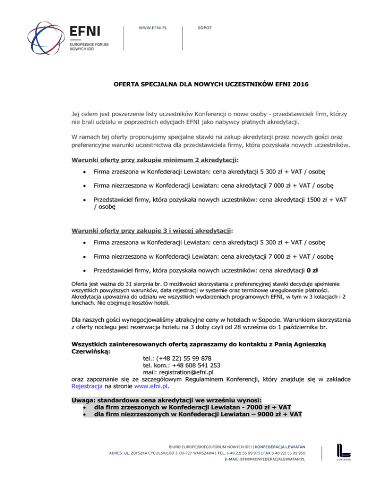 OFERTA SPECJALNA DLA NOWYCH UCZESTNIKÓW EFNI 2016 Jej celem jest poszerzenie listy uczestników Konferencji o nowe osoby - przedstawicieli firm, którzy nie brali udziału w poprzednich edycjach EFNI jako nabywcy płatnych akredytacji. W ramach tej oferty proponujemy specjalne stawki na zakup akredytacji przez nowych gości oraz preferencyjne warunki uczestnictwa dla przedstawiciela firmy, która pozyskała nowych uczestników. Warunki oferty przy zakupie minimum 2 akredytacji: Firma zrzeszona w Konfederacji Lewiatan: cena akredytacji 5 300 zł + VAT / osobę Firma niezrzeszona w Konfederacji Lewiatan: cena akredytacji 7 000 zł + VAT / osobę Przedstawiciel firmy, która pozyskała nowych uczestników: cena akredytacji 1500 zł + VAT / osobę Warunki oferty przy zakupie 3 i więcej akredytacji: Firma zrzeszona w Konfederacji Lewiatan: cena akredytacji 5 300 zł + VAT / osobę Firma niezrzeszona w Konfederacji Lewiatan: cena akredytacji 7 000 zł + VAT / osobę Przedstawiciel firmy, która pozyskała nowych uczestników: cena akredytacji 0 zł Oferta jest ważna do 31 sierpnia br. O możliwości skorzystania z preferencyjnej stawki decyduje spełnienie wszystkich powyższych warunków, data rejestracji w systemie oraz terminowe uregulowanie płatności. Akredytacja upoważnia do udziału we wszystkich wydarzeniach programowych EFNI, w tym w 3 kolacjach i 2 lunchach. Nie obejmuje kosztów hoteli. Dla naszych gości wynegocjowaliśmy atrakcyjne ceny w hotelach w Sopocie. Warunkiem skorzystania z oferty noclegu jest rezerwacja hotelu na 3 doby czyli od 28 września do 1 października br. Wszystkich zainteresowanych ofertą zapraszamy do kontaktu z Panią Agnieszką Czerwińską: tel.: (+48 22) 55 99 878 tel. kom.: +48 608 541 253 mail: [email protected] oraz zapoznanie się ze szczegółowym Regulaminem Konferencji, który znajduje się w zakładce Rejestracja na stronie www.efni.pl. Uwaga: standardowa cena akredytacji we wrześniu wynosi: dla firm zrzeszonych w Konfederacji Lewiatan - 7000 zł + VAT dla firm niezrzeszonych w Konfederacji Lewiatan – 9000 zł + VAT