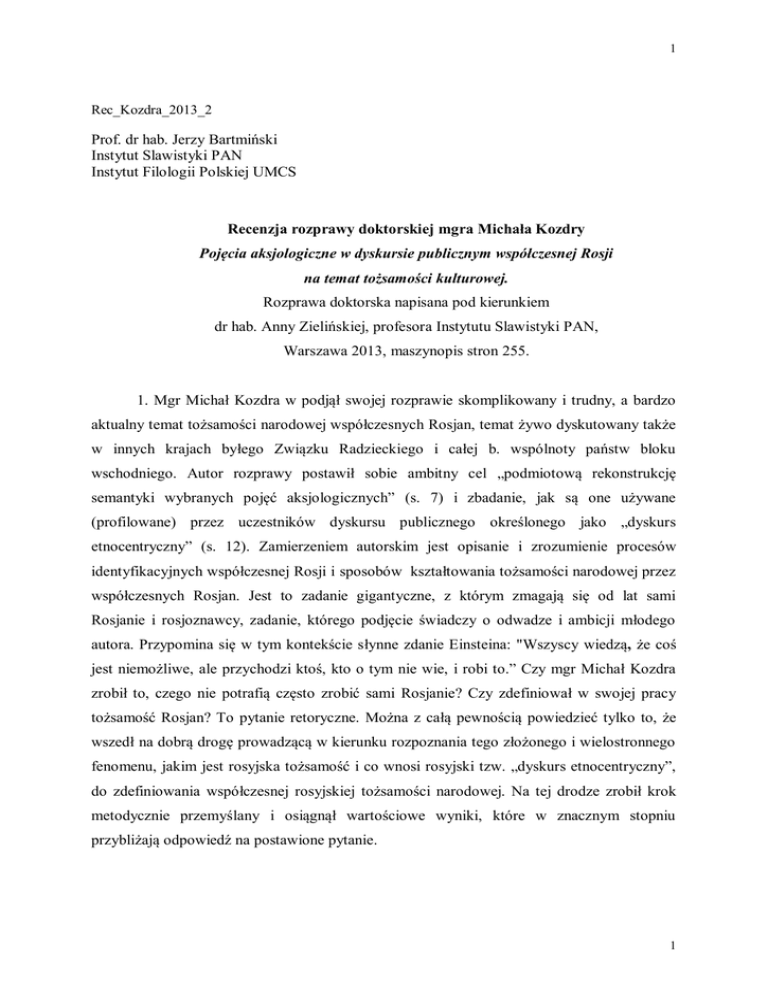 1 Rec_Kozdra_2013_2 Prof. dr hab. Jerzy Bartmiński Instytut Slawistyki PAN Instytut Filologii Polskiej UMCS Recenzja rozprawy doktorskiej mgra Michała Kozdry Pojęcia aksjologiczne w dyskursie publicznym współczesnej Rosji na temat tożsamości kulturowej. Rozprawa doktorska napisana pod kierunkiem dr hab. Anny Zielińskiej, profesora Instytutu Slawistyki PAN, Warszawa 2013, maszynopis stron 255. 1. Mgr Michał Kozdra w podjął swojej rozprawie skomplikowany i trudny, a bardzo aktualny temat tożsamości narodowej współczesnych Rosjan, temat żywo dyskutowany także w innych krajach byłego Związku Radzieckiego i całej b. wspólnoty państw bloku wschodniego. Autor rozprawy postawił sobie ambitny cel „podmiotową rekonstrukcję semantyki wybranych pojęć aksjologicznych” (s. 7) i zbadanie, jak są one używane (profilowane) przez uczestników dyskursu publicznego określonego jako „dyskurs etnocentryczny” (s. 12). Zamierzeniem autorskim jest opisanie i zrozumienie procesów identyfikacyjnych współczesnej Rosji i sposobów kształtowania tożsamości narodowej przez współczesnych Rosjan. Jest to zadanie gigantyczne, z którym zmagają się od lat sami Rosjanie i rosjoznawcy, zadanie, którego podjęcie świadczy o odwadze i ambicji młodego autora. Przypomina się w tym kontekście słynne zdanie Einsteina: "Wszyscy wiedzą, że coś jest niemożliwe, ale przychodzi ktoś, kto o tym nie wie, i robi to.” Czy mgr Michał Kozdra zrobił to, czego nie potrafią często zrobić sami Rosjanie? Czy zdefiniował w swojej pracy tożsamość Rosjan? To pytanie retoryczne. Można z całą pewnością powiedzieć tylko to, że wszedł na dobrą drogę prowadzącą w kierunku rozpoznania tego złożonego i wielostronnego fenomenu, jakim jest rosyjska tożsamość i co wnosi rosyjski tzw. „dyskurs etnocentryczny”, do zdefiniowania współczesnej rosyjskiej tożsamości narodowej. Na tej drodze zrobił krok metodycznie przemyślany i osiągnął wartościowe wyniki, które w znacznym stopniu przybliżają odpowiedź na postawione pytanie. 1 2 2. Co do zakresu tematycznego rozprawy: Tytuł rozprawy jest bardzo szeroki, pod trzema względami nawet za szeroki w stosunku do jej zawartości, przypomnę: Pojęcia aksjologiczne w dyskursie publicznym współczesnej Rosji na temat tożsamości kulturowej. W rzeczywistości autor omawia tylko wybrane pojęcia” i nie w całym dyskursie publicznym, lecz tylko w jednej z form tego dyskursu, w komunikacji internetowej i ulicznej; przy tym nie chodzi o tożsamość tylko kulturową, ale (jak analizowany materiał pokazuje) też (i nawet bardziej) etniczną i polityczną. Z obowiązku recenzenta musze powiedzieć, że sam tytuł pracy zawiera niezręczne sformułowanie „dyskurs… na temat”; takiej składni nie zna język polski, nie odnotowała jej Dorota Brzozowska (Dyskurs i jego kolokacje, 2010), która zarejestrowała w polszczyźnie standardowej jedynie takie kolokacje, jak dyskurs o czymś, w czymś, czegoś, nad czym (o tym można znaleźć informację w samej rozprawie Michała Kozdry na s.53). Takj więc rozprawa mgra Kozdry w obecnej wersji stanowi jedynie cząstkowe przybliżenie bardzo rozległego tematu. Cząstkowe z dwóch szczegółowych względów, nie tylko z powodu ograniczenia się do materiałów internetowych i ulicznych (takie ograniczenia co do źródeł są w rozprawach naukowych rzeczą normalną), lecz przede wszystkim ze względu na wybór tylko 5 pojęć (konceptów) - MIGRANCI, ROSJA, JĘZYK ROSYJSKI, „RUSSKIJ MIR”, WŁADZA. Po pierwsze – w przestrzeni rosyjskiego dyskursu publicznego zarówno dyskursów, jak ważnych pojęć aksjologicznych jest więcej. Obok dyskursu narodowego (nacjonalistycznego), funkcjonują przecież w Rosji także inne dyskursy tożsamościowe, bardziej otwarte na Europę i świat. Cytowana przez Kozdrę praca Jeleny Lewkijewskiej o współczesnym rosyjskim micie tożsamościowym („E” 12, 2000) wyznacza dominującą pozycję dwom mitom opartym na nostalgii za minioną przeszłością – monarchistycznemu i komunistycznemu, potwierdza też istnienie wciąż jeszcze słabego – mitu prozachodniego (tradycyjnie określanego mianem zapadniczestwa). W rozprawie Michała Kozdra te nurty nie znalazły dla siebie miejsca. Są jednak obecne w rosyjskim dyskursie tożsamościowym toczonym w otwartej przestrzeni medialnej, w prasie, radiu i telewizji. W rozprawie Michała Kozdry np. władza jest pokazana jedynie w aspekcie negacji i krytyki, władza jako okupant, podczas gdy w rzeczywistości społeczeństwo rosyjskie w wyborach prezydenckich w czerwcu roku 2012 w ogromnej swej masie władzę te poparło, uznało za swoją (choć wybory nie były do końca czestnyje, jak słusznie głosi opozycja (por. Irina Sedakova w „E” t. 25, 2013). Pytanie o pełne spektrum dyskursu czy dyskursów tożsamościowych pozostaje więc otwarte. 2 3 Po drugie – otwarte też pozostaje pytanie o kanon narodowych wartości rosyjskich, bo przecież nie ogranicza się on do pięciu pojęć (konceptów) omawianych w rozprawie. Wie o tym zresztą doskonale sam autor, bo omawiając wymienia szereg dalszych konceptów, jak dorobek rosyjskiej lingwokulturologii (za Stepanowem): РОДНАЯ ЗЕМЛЯ, ЦИВИЛИЗАЦИЯ, ГРАЖ-ДАНСКОЕ ОБЩЕСТВО, СЛАВЯНОФИЛЫ и ЗАПАДНИКИ, ОБЩИНА, ЯЗЫК – czy (za Stefańskim): ГЛАСНОСТЬ, ПЕРЕСРОЙКА, ГОСТЕПРИИМСТВО, ИСТИНА, ЛИЧНОСТЬ, МУДРОСТЬ, ПАМЯТЬ, РОДИНА, СПРАВЕДЛИВОСТЬ, ВИНА, СУДЬБА, УДОВОЛЬСТВИЕ. Niemniej materiał zebrany przez Michała Kozdrę jest bardzo wartościowy i daje wycinkowy wprawdzie, ale pogłębiony wgląd w treściową zawartość ważnego fragmentu rosyjskiej mentalności zbiorowej. 3. Kompozycja rozprawy. Główna jej część - złożona z czterech rozdziałów - została obudowana przez dwus