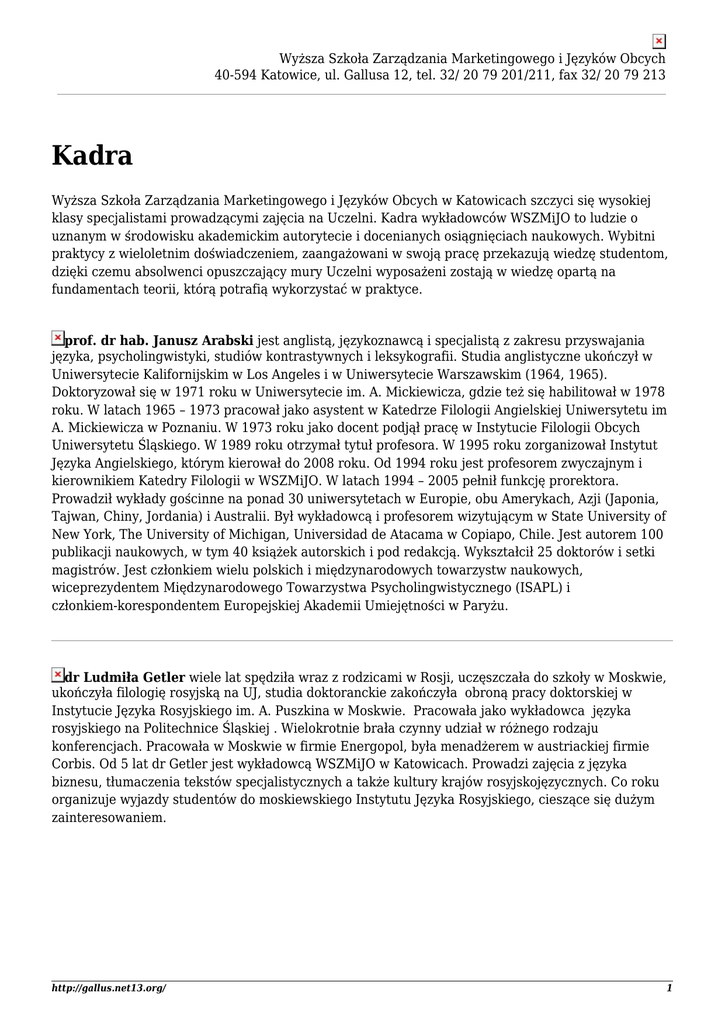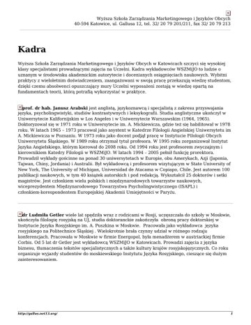 Wyższa Szkoła Zarządzania Marketingowego i Języków Obcych 40-594 Katowice, ul. Gallusa 12, tel. 32/ 20 79 201/211, fax 32/ 20 79 213 Kadra Wyższa Szkoła Zarządzania Marketingowego i Języków Obcych w Katowicach szczyci się wysokiej klasy specjalistami prowadzącymi zajęcia na Uczelni. Kadra wykładowców WSZMiJO to ludzie o uznanym w środowisku akademickim autorytecie i docenianych osiągnięciach naukowych. Wybitni praktycy z wieloletnim doświadczeniem, zaangażowani w swoją pracę przekazują wiedzę studentom, dzięki czemu absolwenci opuszczający mury Uczelni wyposażeni zostają w wiedzę opartą na fundamentach teorii, którą potrafią wykorzystać w praktyce. prof. dr hab. Janusz Arabski jest anglistą, językoznawcą i specjalistą z zakresu przyswajania języka, psycholingwistyki, studiów kontrastywnych i leksykografii. Studia anglistyczne ukończył w Uniwersytecie Kalifornijskim w Los Angeles i w Uniwersytecie Warszawskim (1964, 1965). Doktoryzował się w 1971 roku w Uniwersytecie im. A. Mickiewicza, gdzie też się habilitował w 1978 roku. W latach 1965 – 1973 pracował jako asystent w Katedrze Filologii Angielskiej Uniwersytetu im A. Mickiewicza w Poznaniu. W 1973 roku jako docent podjął pracę w Instytucie Filologii Obcych Uniwersytetu Śląskiego. W 1989 roku otrzymał tytuł profesora. W 1995 roku zorganizował Instytut Języka Angielskiego, którym kierował do 2008 roku. Od 1994 roku jest profesorem zwyczajnym i kierownikiem Katedry Filologii w WSZMiJO. W latach 1994 – 2005 pełnił funkcję prorektora. Prowadził wykłady gościnne na ponad 30 uniwersytetach w Europie, obu Amerykach, Azji (Japonia, Tajwan, Chiny, Jordania) i Australii. Był wykładowcą i profesorem wizytującym w State University of New York, The University of Michigan, Universidad de Atacama w Copiapo, Chile. Jest autorem 100 publikacji naukowych, w tym 40 książek autorskich i pod redakcją. Wykształcił 25 doktorów i setki magistrów. Jest członkiem wielu polskich i międzynarodowych towarzystw naukowych, wiceprezydentem Międzynarodowego Towarzystwa Psycholingwistycznego (ISAPL) i członkiem-korespondentem Europejskiej Akademii Umiejętności w Paryżu. dr Ludmiła Getler wiele lat spędziła wraz z rodzicami w Rosji, uczęszczała do szkoły w Moskwie, ukończyła filologię rosyjską na UJ, studia doktoranckie zakończyła obroną pracy doktorskiej w Instytucie Języka Rosyjskiego im. A. Puszkina w Moskwie. Pracowała jako wykładowca języka rosyjskiego na Politechnice Śląskiej . Wielokrotnie brała czynny udział w różnego rodzaju konferencjach. Pracowała w Moskwie w firmie Energopol, była menadżerem w austriackiej firmie Corbis. Od 5 lat dr Getler jest wykładowcą WSZMiJO w Katowicach. Prowadzi zajęcia z języka biznesu, tłumaczenia tekstów specjalistycznych a także kultury krajów rosyjskojęzycznych. Co roku organizuje wyjazdy studentów do moskiewskiego Instytutu Języka Rosyjskiego, cieszące się dużym zainteresowaniem. http://gallus.net13.org/ 1 Wyższa Szkoła Zarządzania Marketingowego i Języków Obcych 40-594 Katowice, ul. Gallusa 12, tel. 32/ 20 79 201/211, fax 32/ 20 79 213 dr Agnieszka Wiśniak jest absolwentką Filologii polskiej Uniwersytetu Opolskiego. Tam też doktoryzowała się w 2003 roku na podstawie pracy Topos śmierci w poezji Haliny Poświatowskiej, Wisławy Szymborskiej i Ewy Lipskiej, która ukazała się drukiem w 2006 roku. Początkowo pracowała jako nauczyciel języka polskiego w liceum dziennym i zaocznym w Społecznym Językowym Liceum Ogólnokształcącym Wolnego Stowarzyszenia Edukacyjnego Regionu Opolskiego w Opolu, gdzie w 2000 roku otrzymała stopień nauczyciela kontraktowego. Od 2004 roku pracuje w WSZMiJO w Katowicach na stanowisku adiunkta. Od maja 2007 roku pełni funkcję prodziekana Wydziału Humanistycznego. Prowadzi zajęcia m.in. z podstaw kulturoznawstwa, komunikacji międzykulturowej, kultury języka polskiego, analizy języka mediów. Jest również opiekunem Koła Dziennikarskiego WSZMiJO. mgr Tadeusz Ryłko jest dziennikarzem, reżyserem teatralnym i telewizyjnym. Zrealizował spektakle teatralne i telewizyjne w Polsce i za granicą. Jest autorem wielu programów i filmów telewizyjnych dla TVP i Bayerische Runfung w Monachium. Od początku lat 90 XX w. zajmuje się produkcją reklamową. Zdobył główne nagrody za reżyserię i za scenariusze na krajowych i międzynarodowych festiwalach reklamy. Dwukrotnie został wyróżniony w USA. Od 1990 prowadzi zajęcia dydaktyczne z zakresu warsztatów i kampanii reklamowych, problemów plastycznych i technicznych reklamy oraz dziennikarstwa w WSZMiJO w Katowicach. Od trzech lat pełni funkcję Rzecznika Prasowego Uczelni. http://gallus.net13.org/ 2