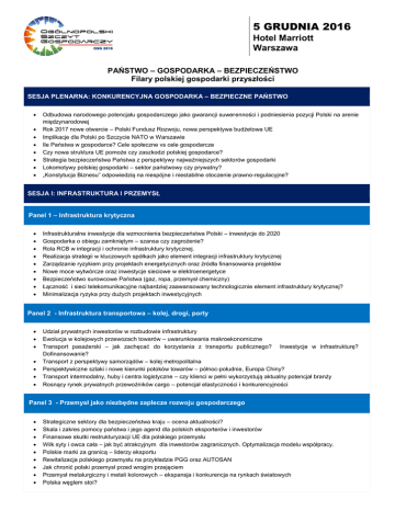 5 GRUDNIA 2016 Hotel Marriott Warszawa PAŃSTWO – GOSPODARKA – BEZPIECZEŃSTWO Filary polskiej gospodarki przyszłości SESJA PLENARNA: KONKURENCYJNA GOSPODARKA – BEZPIECZNE PAŃSTWO Odbudowa narodowego potencjału gospodarczego jako gwarancji suwerenności i podniesienia pozycji Polski na arenie międzynarodowej Rok 2017 nowe otwarcie – Polski Fundusz Rozwoju, nowa perspektywa budżetowa UE Implikacje dla Polski po Szczycie NATO w Warszawie Ile Państwa w gospodarce? Cele społeczne vs cele gospodarcze Czy nowa struktura UE pomoże czy zaszkodzi polskiej gospodarce? Strategia bezpieczeństwa Państwa z perspektywy najważniejszych sektorów gospodarki Lokomotywy polskiej gospodarki – sektor państwowy czy prywatny? „Konstytucja Biznesu” odpowiedzią na niespójne i niestabilne otoczenie prawno-regulacyjne? SESJA I: INFRASTRUKTURA I PRZEMYSŁ Panel 1 – Infrastruktura krytyczna Infrastrukturalne inwestycje dla wzmocnienia bezpieczeństwa Polski – inwestycje do 2020 Gospodarka o obiegu zamkniętym – szansa czy zagrożenie? Rola RCB w integracji i ochronie infrastruktury krytycznej. Realizacja strategii w kluczowych spółkach jako element integracji infrastruktury krytycznej Zarządzanie ryzykiem przy projektach energetycznych oraz źródła finansowania projektów Nowe moce wytwórcze oraz inwestycje sieciowe w elektroenergetyce Bezpieczeństwo surowcowe Państwa (gaz, ropa, przemysł chemiczny) Łączność i sieci telekomunikacyjne najbardziej zaawansowany technologicznie element infrastruktury krytycznej? Minimalizacja ryzyka przy dużych projektach inwestycyjnych Panel 2 - Infrastruktura transportowa – kolej, drogi, porty Udział prywatnych inwestorów w rozbudowie infrastruktury Ewolucja w kolejowych przewozach towarów – uwarunkowania makroekonomiczne Transport pasażerski – jak zachęcać do korzystania z transportu publicznego? Inwestycje w infrastrukturę? Dofinansowanie? Transport z perspektywy samorządów – kolej metropolitalna Perspektywiczne szlaki i nowe kierunki potoków towarów – północ-południe, Europa Chiny? Transport intermodalny, huby i centra logistyczne – czy klienci w pełni wykorzystują aktualny potencjał branży Rosnący rynek prywatnych przewoźników cargo – potencjał elastyczności i konkurencyjności Panel 3 - Przemysł jako niezbędne zaplecze rozwoju gospodarczego Strategiczne sektory dla bezpieczeństwa kraju – ocena aktualności? Skala i zakres pomocy państwa i jego agend dla polskich eksporterów i inwestorów Finansowe skutki restrukturyzacji UE dla polskiego przemysłu Wilk syty i owca cała – jak być atrakcyjnym dla inwestorów zagranicznych. Optymalizacja modelu współpracy. Polskie marki za granicą – liderzy eksportu Rewitalizacja polskiego przemysłu na przykładzie PGG oraz AUTOSAN Jak chronić polski przemysł przed wrogim przejęciem Przemysł metalurgiczny i metali kolorowych – ekspansja i konkurencja na rynkach światowych Polska węglem stoi? Panel 4 – Infrastruktura samorządowa: Smart city Efektywność energetyczna; Transport publiczny: inteligentne systemy zarządzania ruchem Inteligentny dom; Paliwa przyszłości; Przyjazna administracja: e-administracja na szczeblu samorządowym Rola bezpieczeństwa i polityka prywatności w projektach smart city Smart lighting Technologie IT w projektach infrastrukturalnych SESJA II: INNOWACYJNE FIRMY I ROZWIĄZANIA Panel 1 – Najlepsze praktyki – Liderzy zmian Ewolucja czy rewolucja? Kapitał na badania i rozwój – od pomysłu do produktu Budowanie Marki – inwestycje w świadomość klienta Świat to za mało- jak przekraczać granice w poszukiwaniu rynków w dobie Internetu? Informatyzacja to nie wszystko: Produkty 21: forma a nie trwałość? - dlaczego klient tęskni za dawną jakością i prostotą urządzeń? Klient na rynku nowoczesnych technologii. Program Witelo Panel 2 - Prezentacje innowacyjnych technologii i rozwiązań w przemyśle – case studies Panel 3 – Innowacyjność w projektach naukowo-przemysłowych Rola samorządów i szkolnictwa wyższego Komercjalizacja prac B+R Od pomysłu do produktu – bariery w rozwoju projektów B+R: kontrole projektów, podatki, przepisy SESJA III: BEZPIECZEŃSTWO NARODOWE I GOSPODARCZE Panel 1 – AGROSEC: Bezpieczeństwo sektora rolno-spożywczego Branża rolno-spożywcza 27 lat po przemianach ustrojowych w Polsce – wykorzystane szanse, niespełnione nadzieje. Wpływ członkostwa Polski w Unii Europejskiej na kondycję branży rolno-spożywczej – czy przyszłość branży zależy nadal od rynku unijnego? o Unia Europejska to już za mało – konieczność dywersyfikacji eksportu. o Odradzający się protekcjonizm w UE, zagrożenie dla polskiej ekspansji na rynkach wspólnotowych. Polski eksport rolno-spożywczy od wprowadzenia embarga przez Rosję. Polskie firmy w roli liderów w Europie Środkowo – Wschodniej – na ile polskie spółki są stanie konsolidować rynek w regionie, a na ile skazane na połknięcie przez globalne koncerny. Nowe regulacje a przyszłość branży – podatek obrotowy, eliminacja nieuczciwych praktyk przez sieci Czy sektor rolno-spożywczy potrzebuje większego wsparcia rządu – znacznie branży dla realizacji Planu na rzecz Odpowiedzialnego Rozwoju. Niebezpieczeństwo anonimowości polskiej żywności zagranicą – promocja polskiej marki. Przemysł mięsny – drób czy wieprzowina, redefinicja priorytetów o Porozumienie TTiP – co to oznacza dla przyszłości branży – szanse i zagrożenia Panel 2 – ECONSEC – Bezpieczeństwo narodowe Kształtowanie polityki bezpieczeństwa państwa w aktualnej sytuacji międzynarodowej Czy Polska jest krajem bezpiecznym – priorytetowe obszary bezpieczeństwa narodowego Polityka unijna a polska racja stanu, ocena wpływu na bezpieczeństwo ze względu na członkostwo w UE Polityka międzynarodowa, europejska i atlantycka – Jak skutecznie lobbować aby zapewnić bezpieczeństwo kraju Aktywność Rządu i 