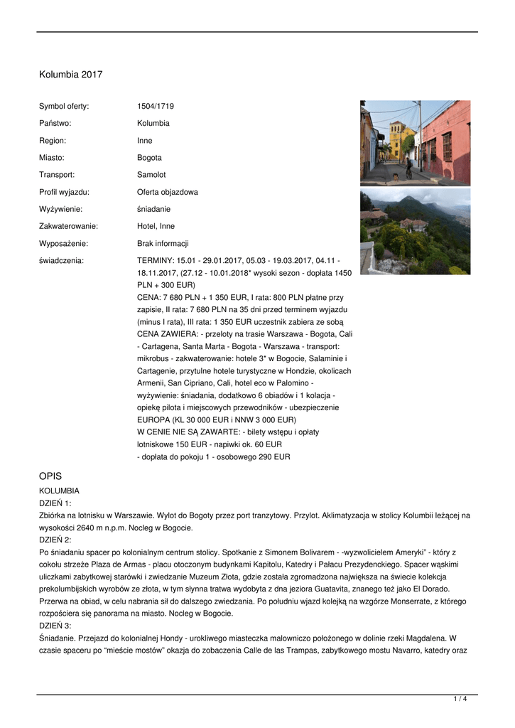 Kolumbia 2017 Symbol oferty: 1504/1719 Państwo: Kolumbia Region: Inne Miasto: Bogota Transport: Samolot Profil wyjazdu: Oferta objazdowa Wyżywienie: śniadanie Zakwaterowanie: Hotel, Inne Wyposażenie: Brak informacji świadczenia: TERMINY: 15.01 - 29.01.2017, 05.03 - 19.03.2017, 04.11 - 18.11.2017, (27.12 - 10.01.2018* wysoki sezon - dopłata 1450 PLN + 300 EUR) CENA: 7 680 PLN + 1 350 EUR, I rata: 800 PLN płatne przy zapisie, II rata: 7 680 PLN na 35 dni przed terminem wyjazdu (minus I rata), III rata: 1 350 EUR uczestnik zabiera ze sobą CENA ZAWIERA: - przeloty na trasie Warszawa - Bogota, Cali - Cartagena, Santa Marta - Bogota - Warszawa - transport: mikrobus - zakwaterowanie: hotele 3* w Bogocie, Salaminie i Cartagenie, przytulne hotele turystyczne w Hondzie, okolicach Armenii, San Cipriano, Cali, hotel eco w Palomino - wyżywienie: śniadania, dodatkowo 6 obiadów i 1 kolacja - opiekę pilota i miejscowych przewodników - ubezpieczenie EUROPA (KL 30 000 EUR i NNW 3 000 EUR) W CENIE NIE SĄ ZAWARTE: - bilety wstępu i opłaty lotniskowe 150 EUR - napiwki ok. 60 EUR - dopłata do pokoju 1 - osobowego 290 EUR OPIS KOLUMBIA DZIEŃ 1: Zbiórka na lotnisku w Warszawie. Wylot do Bogoty przez port tranzytowy. Przylot. Aklimatyzacja w stolicy Kolumbii leżącej na wysokości 2640 m n.p.m. Nocleg w Bogocie. DZIEŃ 2: Po śniadaniu spacer po kolonialnym centrum stolicy. Spotkanie z Simonem Bolivarem - -wyzwolicielem Ameryki” - który z cokołu strzeże Plaza de Armas - placu otoczonym budynkami Kapitolu, Katedry i Pałacu Prezydenckiego. Spacer wąskimi uliczkami zabytkowej starówki i zwiedzanie Muzeum Złota, gdzie została zgromadzona największa na świecie kolekcja prekolumbijskich wyrobów ze złota, w tym słynna tratwa wydobyta z dna jeziora Guatavita, znanego też jako El Dorado. Przerwa na obiad, w celu nabrania sił do dalszego zwiedzania. Po południu wjazd kolejką na wzgórze Monserrate, z którego rozpościera się panorama na miasto. Nocleg w Bogocie. DZIEŃ 3: Śniadanie. Przejazd do kolonialnej Hondy - urokliwego miasteczka malowniczo położonego w dolinie rzeki Magdalena. W czasie spaceru po “mieście mostów” okazja do zobaczenia Calle de las Trampas, zabytkowego mostu Navarro, katedry oraz 1/4 niespiesznego życia mieszkańców kolumbijskiej prowincji. Nocleg. DZIEŃ 4: Po śniadaniu przejazd malowniczą drogą przez Andy do Salaminy. Po drodze postój w Manizales - górskiej miejscowości, stolicy departamentu Caldas, gdzie przy ładnej pogodzie widoczny jest górujący nad miastem szczyt aktywnego wulkanu Nevado del Ruiz. Salamina, będąca częścią wpisanego na listę UNESCO krajobrazu regionu “trójkąta kawowego” - słynie z urokliwych zakątków, brukowanych uliczek i białych, typowych dla regionu domów adobe. Zakwaterowanie w kolonialnym hotelu, doskonale oddającym klimat minionej epoki. DZIEŃ 5: Śniadanie. Całodzienna wycieczka do doliny Samaria. Po dotarciu do miasteczka San Felix, zmiana transportu na lokalne jeepy Willy’s (powszechnie używane w górzystej okolicy) i przejazd do doliny znanej z najwyższych na świecie palm woskowych. Trekkingu malowniczą doliną (2-3 godziny). Po obiedzie powrót do Salaminy. Nocleg w Salaminie. DZIEŃ 6: Po śniadaniu przejazd do hacjendy w okolicach Armenii, wśród zielonych wzgórz i plantacji kawy. Wizyta na plantacji kawy. Zapoznanie się z procesem od ziarna do filiżanki. Dla chętnych możliwość degustacji kolumbijskiego specjału. Nocleg w hacjendzie. DZIEŃ 7: Śniadanie. Przejazd do tropikalnego San Cipriano. Następnie szereg atrakcji - przeprawa wiszącym mostem nad rzeką Dagua (zamienioną w kopalnię złota) - przejazd drezyną po torach przez las deszczowy, dla chętnych możliwość zjedzenia na obiad wyjątkowej zupy rybnej, ponadto spacery wśród lasu deszczowego, kąpiele w szmaragdowej rzece. Nocleg w skromnych warunkach, w samym centrum lasu deszczowego, wśród koncertu żab i cykad. DZIEŃ 8: Po śniadaniu poranne kąpiele w rzece i wędrówka korytem kilku strumieni do zagubionego wśród gąszczu, malowniczo położonego wodospadu. Po obiedzie powrót do Cali. Wieczorna lekcja salsy, następnie kontynuacja imprezy i możliwość sprawdzenia swoich nowo nabytych umiejętności. DZIEŃ 9: Śniadanie. Przejazd na lotnisko i przelot do Cartageny. Założona w 1533 Cartagena de Indias, była przez długi czas jednym z najważniejszych portów hiszpańskiej Ameryki, przez który w drodze do Hiszpanii przechodziło łupione na kontynencie złoto. Będące celem pirackich ataków miasto doczekało się imponujących, do dziś świetnie zachowanych fortyfikacji. Zwiedzanie najwspanialszej kolonialnej starówki Ameryki. Spacer przez zabytkowe dzielnice - San Pedro z katedrą i licznymi pałacami w stylu andaluzyjskim, San Diego zamieszkiwane niegdyś przez kupców i klasę średnią. Wieczorem - spacer poza mury miejskie do dzielnicy Getsemani. Dla chętnych późniejsze wyjście do baru i dalsze trenowanie salsy. DZIEŃ 10: Wycieczka do rybackiej wioski La Boquilla. Obserwowanie życia mieszkańców karaibskiego wybrzeża Kolumbii poza piękną, turystyczną Cartgeną. Spacer uliczkami wioski i zwiedzanie fundacji La Vecina, która pomaga dzieciom z okolicy. Obiad przy plaży. Po południu powrót do Cartageny. Dla chętnych - wieczorny objazd miasta “chivą”. Chiva to kolorowy autobus powstały z amerykańskiego autobusu szkolnego, takie oryginalne pojazdy można nadal spotkać na kolumbijskiej prowincji. Nocleg. DZIEŃ 11: Przejazd wzdłuż wybrzeża karaibskiego do Palomino. Przystanek na kolację w okolicach kolonialnej Santa Marta. Zakwaterowanie w hotelu eco, w Palomino. Nocleg. DZIEŃ 12: Odpoczynek nad Morzem Karaibskim. Spacery po białym piasku i porównywanie charakteru obu poznanych wybrzeży. Dla chętnych - fakultatywna wycieczka do Parku Narodowego Tayrona. Nocleg w hotelu eco w Palomino. DZIEŃ 13: Ciąg dalszy odpoczynku. Organizowanie wspomnień z podróży 
