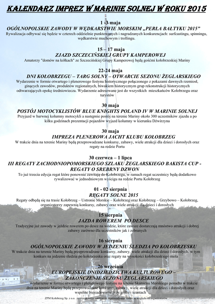 Kalendarz Imprez w Marinie Solnej w roku 2015 1 -3 maja OGÓLNOPOLSKIE ZAWODY W WĘDKARSTWIE MORSKIM „PERŁA BAŁTYKU 2015” Rywalizacja odbywać się będzie w czterech oddzielnie punktowanych i nagradzanych konkurencjach: surfcastingu, spinningu, wędkarstwie muchowym i trollingu. 15 – 17 maja ZJAZD SZCZECIŃSKIEJ GRUPY KAMPEROWEJ Amatorzy "domów na kółkach" ze Szczecińskiej Grupy Kamperowej będą gośćmi kołobrzeskiej Mariny 22-24 maja DNI KOŁOBRZEGU – TARG SOLNY – OTWARCIE SEZONU ŻEGLARSKIEGO Wydarzenie w formie otwartego i plenerowego festynu historycznego połączonego z pokazami dawnych rzemiosł, ginących zawodów, produktów regionalnych, biwakiem historycznym grup rekonstrukcji historycznych odtwarzających epokę średniowiecza. Wydarzenie adresowane jest do wszystkich mieszkańców Kołobrzegu oraz turystów 30 maja POSTÓJ MOTOCYKLISTÓW BLUE KNIGHTS POLAND IV W MARINIE SOLNEJ Przyjazd w barwnej kolumny motocykli a następnie postój na terenie Mariny około 300 uczestników zjazdu a po kilku godzinach prezentacji pojazdów wyjazd kolumny w kierunku Dźwirzyna 30 maja IMPREZA PLENEROWA JACHT KLUBU KOŁOBRZEG W trakcie dnia na terenie Mariny będą przeprowadzane konkursy, zabawy, wiele atrakcji dla dzieci i dorosłych oraz regaty na redzie Portu 30 czerwca – 1 lipca III REGATY ZACHODNIOPOMORSKIEGO SZLAKU ŻEGLARSKIEGO BAKISTA CUP REGATY O SREBRNY DZWON To już trzecia edycja regat które ponownie zawitają do Kołobrzegu, w ramach regat uczestnicy będą dodatkowo rywalizować w jednodniowym wyścigu na redzie Portu Kołobrzeg 01 - 02 sierpnia REGATY SOLNE 2015 Regaty odbędą się na trasie Kołobrzeg – Ustronie Morskie – Kołobrzeg oraz Kołobrzeg – Grzybowo – Kołobrzeg, organizatorzy zapewnią konkursy, zabawy oraz wiele atrakcji dla dzieci i dorosłych 15 sierpnia JAZDA ROWEREM PO DESCE Tradycyjne już zawody w jeździe rowerem po desce na wodzie, które zawsze dostarczają mnóstwo atrakcji i dobrej zabawy zarówno dla uczestników jak i zebranych 16 sierpnia OGÓLNOPOLSKIE ZAWODY W JEDZENIU ŚLEDZIA PO KOŁOBRZESKU W trakcie dnia na terenie Mariny będą przeprowadzane konkursy, zabawy, wiele atrakcji dla dzieci i dorosłych, w tym konkurs na jedzenie śledzia po kołobrzesku oraz regaty na wysokości kołobrzeskiego mola . 26 września EUROPEJSKIE DNIDZIEDZICTWA KULTUROWEGO – ZAKOŃCZENIE SEZONU ŻEGLARSKIEGO Wydarzenie w formie otwartego i plenerowego festynu na terenie Skansenu Morskiego ponadto w trakcie dnia na terenie Mariny będą przeprowadzane konkursy, zabawy, wiele atrakcji dla dzieci i dorosłych oraz wspólne biesiadowanie przy grillu i szantach ZPM Kołobrzeg Sp. z o.o. zastrzega sobie możliwość wprowadzania zmian ze względu na organizatorów imprez.