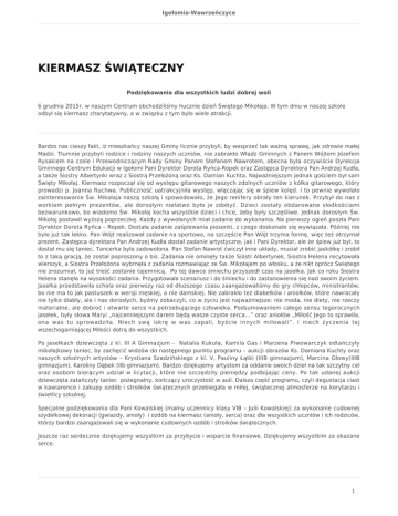 Igołomia-Wawrzeńczyce KIERMASZ ŚWIĄTECZNY Podziękowania dla wszystkich ludzi dobrej woli 6 grudnia 2015r. w naszym Centrum obchodziliśmy hucznie dzień Świętego Mikołaja. W tym dniu w naszej szkole odbył się kiermasz charytatywny, a w związku z tym było wiele atrakcji. Bardzo nas cieszy fakt, iż mieszkańcy naszej Gminy licznie przybyli, by wesprzeć tak ważną sprawę, jak zdrowie małej Madzi. Tłumnie przybyli rodzice i rodziny naszych uczniów, nie zabrakło Władz Gminnych z Panem Wójtem Józefem Rysakiem na czele i Przewodniczącym Rady Gminy Panem Stefanem Nawrotem, obecna była oczywiście Dyrekcja Gminnego Centrum Edukacji w Igołomi Pani Dyrektor Dorota Ryńca-Ropek oraz Zastępca Dyrektora Pan Andrzej Kudła, a także Siostry Albertynki wraz z Siostrą Przełożoną oraz Ks. Damian Kuchta. Najważniejszym jednak gościem był sam Święty Mikołaj. Kiermasz rozpoczął się od występu gitarowego naszych zdolnych uczniów z kółka gitarowego, który prowadzi p. Joanna Ruchwa. Publiczność uatrakcyjniła występ, włączając się w śpiew kolęd. I to pewnie wywołało zainteresowanie Św. Mikołaja naszą szkołą i spowodowało, że Jego renifery obrały ten kierunek. Przybył do nas z workiem pełnym prezentów, ale dorosłym niełatwo było je zdobyć. Dzieci zostały obdarowane słodkościami bezwarunkowo, bo wiadomo Św. Mikołaj kocha wszystkie dzieci i chce, żeby były szczęśliwe. Jednak dorosłym Św. Mikołaj postawił wyższą poprzeczkę. Każdy z wywołanych miał zadanie do wykonania. Na pierwszy ogień poszła Pani Dyrektor Dorota Ryńca – Ropek. Dostała zadanie zaśpiewania piosenki, z czego doskonale się wywiązała. Później nie było już tak lekko. Pan Wójt realizował zadanie na sportowo, na szczęście Pan Wójt trzyma formę, więc też otrzymał prezent. Zastępca dyrektora Pan Andrzej Kudła dostał zadanie artystyczne, jak i Pani Dyrektor, ale że śpiew już był, to dostał mu się taniec. Tancerka była zadowolona. Pan Stefan Nawrot ćwiczył inne układy, musiał zrobić jaskółkę i zrobił to z taką gracją, że został poproszony o bis. Zadania nie ominęły także Sióstr Albertynek, Siostra Helena recytowała wierszyk, a Siostra Przełożona wybrnęła z zadania rozmawiając ze Św. Mikołajem po włosku, a że nikt oprócz Świętego nie zrozumiał, to już treść zostanie tajemnicą. Po tej dawce śmiechu przyszedł czas na jasełka. Jak co roku Siostra Helena stanęła na wysokości zadania. Przygotowała scenariusz i do śmiechu i do zastanowienia się nad swoim życiem. Jasełka przedstawiła schola oraz pierwszy raz od dłuższego czasu zaangażowaliśmy do gry chłopców, ministrantów, bo nie ma to jak pastuszek w wersji męskiej, a nie damskiej. Nie zabrakło też diabełków i aniołków, które nawracały nie tylko diabły, ale i nas dorosłych, byśmy zobaczyli, co w życiu jest najważniejsze: nie moda, nie diety, nie rzeczy materialne, ale dobroć i otwarte serce na potrzebującego człowieka. Podsumowaniem całego sensu tegorocznych jasełek, były słowa Maryi „najcenniejszym darem będą wasze czyste serca…” oraz aniołów „Miłość Jego to sprawiła, ona was tu sprowadziła. Niech swą iskrę w was zapali, byście innych miłowali”. I niech życzenia tej wszechogarniającej Miłości dotrą do wszystkich. Po jasełkach dziewczęta z kl. III A Gimnazjum - Natalia Kukuła, Kamila Gas i Marzena Piwowarczyk odtańczyły mikołajkowy taniec, by zachęcić widzów do następnego punktu programu – aukcji obrazów Ks. Damiana Kuchty oraz naszych szkolnych artystów – Krystiana Szadzińskiego z kl. V, Pauliny Łątki (IIIB gimnazjum), Marcina Głowy(IIIB gimnazjum), Karoliny Dąbek (IIb gimnazjum). Bardzo dziękujemy artystom za oddanie swoich dzieł na tak szczytny cel oraz osobom biorącym udział w licytacji, które nie szczędziły pieniędzy podbijając ceny. Po tak udanej aukcji dziewczęta zatańczyły taniec pożegnalny, kończący uroczystość w auli. Dalsza część programu, czyli degustacja ciast w kawiarence i zakupy ozdób i stroików świątecznych przebiegała w miłej, świątecznej atmosferze na korytarzu i świetlicy szkolnej. Specjalne podziękowania dla Pani Kowalskiej (mamy uczennicy klasy VIB – Julii Kowalskiej) za wykonanie cudownej szydełkowej dekoracji (gwiazdy, anioły) i ozdób na kiermasz (anioły, serca) oraz dla wszystkich uczniów i ich rodziców, którzy bardzo zaangażowali się w wykonanie cudownych ozdób i stroików świątecznych. Jeszcze raz serdecznie dziękujemy wszystkim za przybycie i wsparcie finansowe. Dziękujemy wszystkim za okazane serce. 1 Igołomia-Wawrzeńczyce „Człowiek jest wielki nie przez to, co posiada, lecz przez to, kim jest; nie przez to, co ma, lecz przez to, czym dzieli się z innymi”. Jan Paweł II Joanna Ruchwa 2