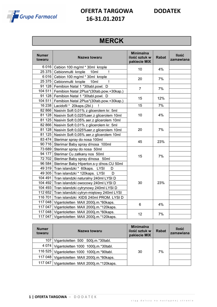 OFERTA TARGOWA 16-31.01.2017 DODATEK MERCK Numer towaru 6 016 25 375 6 016 25 375 91 128 104 511 91 128 104 511 16 238 82 866 81 128 81 125 82 866 81 128 81 125 83 474 90 716 73 689 94 177 72 702 96 584 49 319 49 305 104 491 104 492 104 493 112 652 116 701 117 048 117 047 117 048 117 047 Numer towaru Nazwa towaru Minimalna ilość sztuk w pakiecie MIX Rabat 10 4% 20 7% 7 7% 15 12% 15 7% 10 4% 20 7% 45 23% 15 7% 30 23% 6 4% 12 7% Minimalna ilość sztuk w pakiecie MIX Rabat 30 7% Cebion 100 mg/ml * 30ml krople Cebionmulti krople 10ml ! Cebion 100 mg/ml * 30ml krople Cebionmulti krople 10ml ! Femibion Natal 1 *30tabl.powl. D Femibion Natal 2Plus*(30tab.pow.+30kap.) Femibion Natal 1 *30tabl.powl. D Femibion Natal 2Plus*(30tab.pow.+30kap.) Lacidofil * 20kaps.(2bl.) ! Nasivin Soft 0,01% z glicerolem kr. 5ml Nasivin Soft 0,025%aer.z glicerolem 10ml Nasivin Soft 0,05% aer.z glicerolem 10ml Nasivin Soft 0,01% z glicerolem kr. 5ml Nasivin Soft 0,025%aer.z glicerolem 10ml Nasivin Soft 0,05% aer.z glicerolem 10ml Sterimar spray do nosa 100ml Sterimar Baby spray d/nosa 100ml Sterimar spray do nosa 50ml Sterimar Cu zatkany nos 50ml Sterimar Baby spray d/nosa 50ml Sterimar Baby Hiperton.s-y d/nos.CU 50ml Tran islandzki * 60kaps. LYSI D Tran islandzki * 120kaps. LYSI D Tran islandzki naturalny 240ml LYSI D Tran islandzki owocowy 240ml LYSI D Tran islandzki cytrynowy 240ml LYSI D Tran islandzki cytryn-miętowy 240ml LYSI Tran islandzki KIDS 240ml PROM. LYSI D Vigantoletten MAX 2000j.m.*60kaps. Vigantoletten MAX 2000j.m.*120kaps. Vigantoletten MAX 2000j.m.*60kaps. Vigantoletten MAX 2000j.m.*120kaps. Nazwa towaru 107 Vigantoletten 500 500j.m.*30tabl. 4 074 Vigantoletten 1000 1000j.m.*30tabl. 116 525 Vigantoletten 1000 1000j.m.*90tabl. 117 048 Vigantoletten MAX 2000j.m.*60kaps. Ilość zamawiana Ilość zamawiana 117 047 Vigantoletten MAX 2000j.m.*120kaps. 1 | OFERTA TARGOWA – D O D A T E K c i ą g d a l s z y n a n a s t ę p n e j s t r o n i e