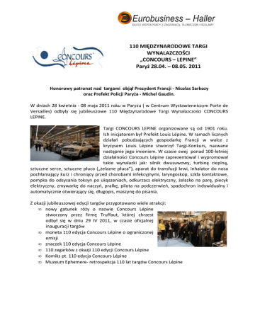 110 MIĘDZYNARODOWE TARGI WYNALAZCZOŚCI „CONCOURS – LEPINE” Paryż 28.04. – 08.05. 2011 Honorowy patronat nad targami objął Prezydent Francji - Nicolas Sarkozy oraz Prefekt Policji Paryża - Michel Gaudin. W dniach 28 kwietnia - 08 maja 2011 roku w Paryżu ( w Centrum Wystawienniczym Porte de Versailles) odbyły się jubileuszowe 110 Międzynarodowe Targi Wynalazczości CONCOURS LEPINE. Targi CONCOURS LEPINE organizowane są od 1901 roku. Ich inicjatorem był Prefekt Louis Lépine. W ramach licznych działań pobudzających gospodarkę Francji w walce z kryzysem Louis Lépine stworzył Targi-Konkurs, nazwane następnie jego imieniem. W czasie swej ponad 100-letniej działalności Concours Lépine zaprezentował i wypromował takie wynalazki jak: silnik dwusuwowy, turbinę cieplną, sztuczne serce, sztuczne płuco („żelazne płuca”), aparat do transfuzji krwi, inhalator do nosa pochłaniający kurz i chroniący przed chorobami infekcyjnymi, laryngoskop, szkła kontaktowe, pompka do odsysania toksyn po ukąszeniach, odkurzacz elektryczny, żelazko na parę, piecyk elektryczny, zmywarkę do naczyń, pralkę, pilota na podczerwień, spadochron indywidualny i automatycznie otwierający się, długopis, maszynę do pisania. Z okazji jubileuszowej edycji targów przygotowano wiele atrakcji: • nowy gatunek róży o nazwie Concours Lépine stworzony przez firmę Truffaut, której chrzest odbył się w dniu 29 IV 2011, w czasie oficjalnej inauguracji targów • moneta 110 edycja Concours Lépine o ograniczonej emisji • znaczek 110 edycja Concours Lépine • 110 zegarków z okazji 110 edycji Concours Lépine • Komiks pt. 110 edycja Concours Lépine • Muzeum Ephemere- retrospekcja 110 lat targów Concours Lépine Targi Concours Lépine 2011 oraz pawilon polski odwiedzili przedstawiciele Wydziału Promocji Handlu i Inwestycji Ambasady RP we Francji: Pan Andrzej Szteliga - Radca-Minister, Szef WPHI oraz Pani Katarzyna Krajewska- Pierwszy Sekretarz Concours Lépine 2011 – dane liczbowe ponad 500 wynalazków 14 krajów uczestniczących 28 wynalazków z Polski o 1000 m2 większa powierzchnia wystawiennicza niż w 2010 r. 12 branż tematycznych 49 jurorów Wynalazki prezentowane były na stoiskach indywidualnych oraz w pawilonach narodowych i branżowych, m.in. podium energii alternatywnej, prezentujące m.in. nowości koncernów Peugeot i Ford, American Cars City podium biotechnologii podium technologii medycznych podium Prefektury Policji ( Francja ) pawilony narodowe, a wśród nich polski pawilon wielobranżowy sektor: Kobieta Wynalazca stoiska indywidualne wystawców z Francji i z zagranicy stoiska: Mennicy Paryskiej, Grupy SEBi inne Targi Concours Lépine dzięki swej renomie oraz ponad 100-letniej tradycji są bardzo nagłośnione w mediach i przyciągają szerokie rzesze zwiedzających, ludzi biznesu, producentów oraz inwestorów. Wynalazki zgłoszone do konkursu ocenione zostały przez 49 jurorów, ekspertów reprezentujących wszystkie branże i dziedziny prezentowane na targach. Wszystkie polskie wynalazki zgłoszone do konkursu CONCOURS LEPINE 2011 zostały przyjęte do oceny przez przewodniczącego jury. W ocenie rozwiązań jury Targów wzięło pod uwagę poziom nowatorstwa, poziom techniki i technologii, zapotrzebowanie społeczne, możliwości wdrażania i sprzedaży, potwierdzenie skuteczności rozwiązań stosownymi wynikami badań oraz sposób prezentacji i efektywność promocyjno-marketingową. Polskie wynalazki prezentowane na Targach w najwyższym stopniu spełniają te kryteria. Uroczyste ogłoszenie wyników i wręczenie medali odbyło się w dniu 7 maja 2011. W czasie uroczystości przewodniczący jury podkreślił bardzo wysoki poziom polskich wynalazków, profesjonalne przygotowanie ekspozycji i prezentacji wynalazków przed jury oraz profesjonalne przygotowanie pisemnych materiałów informacyjnych o wynalazkach dla jurorów oceniających wynalazki. W uroczystości wzięło udział wielu gości honorowych reprezentujących m.in.: Prezydenta Francji oraz Ministrów Nauki, Przemysłu, Prefekta Policji, Międzynarodową Organizację Własności Intelektualnej OMP. Ze strony Ambasady RP w Paryżu obecna była Pani Katarzyna Krajewska, Pierwszy Sekretarz w Wydziale Promocji Handlu i Inwestycji. Na ponad 500 prezentowanych wynalazków jury przyznało 247 medali. Wszystkie polskie wynalazki prezentowane na targach CONCOURS LEPINE 2011 zostały nagrodzone otrzymując następujące medale: 6 medali złotych (na 33 wszystkich przyznanych) 8 medali srebrnych (na 70 przyznanych) 8 medali brązowych (na 88 przyznanych) 6 medali Stowarzyszenia Francuskich Wynalazców i Producentów AIFF (na 56 przyznanych)