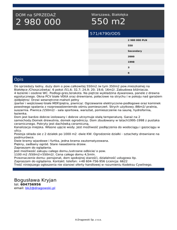 DOM na SPRZEDAŻ 2 980 000 Warszawa, Białołęka 550 m2 571/4790/ODS 2 980 000 PLN 550 Secondary 2000 1998 3 6 Opis Do sprzedaży ładny, duży dom o pow.całkowitej 550m2 /w tym 350m2 pow.mieszkalnej na Białołęce /Choszczówka/. 6 pokoi /51,6; 32,7; 24,9; 20; 19,6; 16m2/. Zabudowa bliźniacza. 4 łazienki i osobne WC. Podłogi-gres,terakota. Na piętrze wykładzina dywanowa, panele z drewna egzotycznego. Okna PCV białe VEKA oraz drewniane, połaciowe na strychu i w pokoju nad garażem /półpiętro/. Drzwi wewnętrzne-mahoń pełny /parter i wejściowe/-białe MDF/piętra, piwnica/. Ogrzewanie elektryczxne-podłogowe oraz kominek powolnego spalania z rozprowadzeniemdo ośmiu pomieszczeń. Strych użytkowy /86m2/ pralnia, suszarnia. Piwnica /150m2/ - sala sportowa, warsztat, pomieszczenie na saunę, hydrofornia, łazienka. Dom jest bardzo dobrze izolowany i dobrze utrzymuje stałą temperaturę. Garaż na 2 samochody.Domek drewutnia, domek ogrodniczy. Dom zbudowany w latach1995-1998 z pustaka ceramicznego. Pokryty jest dachówką ceramiczną. Kanalizacja miejska. Własne ujęcie wody. Jest możliwość podłączenia do wodociągu i gazociągu w ulicy. Posesja składa sie z 2 działek po 1000 m2 -dwie KW. Ogrodzenie działki - sztachety drewniane na podmurówce. Dwie bramy wjazdowe i furtka, jedna brama zautomatyzowana. Piękny, zadbany ogród. Stare nasadzenia drzew. Zapraszam do oglądania. Jest możliwość zakupu całego domu./ustrzane odbicie/ o pow. 1100 m2 /550m2+550m2/. Cena całego domu 4,5mln. Przeznaczenie domu: pensjonat, dom spokojnej starośći, działalność usługowa itp. Zapraszam do oglądania. Kontakt: telefon: +48 604-756-956 Licencja: 6622 Treść niniejszego ogłoszenia nie stanowi oferty handlowej w rozumieniu Kodeksu Cywilnego. Bogusława Kryjan tel. 604756956 email: [email protected] A.Drągowski Sp. z o.o. Powered by TCPDF (www.tcpdf.org)