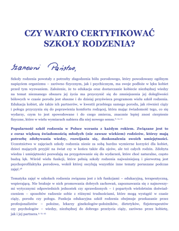 CZY WARTO CERTYFIKOWAĆ SZKOŁY RODZENIA? Szkoły rodzenia powstały z potrzeby złagodzenia bólu porodowego, który powodowany ogólnym napięciem organizmu – zarówno fizycznym, jak i psychicznym, ma swoje podłoże w lęku kobiet przed tym wyzwaniem. Założenie, że to edukacja oraz dostarczanie kobiecie niezbędnej wiedzy na temat nieznanego obszaru jej życia ma przyczynić się do zmniejszenia jej dolegliwości bólowych w czasie porodu jest słuszne i do dzisiaj przyświeca programom wielu szkół rodzenia. Edukacja kobiet, ale także ich partnerów, w kwestii przebiegu samego porodu, jak również ciąży i połogu przyczynia się do poprawienia komfortu rodzącej, która mając świadomość tego, co się wydarzy, czym to jest spowodowane i do czego zmierza, znacznie lepiej znosi cierpienie fizyczne, które w wielu wymiarach nabiera dla niej nowego sensu.6, 14, 21 Popularność szkół rodzenia w Polsce wzrasta z każdym rokiem. Związane jest to z coraz większą świadomością młodych (nie zawsze wiekiem) rodziców, którzy mają potrzebę zdobywania wiedzy, rozwijania się, doskonalenia swoich umiejętności. Uczestnictwo w zajęciach szkoły rodzenia niesie za sobą bardzo wymierne korzyści dla kobiet, dzieci mających przyjść na świat czy w końcu także dla ojców, ale też całych rodzin. Zdobyta wiedza i umiejętności pozwalają na przygotowanie się do wydarzeń, które choć naturalne, często budzą lęk. Wśród wielu funkcji, które pełnią szkoły rodzenia najważniejszą i pierwotną jest psychoprofilaktyka porodowa, wokół której oscylują wszystkie inne tematy poruszane podczas zajęć.38 Tematyka zajęć w szkołach rodzenia związana jest z ich funkcjami – edukacyjną, terapeutyczną, wspierającą. Nie brakuje w nich promowania dobrych zachowań, zapoznawania się z najnowszymi wytycznymi odpowiednich jednostek czy sprawdzonych – i popartych wieloletnim doświadczeniem – sposobów radzenie sobie z różnymi trudnościami, które mogą wystąpić w czasie ciąży, porodu czy połogu. Funkcja edukacyjna szkół rodzenia obejmuje przekazanie przez profesjonalistów – położne, lekarzy ginekologów-położników, dietetyków, fizjoterapeutów czy psychologów – wiedzy, niezbędnej do dobrego przeżycia ciąży, zarówno przez kobietę, jak i jej partnera.9, 13, 43 PROGRAM EDUKACJI PRZEDPORODOWEJ Rodzice, którzy chcą uczestniczyć w zajęciach szkół rodzenia mogą wybierać spośród wielu propozycji miejsc, w których są one organizowane. W Polsce szkoły rodzenia funkcjonują jako odrębne instytucje (prywatne) bądź przy jednostkach takich jak przychodnie, szpitale, gabinety prywatne, kluby fitness, czy nawet poradnie małżeńsko-rodzinne lub parafie. Oferują swoim słuchaczom programy zajęć pozwalające na jak najlepsze przygotowanie się w czasie ciąży do porodu, połogu i opieki nad noworodkiem. Ich funkcjonowanie, z jednej strony bardzo standaryzowane, a z drugiej bardzo indywidualne w podejściu do przyszłych rodziców, pozwala na poczucie wyjątkowości czasu oczekiwania na dziecko, ale też na pozbycie się lęków i obaw, które często towarzyszą przyszłym rodzicom. Oferty szkół są na tyle bogate, że każdy może wybrać coś, co będzie mu najbardziej odpowiadało bez obawy o poziom programu podstawowego, gdyż psychoprofilaktyka porodowa realizowana jest w każdej ze szkół.19, 20, 37 Szkoły rodzenia w szczególny sposób prowadzą edukacje na temat przygotowania do samego porodu. Jednak zdobyta wiedza na temat ciąży i porodu w szkołach rodzenia jest tylko częścią tego, co znajduje się w ich ofertach edukacyjnych. Istotną tematyką, która także jest poruszana na zajęciach jest m.in. rozwój dziecka w fazie prenatalnej, zachowania prozdrowotne w okresie ciąży, przygotowanie do pełnienia ról rodzicielskich, karmienia piersią oraz opieki nad noworodkiem. Edukacja przedporodowa ma ogromne znaczenie dla rodziców, a szkoła rodzenia jest źródłem fachowej wiedzy przekazywanej przez specjalistów. Zdobycie tej wiedzy oraz praktycznych umiejętności pozwala jej uczestnikom na zmianę świadomości, zmniejszenie lęków i obaw związanych z ciążą, porodem i połogiem oraz ułatwia aktywne uczestnictwo w porodzie.1 Wykorzystywanie przez rodzącą naturalnych sił organizmu powinno być wspomagane przez różne metody i techniki, których stosowanie pobudza produkcję endorfin zmniejszających ból i ułatwiających przebieg porodu, a które powinny znaleźć się w programie edukacji przedporodowej. Umiejętność stosowania tych metod w odpowiednim czasie pozwala na osiągnięcie celu, jaki zakłada psychoprofilaktyka.5, 37 Badania Piziak37 oraz Spinelli i wsp.45 wykazały, że poziom teoretycznej wiedzy zdobytej w szkołach rodzenia jest wyższy niż umiejętność zastosowania jej w praktyce. Ograniczana ilość zajęć praktycznych, które mają za zadanie wydolnościowo przygotować ciężarne do porodu, agreguje ze spotykaną niechęcią kobiet do uczęszczania na te zajęcia w szkole rodzenia. Skutkiem takich nieprawidłowości jest u ciężarnej brak świadomości, jaki wysiłek czeka ją w trakcie porodu, co w konsekwencji powoduje, że nie jest w stanie się do niego wydolnościowo przygotować. Ponadto wyniki licznych badań wykazują, że uczestniczenie w edukacji przedporodowej wpływa pozytywnie na poziom wiedzy przyszłych rodziców, co przejawia się właściwymi zachowaniami zdrowotnymi w okresie poprzedzającym ciążę, w czasie jej trwania jak również podczas porodu i połogu. Przekazanie tych informacji rodzicom, którzy decydują się na pierwsze dziecko wydaje się szczególnie ważne.6, 32 Badania Piziak37 wykazały także, że kobiety uczestniczące w szkole rodzenia były lepiej przygotowane do przebiegu ciąży i porodu. Uczestniczki szkół rodzenia miały większą wiedzę na temat ciąży i porodu, a to wpłynęło na poprawę ich samopoczucia oraz na to, że c