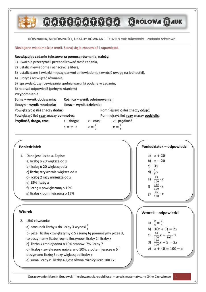 RÓWNANIA, NIERÓWNOŚCI, UKŁADY RÓWNAŃ – TYDZIEŃ VIII: Równania – zadania tekstowe Niezbędne wiadomości z teorii. Staraj się je zrozumied i zapamiętad. Rozwiązując zadanie tekstowe za pomocą równania, należy: 1) uważnie przeczytad i przeanalizowad treśd zadania, 2) ustalid niewiadomą i oznaczyd ją literą, 3) ustalid dane i związki między danymi a niewiadomą (zwrócid uwagę na jednostki), 4) ułożyd i rozwiązad równanie, 5) sprawdzid, czy rozwiązanie spełnia warunki podane w zadaniu, 6) napisad odpowiedź (pełnym zdaniem) Przypomnienie: Suma – wynik dodawania; Różnica – wynik odejmowania; Iloczyn – wynik mnożenia; Iloraz – wynik dzielenia; Powiększyd o ileś znaczy dodać; Pomniejszyd o ileś znaczy odjąć; Powiększyd ileś razy znaczy pomnożyć; Pomniejszyd ileś razy znaczy podzielić; Prędkość, droga, czas: s – droga; t – czas; v – prędkośd Poniedziałek 1. Dana jest liczba x. Zapisz: a) liczbę o 20 większą od x b) liczbę o 20 większą od x c) liczbę trzykrotnie większa od x d) liczbę 2 razy mniejsza od x e) 15% liczby x f) liczbę x powiększoną o 15% g) liczbę x pomniejszoną o 15% Wtorek 2. Ułóż równania: a) stosunek liczby x do liczby 3 wynosi b) jeżeli liczbę x zwiększymy o 5 i sumę tę pomnożymy przez 3, to otrzymamy liczbę równą iloczynowi liczby 2 i liczby x c) liczba x zmniejszona o 10% stanowi 7% liczby 7 d) liczbę x zwiększono najpierw o 10%, a potem jeszcze o 5 i otrzymano liczbę 3 razy większą od liczby x e) suma liczby x i liczby 40 jest równa różnicy liczb 100 i x Poniedziałek – odpowiedzi a) b) c) d) e) f) g) Wtorek – odpowiedzi a) b) c) d) e) Opracowanie: Marcin Gorzawski | krolowanauk.republika.pl – serwis matematyczny G4 w Czerwionce 1 Środa – odpowiedzi Środa 3. Pitagoras powiedział: „Połowa moich uczniów studiuje matematykę, czwarta częśd muzykę, siódma częśd milczy i oprócz tego są tam jeszcze trzy kobiety”. Ilu uczniów było w szkole Pitagorasa? 4. W jednym pomieszczeniu były kury i króliki. Ile było kur, a ile królików, jeżeli razem było 88 nóg i 32 głowy? 5. Na parkingu stało 120 pojazdów (samochody i motocykle). Ile było samochodów, jeśli wiadomo, że wszystkie pojazdy miały łącznie 366 kół (bez zapasowych) ? Czwartek 6. Samochód jedzie z prędkością 60 km/h. W jakim czasie pokona odległośd 100 metrów ? 7. Ojciec i syn mają razem 73 lata. Ojciec jest o 31 lat starszy od syna. Ile lat ma ojciec, a ile syn? 8. Bartek jest o 4 lata młodszy od siostry. Za sześd lat będą mieli razem 34 lata. Ile lat ma każde z nich obecnie? Czwartek – odpowiedzi 6. 6 sekund 7. Ojciec: 52 lata Syn: 21 lat 8. Siostra: 13 lat Bartek: 9 lat Piątek – odpowiedzi Piątek 9. Do licznika ułamka 3. 28 uczniów 4. 12 królików, 20 kur 5. 57 motocykli, 63 samochody dodajemy tyle samo razy liczbę 9, co do mianownika liczbę 2. Ile razy trzeba dodad te liczby, aby z tego ułamka otrzymad jednośd ? 10. Cyfra dziesiątek pewnej liczby dwucyfrowej jest trzy razy większa od cyfry jedności. Jeżeli do tej liczby dodamy liczbę o przestawionych cyfrach, to otrzymamy liczbę 88. Znajdź te liczby. Sobota 11. Ojciec jest 5 razy cięższy od syna i 8 razy cięższy od córki. Razem z matką ważącą 54 kg, cała rodzina waży 160 kg. Ile waży ojciec, syn, a ile córka? 12. Liczbę 3000 podzielono na dwie części tak, że jedna trzecia różnicy obu tych części równa jest jednej czwartej większej części. Na jakie części podzielono tę liczbę? 9. 3 razy 10. 62 oraz 26 Sobota – odpowiedzi 11. Ojciec: 80 kg Syn: 16 kg Córka: 10 kg 12. 2400 oraz 600 Opracowanie: Marcin Gorzawski | krolowanauk.republika.pl – serwis matematyczny G4 w Czerwionce 2