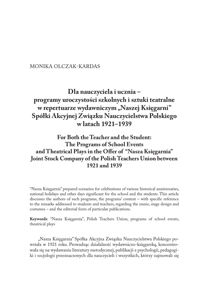 Monika Olczak-Kardas Dla nauczyciela i ucznia – programy uroczystości szkolnych i sztuki teatralne w repertuarze wydawniczym „Naszej Księgarni” Spółki Akcyjnej Związku Nauczycielstwa Polskiego w latach 1921–1939 For Both the Teacher and the Student: The Programs of School Events and Theatrical Plays in the Offer of “Nasza Księgarnia” Joint Stock Company of the Polish Teachers Union between 1921 and 1939 “Nasza Księgarnia” prepared scenarios for celebrations of various historical anniversaries, national holidays and other days significant for the school and the students. This article discusses the authors of such programs, the programs’ content – with specific reference to the remarks addressed to students and teachers, regarding the music, stage design and costumes – and the editorial form of particular publications. Keywords: “Nasza Księgarnia”, Polish Teachers Union, programs of school events, theatrical plays „Nasza Księgarnia” Spółka Akcyjna Związku Nauczycielstwa Polskiego powstała w 1921 roku. Prowadząc działalność wydawniczo-księgarską, koncentrowała się na wydawaniu literatury metodycznej, publikacji z psychologii, pedagogiki i socjologii przeznaczonych dla nauczycieli i wszystkich, którzy zajmowali się Dla nauczyciela i ucznia – programy uroczystości szkolnych… 135 pracą wychowawczą. Oprócz tego repertuar wydawniczy obejmował podręczniki szkolne oraz książki dla dzieci i młodzieży. Pracę wydawniczą spółka postanowiła oprzeć o rodzimych autorów, doświadczonych nauczycieli-praktyków. „Nasza Księgarnia” jako spółka ZNP odpowiadała swoim repertuarem na potrzeby środowiska nauczycielskiego. Wśród wspomnianych typów publikacji, w ofercie wydawniczej pojawiły się materiały, które można było wykorzystać podczas uroczystości szkolnych. Były to programy i utwory sceniczne. Wśród książek dla nauczycieli można wyodrębnić 17 pozycji związanych z organizowaniem uroczystości szkolnych. Stanowiło to 5,23% wszystkich publikacji wydanych dla nauczycieli i 2,53% ogólnej liczby wydawnictw spółki. W przypadku utworów scenicznych przeznaczonych dla dzieci i młodzieży było to 29 pozycji (4,32% wszystkich publikacji wydawnictwa). Sumując obydwie grupy można stwierdzić, że omawiana w artykule tematyka znalazła się jedynie w 6,86% całego repertuaru wydawnictwa. W prasie fachowej zwracano uwagę na dużą liczbę świąt, których uroczyste obchody zalecano organizować w szkołach. Henryk Ładosz podkreślił, że przy takim natłoku świąt i codziennych zajęć w szkole, nie sposób zorganizować uroczystości na wysokim poziomie i zadbać o odpowiednio dostosowany do potrzeb program. Żeby wykorzystać sztukę jako środek wychowawczy, należy poświęcić jej przygotowaniu dużo czasu. Poza tym muszą zaistnieć odpowiednie warunki, a nauczyciel powinien posiadać należyte umiejętności. H. Ładosz zaproponował pewne rozwiązania, które mogłyby wpłynąć na lepszy poziom uroczystości szkolnych. Po pierwsze możliwość wyboru organizowania obchodów i uroczystości dla całej szkoły, a nie przymus realizacji wszystkich świąt, które wynikają z ogłaszanych okólników. Część z nich można byłoby przenieść tylko na forum klasy w ramach lekcji. Kolejne zaproponowane udogodnienie to wymiana programów między szkołami. H. Ładosz podał również wytyczne dotyczące treści tego typu programów. Według niego w skład każdego programu, który powinien mieć charakter „składany”, „wiązany” przez konferansjera, powinny wchodzić: „przemówienia, pieśni chóralne, solowe i inscenizowane, muzyka w różnych postaciach, taniec, skecz (jednoaktówka), monolog, dialog, recytacje solowe i zespołowe, Encyklopedia wiedzy o książce podaje, iż w latach 1921–1939 „Nasza Księgarnia” wydała 217 tytułów książek dla nauczycieli, 115 dla dzieci i młodzieży, 44 utwory sceniczne dla teatrów szkolnych, 32 podręczniki, 34 tytuły książek różnych, 12 map i innych pomocy naukowych. Łącznie działalność wydawnicza tamtego okresu to 454 tytuły (z czego 442 to wydawnictwa zwarte). Na podst.: Encyklopedia wiedzy o książce, Wrocław 1971, szp. 1014; „Nasza Księgarnia” 40 lat działalności dla dziecka i szkoły, Warszawa 1961, s. 14. W bibliografii „Naszej Księgarni” (M. OlczakKardas, Bibliografia wydawnictw zwartych „Naszej Księgarni” Spółki Akcyjnej Związku Nauczycielstwa Polskiego za lata 1921–1939, Kielce 2005) autorce udało się zidentyfikować 655 tytułów (670 pozycji). H. Ładosz, Obchody i uroczystości, „Teatr w Szkole” 1934, nr 2, s. 35–36. 136 Monika Olczak-Kardas inscenizacje: wierszy, bajek, baśni, wyjątków powieściowych i poetyckich”. Zwrócił uwagę na to, że nie powinno się cały czas bezpośrednio trzymać głównego tematu. Można, szczególnie w drugiej części programu, odwołać się w sposób pośredni do tematu obchodów, nie zapominając o elemencie humoru i wprowadzaniu nowości. Wszystko miało służyć zainteresowaniu młodego człowieka i eliminować nudę. Oprócz materiałów zawierających gotowe programy, pojawiały się w ofercie wydawnictwa publikacje teoretyczne dotyczące tego tematu, które miały wzbogacić wiedzę nauczycieli i dać wskazówki do dalszej pracy. Na uwagę zasługuje publikacja J. Nowaka wydana w 1938 roku – Uroczystości i obchody szkolne, która ukazała się w serii Z Praktyki Szkolnej (nr 41). Była odpowiedzią na ówczesne zapotrzebowanie nauczycieli, którzy w ankietach zwracali uwagę na brak materiałów i literatury pomocniczej dotyczącej uroczystości i obchodów szkolnych. J. Nowak zebrał niemal wszystkie wydane materiały poświęcone bezpośrednio i pośrednio uroczystościom i obchodom szkolnym. Publikacja zawierała książki, broszury i czasopisma dla dzieci i nauczycieli, obrazki sceniczne, śpiewniki, zbiory deklamacji, wierszy itd. Aut
