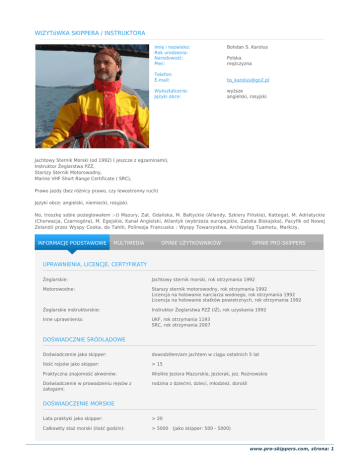 WIZYTóWKA SKIPPERA / INSTRUKTORA Imię i nazwisko: Rok urodzenia: Narodowość: Płeć: Bohdan S. Karolus Polska mężczyzna Telefon: E-mail: [email protected] Wykształcenie: Języki obce: wyższe angielski, rosyjski Jachtowy Sternik Morski (od 1992) ( jeszcze z egzaminami), Instruktor Żeglarstwa PZŻ, Starszy Sternik Motorowodny, Marine VHF Short Range Certificate ( SRC), Prawo jazdy (bez różnicy prawo, czy lewostronny ruch) Języki obce: angielski, niemiecki, rosyjski. No, troszkę sobie pożeglowałem :-)) Mazury, Zat. Gdańska, M. Bałtyckie (Allandy, Szkiery Fińskie), Kattegat, M. Adriatyckie (Chorwacja, Czarnogóra), M. Egejskie, Kanał Angielski, Atlantyk (wybrzeża europejskie, Zatoka Biskajska), Pacyfik od Nowej Zelandii przez Wyspy Cooka, do Tahiti, Polinezja Francuska : Wyspy Towarzystwa, Archipelag Tuamotu, Markizy, INFORMACJE PODSTAWOWE MULTIMEDIA OPINIE UŻYTKOWNIKÓW OPINIE PRO-SKIPPERS UPRAWNIENIA, LICENCJE, CERTYFIKATY Żeglarskie: Jachtowy sternik morski, rok otrzymania 1992 Motorowodne: Starszy sternik motorowodny, rok otrzymania 1992 Licencja na holowanie narciarza wodnego, rok otrzymania 1992 Licencja na holowanie statków powietrznych, rok otrzymania 1992 Żeglarskie instruktorskie: Instruktor Żeglarstwa PZŻ (IŻ), rok uzyskania 1992 Inne uprawnienia: UKF, rok otrzymania 1193 SRC, rok otrzymania 2007 DOŚWIADCZNIE ŚRÓDLĄDOWE Doświadczenie jako skipper: dowodziłem/am jachtem w ciągu ostatnich 5 lat Ilość rejsów jako skipper: > 15 Praktyczna znajomość akwenów: Wielkie Jeziora Mazurskie, Jeziorak, jez. Rożnowskie Doświadczenie w prowadzeniu rejsów z załogami: rodzina z dziećmi, dzieci, młodzież, dorośli DOŚWIADCZENIE MORSKIE Lata praktyki jako skipper: > 20 Całkowity staż morski (ilość godzin): > 5000 (jako skipper: 500 - 5000) www.pro-skippers.com, strona: 1 Ilość odbytych rejsów: 10 - 50 (jako skipper: 10 - 50) Doświadczenie w prowadzeniu jachtów: Ilość kadłubów: jednokadłubowy Długość [m]: < 12, 12-16, 16-24 Rodzaj napędu: żaglowy Praktyczna znajomość akwenów: Morze Bałtyckie, Morze Północne, Chorwacja, Grecja, Polinezja, Wody oceaniczne, Pacyfik (Nowa Zelandia, Wyspy Cooka) Doświadczenie w prowadzeniu rejsów z załogami: rodzina z dziećmi, dorośli DOŚWIADCZNIE SZKOLENIOWE Łączna ilość odbytych szkoleń w charakterze kadry instruktorskiej: - W tym w ostatnich 5 latach: > 15 Pełnione funkcje szkoleniowe: instruktor, KWZ DOŚWIADCZENIE REGATOWE Rodzaj doświadczenia regatowego: turystyczne Rodzaj regat ze względu na akwen: morskie Ilość udziałów w regatach: <5 w tym w ostatnich 5 latach: <5 Pełnione funkcje podczas regat: załoga, oficer Pozostałe informacje: Catty Sark Tall Ships Races > s/y Jagiellonia >1987,1988 1994 www.pro-skippers.com, strona: 2