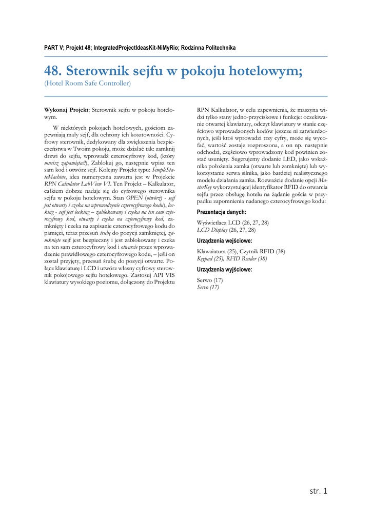 PART V; Projekt 48; IntegratedProjectIdeasKit-NiMyRio; Rodzinna Politechnika 48. Sterownik sejfu w pokoju hotelowym; (Hotel Room Safe Controller) Wykonaj Projekt: Sterownik sejfu w pokoju hotelowym. W niektórych pokojach hotelowych, gościom zapewniają mały sejf, dla ochrony ich kosztowności. Cyfrowy sterownik, dedykowany dla zwiększenia bezpieczeństwa w Twoim pokoju, może działać tak: zamknij drzwi do sejfu, wprowadź czterocyfrowy kod, (który musisz zapamiętać!), Zablokuj go, następnie wpisz ten sam kod i otwórz sejf. Kolejny Projekt typu: SimpleStateMachine, idea numeryczna zawarta jest w Projekcie RPN Calculator LabView VI. Ten Projekt – Kalkulator, całkiem dobrze nadaje się do cyfrowego sterownika sejfu w pokoju hotelowym. Stan OPEN (otwórz) - sejf jest otwarty i czeka na wprowadzenie czterocyfrowego kodu), locking - sejf jest locking – zablokowany i czeka na ten sam czterocyfrowy kod, otwarty i czeka na czterocyfrowy kod, zamknięty i czeka na zapisanie czterocyfrowego kodu do pamięci, teraz przesuń śrubę do pozycji zamkniętej, zamknięte sejf jest bezpieczny i jest zablokowany i czeka na ten sam czterocyfrowy kod i otwarcie przez wprowadzenie prawidłowego czterocyfrowego kodu, – jeśli on został przyjęty, przesuń śrubę do pozycji otwarte. Połącz klawiaturę i LCD i utwórz własny cyfrowy sterownik pokojowego sejfu hotelowego. Zastosuj API VIS klawiatury wysokiego poziomu, dołączony do Projektu RPN Kalkulator, w celu zapewnienia, że maszyna widzi tylko stany jedno-przyciskowe i funkcje: oczekiwanie otwartej klawiatury, odczyt klawiatury w stanie częściowo wprowadzonych kodów jeszcze ni zatwierdzonych, jeśli ktoś wprowadzi trzy cyfry, może się wycofać, wartość zostaje rozproszona, a on np. następnie odchodzi, częściowo wprowadzony kod powinien zostać usunięty. Sugerujemy dodanie LED, jako wskaźnika położenia zamka (otwarte lub zamknięte) lub wykorzystanie serwa silnika, jako bardziej realistycznego modelu działania zamka. Rozważcie dodanie opcji MasterKey wykorzystującej identyfikator RFID do otwarcia sejfu przez obsługę hotelu na żądanie gościa w przypadku zapomnienia nadanego czterocyfrowego kodu: Prezentacja danych: Wyświetlacz LCD (26, 27, 28) LCD Display (26, 27, 28) Urządzenia wejściowe: Klawaiatura (25), Czytnik RFID (38) Keypad (25), RFID Reader (38) Urządzenia wyjściowe: Serwo (17) Servo (17) str. 1 NOTATKI: str. 3