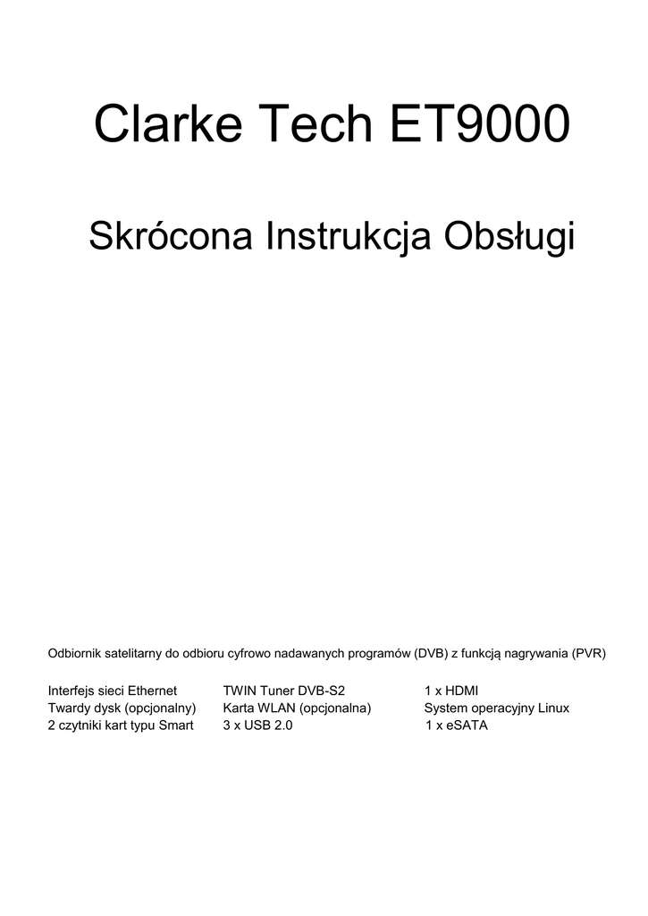 Clarke Tech ET9000 Skrócona Instrukcja Obsługi Odbiornik satelitarny do odbioru cyfrowo nadawanych programów (DVB) z funkcją nagrywania (PVR) Interfejs sieci Ethernet Twardy dysk (opcjonalny) 2 czytniki kart typu Smart TWIN Tuner DVB-S2 Karta WLAN (opcjonalna) 3 x USB 2.0 1 x HDMI System operacyjny Linux 1 x eSATA ZAWARTOŚĆ OPAKOWANIA Sprawdź zawartość opakowania. W skład wyposażenia wchodzą oprócz niniejszej instrukcji obsługi: ● ● ● ● ● ● ● 1x Odbiornik cyfrowy – Clarke Tech ET9000 1x Pilot zdalnego sterowania 2 Baterie ( 1,5 V AA/LR6 ) 1x Kabel HDMI 1x Kabel satelitarny 1x Instrukcja obsługi w języku Angielskim 1x kabel do zasilania wewnętrznego dysku twardego WSKAZÓWKI DOTYCZĄCE BEZPIECZEŃSTWA Nie przejmujemy odpowiedzialności za szkody powstałe w skutek nieodpowiedniej obsługi lub nieprzestrzegania zasad bezpieczeństwa. Prosimy o uważne zapoznanie się z wskazówkami dotyczącymi bezpieczeństwa przed uruchomieniem urządzenia. • • • • • • • • • • • Urządzenie powinno zostać tak ustawione, aby zapewnić wystarczający przepływ powietrza: Pokrywy urządzenia nie wolno zakrywać i musi zostać zachowany wystarczający odstęp do innych urządzeń. Szczeliny wentylacyjne muszą być stale wolne, aby zapewnić odprowadzanie ciepła z wnętrza urządzenia. Podłączaj urządzenie jedynie do przystosowanych gniazd elektrycznych. Nie może dojść do przepięcia. Podłączenie do jednostki zewnętrznej (konwerter LNB): Wyłącz urządzenie, zanim podłączysz lub odłączysz kabel antenowy do konwertera LNB. Kabel konwertera LNB musi być uziemiony. Podłączenie do telewizora: Wyłącz urządzenie, zanim podłączysz kabel SCART do telewizora. Urządzenie nie powinno być narażone na działanie wody skroplonej lub rozpryskowej. Nie stawiaj dlatego na urządzeniu żadnych waz ani innych pojemników napełnionych cieczą. W przypadku wtargnięcia wilgoci do urządzenia odłącz je bezzwłocznie od prądu. Na urządzeniu nie wolno stawiać żadnych łatwopalnych przedmiotów, takich jak świece lub lampy olejne. Urządzenie wolno eksploatować tylko w klimacie umiarkowanym. Nie narażaj urządzenia na działanie bezpośredniego promieniowania słonecznego, wysokiej temperatury lub deszczu. Urządzenie należy niezwłocznie odłączyć od prądu, jeżeli kabel zasilania, gniazdko elektryczne lub samo urządzenie zostały uszkodzone. Nigdy nie wtykaj jakichkolwiek przedmiotów metalowych do wnęk lub szczelin wentylacyjnych urządzenia. Przed rozpoczęciem pielęgnacji urządzenia odłącz kabel zasilania od urządzenia. Używaj wyłącznie lekko wilgotnych ściereczek bez środków czyszczących. Baterie pilota zdalnego sterowania należy trzymać z daleka od źródeł promieniowania cieplnego, aby uniknąć przegrzania i ewentualnej eksplozji. Nigdy nie otwieraj samodzielnie urządzenia! Istniej niebezpieczeństwo porażenia prądem. Gdyby okazało się koniecznym otwarcie urządzenia, zwróć się z prośbą o pomoc do przeszkolonego personelu. • Podłączenie twardego dysku powinno zostać wykonane przez przeszkolo ny personel lub pracowników oficjalnego dilera. • Odłącz urządzenie od prądu, jeżeli nie będzie ono użytkowane przez dłuższy czas. • Odłącz urządzenie od prądu podczas burzy. UTYLIZACJA Opakowanie Clarke-Tech składa się wyłącznie z materiałów podlegających recyklingowi. Zadbaj o to, aby zostało ono poddane recyklingowi. Niniejszy produkt nie powinien z osiągnięciem końca swojego okresu używalności zostać wyrzucony do odpadów pochodzących z gospodarstwa domowego, produkt należy oddać do punktu zbiorczego recyclingu urządzeń elektrycznych i elektronicznych. Wskazuje na to symbol znajdujący się na produkcie, w instrukcji obsługi lub na opakowaniu: Wykorzystane materiały nadają się zgodnie z oznakowaniem do ponownego użytku. Dzięki ponownemu lub innemu zastosowaniu urządzeń przyczyniasz się do ochrony środowiska. W zarządzie gminy zapytaj o właściwy punkt utylizacji. Zwracaj uwagę na to, żeby wyładowane baterie pilota oraz złom elektroniczny nie dostały się do odpadków pochodzących z gospodarstwa domowego, lecz aby zostały właściwie utylizowane (zwrot poprzez handel branżowy, punkty z odpadami specjalnymi). OPIS URZĄDZENIA Panel przedni: ① Wyświetlacz : Wyświetlacz 12 pozycyjny VFD. ② ~③ VOL▲/ VOL▼ : Regulacja głośności ④ OK : Akceptacja wybranej opcji ⑤ ~⑥ CH▼/ CH▲ : Zmiana kanałów – poprzedni/następny ⑦ Menu : Menu główne – wchodzimy do menu głównego ⑧ Cancel : Anuluj wybrana opcję ⑨ Gniazda CI : Do zastosowania modułów CI ⑩ 2 czytniki kart sypu SMART : Do zastosowania kart ⑪ Łącze USB 2.0 : umożliwia podłączanie urządzeń w standardzie USB Ścianka tylna: ① TUNER 1 / TUNER 2 : 2 Wejścia LNB – umożliwiające podłączenie anteny satelitarnej. ② Wyjście audio S/PDIF : optyczne i koaksjalne. Umożliwiają podłączenie cyfrowego wzmacniacza HiFi. ③ Wyjście Composite Video : Umożliwia podłączenie telewizora z odpowiednim wejściem ④ Analogowe wyjście audio (cinch) : umożliwia podłączenie wzmacniacza. ⑤ Wyjście YPbPr : Umożliwia podłączenie telewizora HDTV. ⑥ SCART : Wyjście / Wejście SCART VCR – umożliwia podłączenie odtwarzacza DVD lub magnetowidu. ⑦ Wyjście HDMI : Umożliwia podłączenie telewizora HDTV. ⑧ Gniazdo e-SATA : Umożliwia podłączenie zewnętrznego dysku twardego w standardzie e-SATA. ⑨ Interfejs sieci Ethernet : Umożliwia podłączenie do sieci lokalnej. ⑩ 2 gniazda USB : Umożliwiają podłączenie urządzeń w standardzie USB ⑪ Łącze serwisowe RS-232 : łącze serwisowe. ⑫ Przyłącze zasilania : Umożliwia podłączenie zasilania. ⑬ Przycisk włącz/wyłącz zasilanie : Odcina urządzenie od zasilania. URUCHOMIENIE URZĄDZENIA 1. Proszę przed włączeniem urządzenie zapoznać się uważnie z wskazówkami dotyczącymi bezpi