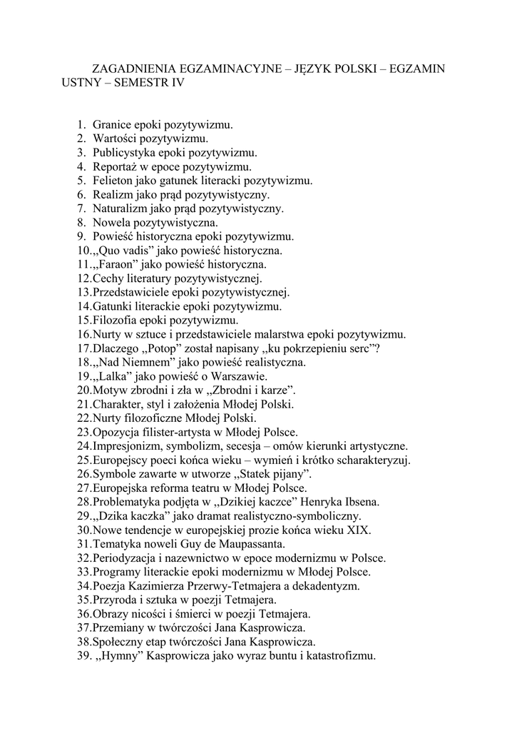 ZAGADNIENIA EGZAMINACYJNE – JĘZYK POLSKI – EGZAMIN USTNY – SEMESTR IV 1. Granice epoki pozytywizmu. 2. Wartości pozytywizmu. 3. Publicystyka epoki pozytywizmu. 4. Reportaż w epoce pozytywizmu. 5. Felieton jako gatunek literacki pozytywizmu. 6. Realizm jako prąd pozytywistyczny. 7. Naturalizm jako prąd pozytywistyczny. 8. Nowela pozytywistyczna. 9. Powieść historyczna epoki pozytywizmu. 10.,,Quo vadis” jako powieść historyczna. 11.,,Faraon” jako powieść historyczna. 12.Cechy literatury pozytywistycznej. 13.Przedstawiciele epoki pozytywistycznej. 14.Gatunki literackie epoki pozytywizmu. 15.Filozofia epoki pozytywizmu. 16.Nurty w sztuce i przedstawiciele malarstwa epoki pozytywizmu. 17.Dlaczego ,,Potop” został napisany ,,ku pokrzepieniu serc”? 18.,,Nad Niemnem” jako powieść realistyczna. 19.,,Lalka” jako powieść o Warszawie. 20.Motyw zbrodni i zła w ,,Zbrodni i karze”. 21.Charakter, styl i założenia Młodej Polski. 22.Nurty filozoficzne Młodej Polski. 23.Opozycja filister-artysta w Młodej Polsce. 24.Impresjonizm, symbolizm, secesja – omów kierunki artystyczne. 25.Europejscy poeci końca wieku – wymień i krótko scharakteryzuj. 26.Symbole zawarte w utworze ,,Statek pijany”. 27.Europejska reforma teatru w Młodej Polsce. 28.Problematyka podjęta w ,,Dzikiej kaczce” Henryka Ibsena. 29.,,Dzika kaczka” jako dramat realistyczno-symboliczny. 30.Nowe tendencje w europejskiej prozie końca wieku XIX. 31.Tematyka noweli Guy de Maupassanta. 32.Periodyzacja i nazewnictwo w epoce modernizmu w Polsce. 33.Programy literackie epoki modernizmu w Młodej Polsce. 34.Poezja Kazimierza Przerwy-Tetmajera a dekadentyzm. 35.Przyroda i sztuka w poezji Tetmajera. 36.Obrazy nicości i śmierci w poezji Tetmajera. 37.Przemiany w twórczości Jana Kasprowicza. 38.Społeczny etap twórczości Jana Kasprowicza. 39. ,,Hymny” Kasprowicza jako wyraz buntu i katastrofizmu. 40. ,,Pogodzenie się z bogiem” w twórczości Jana Kasprowicza. 41.Filozofia Tadeusza Micińskiego w znanych Ci utworach. 42.Twórczość Leopolda Staffa w okresie młodopolskim.