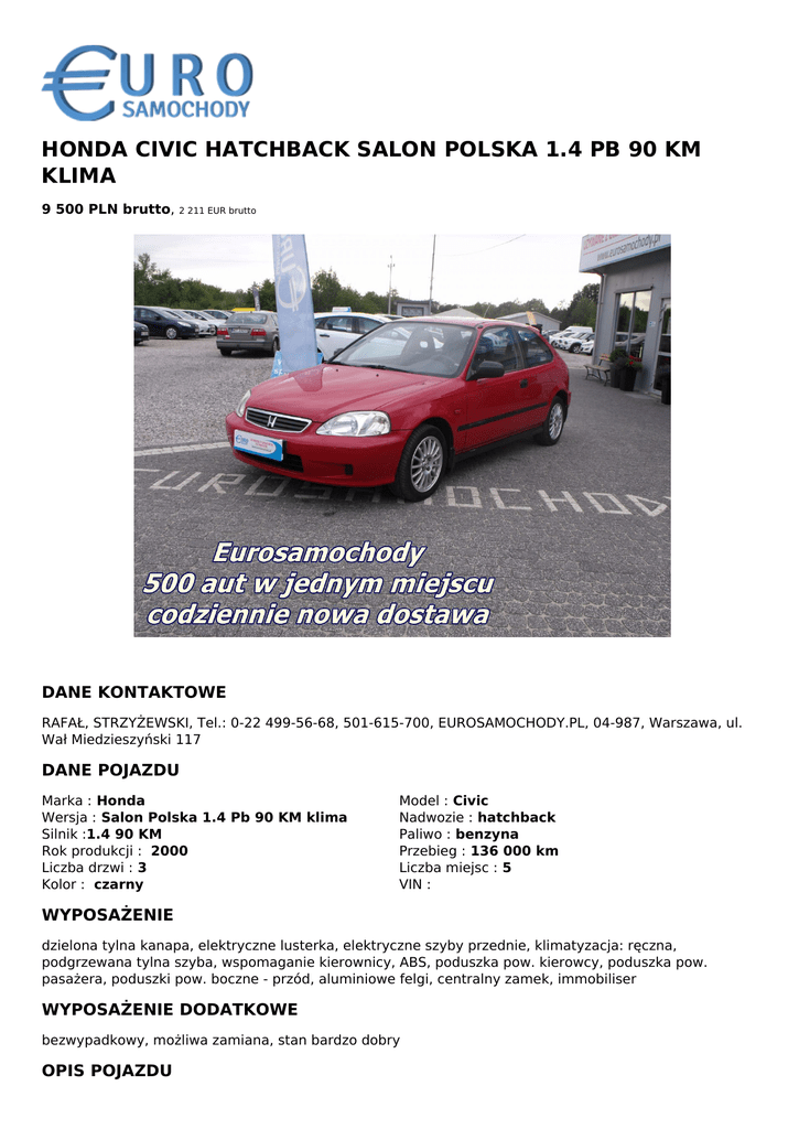 HONDA CIVIC HATCHBACK SALON POLSKA 1.4 PB 90 KM KLIMA 9 500 PLN brutto, 2 211 EUR brutto DANE KONTAKTOWE RAFAŁ, STRZYŻEWSKI, Tel.: 0-22 499-56-68, 501-615-700, EUROSAMOCHODY.PL, 04-987, Warszawa, ul. Wał Miedzieszyński 117 DANE POJAZDU Marka : Honda Wersja : Salon Polska 1.4 Pb 90 KM klima Silnik :1.4 90 KM Rok produkcji : 2000 Liczba drzwi : 3 Kolor : czarny Model : Civic Nadwozie : hatchback Paliwo : benzyna Przebieg : 136 000 km Liczba miejsc : 5 VIN : WYPOSAŻENIE dzielona tylna kanapa, elektryczne lusterka, elektryczne szyby przednie, klimatyzacja: ręczna, podgrzewana tylna szyba, wspomaganie kierownicy, ABS, poduszka pow. kierowcy, poduszka pow. pasażera, poduszki pow. boczne - przód, aluminiowe felgi, centralny zamek, immobiliser WYPOSAŻENIE DODATKOWE bezwypadkowy, możliwa zamiana, stan bardzo dobry OPIS POJAZDU Salon Polska WITAMY W NAJWIĘKSZYM W POLSCE SALONIE SAMOCHODÓW UŻYWANYCH SUPER PROMOCJA GWARANCJA TECHNICZNA NA 12 MIESIĘCY lub KOMPLET OPON ZIMOWYCH lub LETNICH GRATIS*(do wyczerpania zapasów, możliwość rozszerzenia gwarancji do 36 miesięcy) - 500 AUT Z GWARANCJĄ w jednym miejscu / różne marki , modele , wersje wyposażenia/ - 8 dni na zamianę auta - Sprawdzone pochodzenie pojazdów - bezwypadkowe - Gwarancja przebiegu - Gwarancja pełnej historii serwisowej - Samochody od I właściciela - dla klientów zamiejscowych rezerwacja auta do czasu przyjazdu - udzielamy 12-miesięcznej gwarancji technicznej, możliwość przedłużenia do 36-miesięcy /bez limitu kilometrów, ważna na terenie całej Polski + assistance- darmowe holowanie , potwierdzenie certyfikatem / Kupującemu oferujemy: 1. Jazdę próbną 2. Bezpłatny przegląd przedsprzedażowy obejmujący: - kontrolę amortyzatorów - hamulców - podwozia samochodu - pomiar geometrii - diagnoza komputerowa - pomiar grubości powłoki lakierniczej - możliwość sprawdzenia przed zakupem w serwisie lub stacji diagnostycznej lub za pośrednictwem niezależnego rzeczoznawcy na zlecenie kupującego /dla klientów zamiejscowych bez konieczności przyjazdu/. - wszystkie nasze samochody posiadają komplet dokumentów wymaganych do zarejestrowania bądź przerejestrowania samochodu - przyjmujemy auta w rozliczeniu oraz kupujemy /bez ograniczeń wiekowych/ - Zajmujemy się sprzedażą detaliczną oraz hurtową / zapraszamy do współpracy osoby prywatne, firmy również z branży i instytucje / -Kupujący otrzymuje fakturę VAT 23% /nie ponosi opłaty PCC w wysokości 2%/ -kredyt 0% wpłaty własnej,raty dopasowane do własnych potrzeb -leasing bez zaświadczeń ,również dla widniejących w BIK szybka obsługa na miejscu "Niniejsze ogłoszenia są wyłącznie informacją handlową i nie stanowią oferty w myśl art. 66, § 1. Kodeksu Cywilnego. Sprzedający nie odpowiada za ewentualne błędy lub nieaktualność ogłoszenia." Zapis ten został zamieszczony ze względu na możliwość niezamierzonych pomyłek. Jeżeli zauważysz nieścisłość napisz do nas. Szukasz pewnego używanego auta ? Tylko u nas sprawdzone samochody z polskich salonów To nie komis to salon aut używanych z wieloletnim doświadczeniem Więcej informacji na eurosamochody . pl ZADZWOŃ TERAZ!!! Rafał 501 615 700 Tomasz 512 345 150 Marcin 505 416 300 Piotr 501 087 038 Mariusz 500 130 727 QR CODE DLA OGŁOSZENIA Powered by TCPDF (www.tcpdf.org)