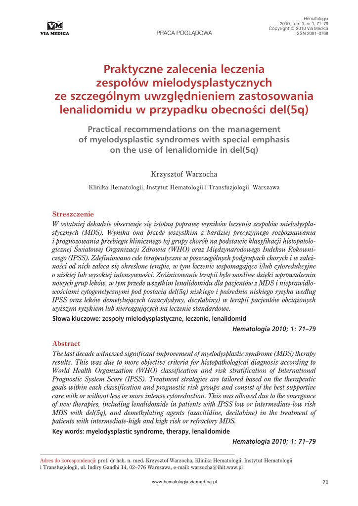 Hematologia 2010, tom 1, nr 1, 71–79 Copyright © 2010 Via Medica ISSN 2081–0768 PRACA POGLĄDOWA Praktyczne zalecenia leczenia zespołów mielodysplastycznych ze szczególnym uwzględnieniem zastosowania lenalidomidu w przypadku obecności del(5q) Practical recommendations on the management of myelodysplastic syndromes with special emphasis on the use of lenalidomide in del(5q) Krzysztof Warzocha Klinika Hematologii, Instytut Hematologii i Transfuzjologii, Warszawa Streszczenie W ostatniej dekadzie obserwuje się istotną poprawę wyników leczenia zespołów mielodysplastycznych (MDS). Wynika ona przede wszystkim z bardziej precyzyjnego rozpoznawania i prognozowania przebiegu klinicznego tej grupy chorób na podstawie klasyfikacji histopatologicznej Światowej Organizacji Zdrowia (WHO) oraz Międzynarodowego Indeksu Rokowniczego (IPSS). Zdefiniowano cele terapeutyczne w poszczególnych podgrupach chorych i w zależności od nich zaleca się określone terapie, w tym leczenie wspomagające i/lub cytoredukcyjne o niskiej lub wysokiej intensywności. Zróżnicowanie terapii było możliwe dzięki wprowadzeniu nowych grup leków, w tym przede wszytkim lenalidomidu dla pacjentów z MDS i nieprawidłowościami cytogenetycznymi pod postacią del(5q) niskiego i pośrednio niskiego ryzyka według IPSS oraz leków demetylujących (azacytydyny, decytabiny) w terapii pacjentów obciążonych wyższym ryzykiem lub niereagujących na leczenie standardowe. Słowa kluczowe: zespoły mielodysplastyczne, leczenie, lenalidomid Hematologia 2010; 1: 71–79 Abstract The last decade witnessed significant improvement of myelodysplastic syndrome (MDS) therapy results. This was due to more objective criteria for histopathological diagnosis according to World Health Organization (WHO) classification and risk stratification of International Prognostic System Score (IPSS). Treatment strategies are tailored based on the therapeutic goals within each classification and prognostic risk groups and consist of the best supportive care with or without less or more intense cytoreduction. This was allowed due to the emergence of new therapies, including lenalidomide in patients with IPSS low or intermediate-low risk MDS with del(5q), and demethylating agents (azacitidine, decitabine) in the treatment of patients with intermediate-high and high risk or refractory MDS. Key words: myelodysplastic syndrome, therapy, lenalidomide Hematologia 2010; 1: 71–79 Adres do korespondencji: prof. dr hab. n. med. Krzysztof Warzocha, Klinika Hematologii, Instytut Hematologii i Transfuzjologii, ul. Indiry Gandhi 14, 02–776 Warszawa, e-mail: [email protected] www.hematologia.viamedica.pl 71 Hematologia 2010, tom 1, nr 1 Wstęp Zespoły mielodysplastyczne (MDS, myelodysplastic syndrome) to szpikowe hemocytopatie klonalne o heterogennym spektrum obrazu klinicznego. Głównymi problemami klinicznymi w tych zaburzeniach są współwystępujące zespoły chorobowe spowodowane cytopeniami we krwi obwodowej oraz ryzyko transformacji MDS w ostrą białaczkę szpikową (AML, acute myeloid leukemia). W populacji ogólnej MDS występują z częstością 5 na 100 000 osób. Jednak wśród osób w wieku 70 lat lub więcej częstość występowania zwiększa się i wynosi 22– –45 na 100 000 i dalej wzrasta z wiekiem [1]. Wstępna ocena pacjentów z podejrzeniem MDS wymaga dokładnego opisania rozmazu oraz wykonania morfologii krwi obwodowej, morfologii szpiku kostnego, określenia czasu utrzymywania się nieprawidłowej liczby krwinek, innych potencjalnych przyczyn cytopenii oraz współwystępujących schorzeń. W celu ustalenia rozpoznania MDS należy dokonać szczegółowej interpretacji objawów klinicznych, ponieważ wiele leków oraz zakażeń wirusowych może powodować zmiany morfologiczne w szpiku kostnym podobne do obserwowanych w MDS [1–7]. W 2008 roku Światowa Organizacja Zdrowia (WHO, World Health Organization) zaproponowała nowy system klasyfikacji MDS [4–6]. W wytycznych WHO zaakceptowano dysplazję jednej linii komórek dla rozpoznania niedokrwistości opornej na leczenie (RA, refractory anemia) oraz niedokrwistości opornej na leczenie z obecnością pierścieniowatych syderoblastów (RARS, refractory anemia with ringed sideroblasts), o ile nie występują inne przyczyny dysplazji, a utrzymuje się ona przez co najmniej 6 miesięcy. Inne kategorie w obrębie propozycji WHO obejmują cytopenię oporną na leczenie z wieloliniową dysplazją (RCMD, refractory cytopenia with multilineage dysplasia), podzielenie pacjentów z niedokrwistością oporną na leczenie z nadmiarem blastów (RAEB, refractory anemia with excess of blasts) na osoby mające mniej niż 10% blastów w szpiku kostnym (RAEB-1) oraz osoby, u których występuje 10% lub więcej blastów w szpiku kostnym (RAEB-2), zespół 5q- [del(5q)] oraz niesklasyfikowany MDS z obecnością lub bez pierścieniowatych syderoblastów. Zespół 5q-, uznawany przez WHO za odrębną kategorię MDS, obejmuje pacjentów z izolowaną delecją 5q31-33 oraz obecnością w szpiku kostnym mniej niż 5% blastów, często z towarzyszącą nadpłytkowością [4–6]. Podtyp ten jest zwykle związany z dobrym rokowaniem i wysokim prawdopodobieństwem uzyskania odpowiedzi na leczenie lenalidomidem [8]. 72 W celu zapewniania spójności wytycznych diagnostycznych MDS międzynarodowa grupa robocza International Consensus Working Group (ICWG) zaleca, aby minimalne kryteria diagnostyczne obejmowały stabilną cytopenię utrzymującą się co najmniej 6 miesięcy, o ile nie towarzyszą jej swoiste zmiany kariotypu lub dysplazja dwóch linii komórkowych, w przypadku których konieczne jest utrzymywanie się stabilnej cytopenii jedynie przez 2 miesiące oraz wykluczenie innych przyczyn dysplazji i/lub cytopenii. Oprócz tych dwóch wymogów diagnostycznych rozpoznanie MDS wymaga spełnienia co najmniej jednego z trzech kryteriów, w tym dysplazji większej lub równej 10% w co najmniej jednej