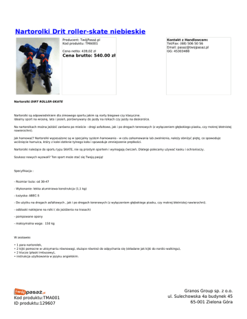 Nartorolki Drit roller-skate niebieskie Producent: TwójPasaż.pl Kod produktu: TMA001 Cena netto: 439,02 zł Kontakt z Handlowcem: Tel/Fax: (68) 506 50 56 Email: [email protected] GG: 45303488 Cena brutto: 540.00 zł Nartorolki DIRT ROLLER-SKATE Nartorolki są odpowiednikiem dla zimowego sportu jakim są narty biegowe czy klasyczne. Idealny sport na wiosnę, lato i jesień, porównywany do jazdy na rolkach czy jazdy na deskorolce. Na nartorolkach można jeździć zarówno po mieście - drogi asfaltowe, jak i po drogach terenowych (z wyłączeniem głębokiego piasku, czy mokrej błotnistej nawierzchni). Jak hamować? Nartorolki wyposażone są w specjalny system hamowania - w celu zahamowania lub zwolnienia, należy obniżyć piętę, co spowoduje wciśnięcie hamulca, który z kolei dotknie tylnego koła i spowoduje zmniejszenie prędkości. Nartorolki należące do sportu typu SKATE, nie są prostym sportem i wymagają ćwiczeń. Dlatego polecamy używać kasku i ochraniaczy. Szukasz nowych wyzwań? Ten sport może stać się Twoją pasją! Specyfikacja : - Rozmiar buta: od 38-47 - Wykonanie: lekka aluminiowa konstrukcja (1,1 kg) - Łożyska: ABEC-5 - Do użytku na drogach asfaltowych , jak i po drogach terenowych (z wyłączeniem głębokiego piasku, czy mokrej błotnistej nawierzchni). - odblaski naklejone na rolki ( do jeżdżenia na trasach) - pompowane opony - maksymalna waga: 150 kg W zestawie: • 1 para nartorolek, • 2 kijki pomocne w utrzymaniu równowagi, służące również do odpychania się (składane jak kijki do nordic-walkingu), • 2 klucze (płaski imbusowy), • instrukcja użytkowania w języku angielskim. Kod produktu:TMA001 ID produktu:129607 Granos Group sp. z o.o. ul. Sulechowska 4a budynek 45 65-001 Zielona Góra