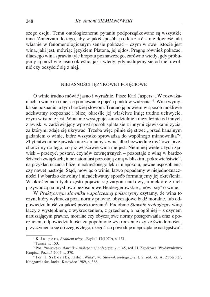 Ks. Antoni SIEMIANOWSKI 248 szego eseju. Temu ontologicznemu pytaniu podporządkowane są wszystkie inne. Zmierzam do tego, aby w jakiś sposób p o k a z a ć – nie dowieść, ale właśnie w fenomenologicznym sensie pokazać – czym w swej istocie jest wina, jaki jest, mówiąc językiem Platona, jej ejdos. Pragnę również pokazać, dlaczego wina sprawia tyle kłopotu poznawczego, zarówno wtedy, gdy próbu− jemy ją możliwie jasno określić, jak i wtedy, gdy usiłujemy się od niej uwol− nić czy oczyścić się z niej. NIEJASNOŚCI JĘZYKOWE I POJĘCIOWE O winie trudno mówić jasno i wyraźnie. Pisze Karl Jaspers: „W rozważa− niach o winie ma miejsce pomieszanie pojęć i punktów widzenia”1. Wina wymy− ka się poznaniu, a tym bardziej słowom. Trudno ją bowiem w sposób możliwie adekwatny rozpoznać i bliżej określić jej właściwe imię; trudno uchwycić, czym w istocie jest. Wina nie występuje samodzielnie i niezależnie od innych zjawisk, w zadziwiający wprost sposób splata się z innymi zjawiskami życia, za którymi zdaje się ukrywać. Trzeba więc pilnie się strzec „przed banalnym gadaniem o winie, które wszystko sprowadza do wspólnego mianownika”2. Zbyt łatwo inne zjawiska utożsamiamy z winą albo bezwiednie myślowo prze− chodzimy do tego, co już właściwie winą nie jest. Niemniej wiele z tych zja− wisk – przeżyć, postaw, czynów zewnętrznych – pozostaje z winą w bardzo ścisłych związkach; inne natomiast pozostają z nią w bliskim „pokrewieństwie”, na przykład uczucia bliżej nieokreślonego lęku i niepokoju, pewne usposobienia czy nawet nastroje. Stąd, mówiąc o winie, łatwo popadamy w niejednoznacz− ności i w bardzo dowolny i nieadekwatny sposób formułujemy jej określenia. W określeniach tych często pojawia się żargon naukowy, a niektóre z nich przywodzą na myśl owo bezosobowe Heideggerowskie „mówi się” o winie. W Praktycznym słowniku współczesnej polszczyzny czytamy, że wina to czyn, który wykracza poza normy prawne, obyczajowe bądź moralne, lub od− powiedzialność za jakieś przekroczenie3. Podobnie Słownik teologiczny winę łączy z występkiem, z wykroczeniem, z grzechem, a najogólniej – z czynem naruszającym prawne, moralne czy obyczajowe normy postępowania oraz z po− czuciem odpowiedzialności za popełnione wykroczenie czy ze świadomością przyczynienia się do czegoś złego, czegoś, co powoduje niepożądane następstwa4. 1 K. J a s p e r s, Problem winy, „Etyka” 17(1979), s. 151. Tamże, s. 153. 3 Por. Praktyczny słownik współczesnej polszczyzny, t. 45, red. H. Zgółkowa, Wydawnictwo Kurpisz, Poznań 2004, s. 370. 4 Por. T. S i k o r s k i, hasło: „Wina”, w: Słownik teologiczny, t. 2, red. ks. A. Zuberbier, Księgarnia św. Jacka, Katowice 1989, s. 366. 2 Piętno Kaina 249 W psychologii tak zwane poczucie winy uważane jest za skutek błędnej oceny samego siebie. U podłoża poczucia winy leży doświadczenie negatywnych uczuć w stosunku do własnej osoby, które powstają w następstwie negatyw− nej oceny samego siebie z punktu widzenia określonych wartości moralnych. Akcentuje się przy tym, że rdzeniem poczucia winy jest właśnie negatywna ocena samego siebie i własnego postępowania. Niektórzy są zdania, że poczucie winy jest naturalnym mechanizmem sa− mokontroli. W etyce zaś mówi się, że zjawisko winy łączy się z poczuciem odpowiedzialności, z normą prawa naturalnego obwarowanego należytą sankcją; naruszenie tego rodzaju sankcji rodzi poczucie winy moralnej i naraża na karę5. Poczucie winy zakłada mniej lub bardziej wyraźną świadomość moralną i nie można go odrywać od świadomości zła i dobra. Człowiek nieświadomy sprawstwa swego czynu i nieświadomy jego niegodziwości nie przeżywa po− czucia winy, co najwyżej przeżywać może jakieś lęki czy niepewność, ale nie doświadcza poczucia winy jako goryczy. Człowiek świadomy następstw swo− ich decyzji i moralnej niegodziwości popełnionego czynu, a także mający po− czucie odpowiedzialności za siebie i za drugich doświadcza natomiast często wzmożonego poczucia winy, zastanawia się bowiem nad słusznością swoich racji moralnych. U ludzi świadomych moralnego zła i dobra własnych czy− nów poczucie winy łączy się ponadto z takimi uczuciami, jak wstyd czy lęk przed karą, przed napiętnowaniem, przed potępieniem. Ludzie o usposobieniu lękliwym przeżywają nieraz wzmożone poczucie winy nawet z błahych po− wodów, a niekiedy w sposób chorobliwy wyolbrzymiają własne zawinienia. Natomiast ludzie zbyt pewni siebie i swych racji moralnych, a przy tym zarozu− miali i aroganccy, zazwyczaj decyzje podejmują bez moralnych oporów i nie trapią się ani następstwami swych czynów, ani własnym zawinieniem – mogą bać się kary, ale poczucie winy jest im obce. Stosunkowo łatwo też znajdują wytłumaczenie dla swojego postępowania. Poczucie winy zakłada też wolność podejmowanych decyzji. Człowiek przymuszony do niegodziwego działania przeżywa poczucie poniżenia i mo− ralnego zbrukania, ale nie poczucie winy. W kształtowaniu prawidłowego poczucia winy niezwykle ważną rolę od− grywa wrażliwe sumienie. Sumienie to jednak nie to samo, co wina. Sumienie jako „głos serca” oskarża człowieka z powodu zawinienia, niepokoi, wina nato− miast – jako plama czy gorycz serca – milczy, jest gorzkim smakiem zła mo− ralnego, które urzeczywistnia się w postawach, zachowaniach i działaniach. 5 Por. T. Ś l i p k o, Etos chrześcijański. Zarys etyki ogólnej, Wydawnictwo Apostolstwa Mod− litwy, Kraków 1974, s. 235, 279.