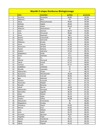 WynikiIIetapuKonkursuBiologicznego 1 2 3 4 5 6 7 8 9 10 11 12 13 14 15 16 17 18 19 20 21 22 23 24 25 26 27 28 29 30 31 32 33 34 35 36 37 38 39 40 41 42 43 44 45 46 47 48 imie Karolina Wiktoria Alicja Mikołaj Klaudia Mateusz Julia Julia Anna Dawid Maciej Wiktoria Anna Katarzyna Paweł Hubert Magdalena Anna Jan Michał Jakub Tomasz GABRIELA Klaudia Aleksandra Katarzyna Bartłomiej Igor Paulina Honorata Klaudia Jakub Aleksandra Weronika Maja Mateusz Sandra Aleksandra Magdalena Arkadiusz Maciej Julia Julia Zuzanna Angelika Maciej Agata Jakub nazwisko Żurawska Brot Wojciechowska Dąbek Hodur Wojasiewicz Samson Chruściak Ziętarska Lewosiński Zamorski Kurtek Cebula Wróbel Żelazny Jedrocha Polak Zielińska Lis Gernand Łosiak Król LEWICKA Lipowska Gręda Wesołowska Czerwik Adamski Łuszczek Majder Borycka Bernat Skrzypek Jagiełło Wójcik Zięba Orkisz Zmieniecka Grabka Wąsik Kula Wójcik Soból Zgrzywa Pająk Standerski Stańczyk Filipiak punkty 50,83 50 49,83 49,83 49,16 49 48,75 48,66 48,5 48,16 48,16 47,91 47,83 47,83 47,83 47,54 47,5 47,5 47,33 47,25 47,17 47,17 47 47 47 46,99 46,83 46,75 46,5 46,5 46,5 46,49 46,29 46,29 46,25 46,16 46,08 46 46 45,83 45,83 45,83 45,79 45,67 45,5 45,33 45,33 45,33 procenty 95,9% 94,3% 94,0% 94,0% 92,8% 92,5% 92,0% 91,8% 91,5% 90,9% 90,9% 90,4% 90,2% 90,2% 90,2% 89,7% 89,6% 89,6% 89,3% 89,2% 89,0% 89,0% 88,7% 88,7% 88,7% 88,7% 88,4% 88,2% 87,7% 87,7% 87,7% 87,7% 87,3% 87,3% 87,3% 87,1% 86,9% 86,8% 86,8% 86,5% 86,5% 86,5% 86,4% 86,2% 85,8% 85,5% 85,5% 85,5% 49 50 51 52 53 54 55 56 57 58 59 60 61 62 63 64 65 66 67 68 69 70 71 72 73 74 75 76 77 78 79 80 81 82 83 84 85 86 87 88 89 90 91 92 93 94 95 96 97 98 99 100 Maja Ignacy Aleksandra Wojciech Aleksandra Gabriela Magdalena Adam Iga Julia Marcin Michalina Dominika Laura Natalia Aleksandra Nikodem Julia Julia Gabriela KAROLINA Amelia Weronika Karolina Natalia Kacper Karol Gabriela Patrycja Olga Jakub Wiktoria Aleksandra Anna Martyna Filip Joanna Karolina Marcel Błażej Magdalena Natalia Klaudia Piotr Jakub Angelika Dominik Dominika Martyna Kacper DawidArtur Dominik Szydłowska Kosterki-Spalski Czupryna Gajda Gniewkiewicz Różycka Czekaj Piątek Klepacz Pasternak Kuleta Duda Janik Pietras Józefczak Jaskulska Trzcina Szczepańska Wilk Ciszek CZECH Chłosta Krajna Grzesik Boboń Kolus Zimnicki Biesaga Wypych Słomka Adamus Nalepa Kuleta Wojtasińska Posobkiewicz Gotowiecki Jermak Pałys Jakubowski Brodziński Anioł Rojek Kamińska Łyżwa Góra Gaik Moskal Gad Dąbrowska Michta Kozub Smołuch 45,25 45,25 45,13 45,13 45 45 44,67 44,58 44,58 44,5 44,33 44,3 44,16 44,16 44,08 44,08 44 44 43,84 43,83 43,83 43,67 43,5 43,49 43,38 43,33 43,33 43,3 43,25 43,25 43,17 43,13 43 43 42,83 42,83 42,83 42,75 42,71 42,66 42,66 42,5 42,5 42,5 42,5 42,49 42,33 42,33 42,32 42,25 42,25 42,24 85,4% 85,4% 85,2% 85,2% 84,9% 84,9% 84,3% 84,1% 84,1% 84,0% 83,6% 83,6% 83,3% 83,3% 83,2% 83,2% 83,0% 83,0% 82,7% 82,7% 82,7% 82,4% 82,1% 82,1% 81,8% 81,8% 81,8% 81,7% 81,6% 81,6% 81,5% 81,4% 81,1% 81,1% 80,8% 80,8% 80,8% 80,7% 80,6% 80,5% 80,5% 80,2% 80,2% 80,2% 80,2% 80,2% 79,9% 79,9% 79,8% 79,7% 79,7% 79,7% 101 102 103 104 105 106 107 108 109 110 111 112 113 114 115 116 117 118 119 120 121 122 123 124 125 126 127 128 129 130 131 132 133 134 135 136 137 138 139 140 141 142 143 144 145 146 147 148 149 Wiktoria Damian Damian Piotr Monika Roksana Kinga Weronika Monika Urszula Bartosz Karol Anna Magdalena Katarzyna KONRAD Mateusz Katarzyna Patrycja Alex Mateusz Karolina Klaudia Magdalena Filip Julia Katarzyna Joanna Gabriela Jakub Zuzanna Natalia Aleksandra Wiktor Ada Jakub KacperMaksymilian Martyna Agata Szymon Aleksandra TymoteuszTadeusz Ewelina Paulina Adam Katarzyna Aleksandra Julia Oliwia Bujak Ślusarczyk Prus Szczepanek Karkocha Rajca Bernyś Makuch Wieczorek Śliwa Sambór Janik Błach Grzyb Boszczyk KOBIERSKI Szczepanik Szeląg Kurczyna Malinowski Salata Siemińska Nowak Kobiec Dąbrowski Ciszek Siemieniec Cieślak Okarska Wrona Szczepańska Dunajska Wójtowicz Piwnik Gruszczynska Zwierzyński Kowalski Utnik Dziura Przetak Młodawska Gołębiowski Cetnarska Dziewierz Nowak Kubica Krężołek Łyżwa Cygan 42,17 42,16 42 42 41,92 41,88 41,83 41,8 41,75 41,66 41,58 41,58 41,55 41,5 41,41 41,33 41,33 41,33 41,33 41,33 41,25 41,25 41,25 41,21 41,17 41,09 41,08 41,04 41 41 41 41 41 40,99 40,97 40,96 40,83 40,8 40,75 40,75 40,75 40,67 40,67 40,67 40,54 40,5 40,46 40,42 40,42 79,6% 79,5% 79,2% 79,2% 79,1% 79,0% 78,9% 78,9% 78,8% 78,6% 78,5% 78,5% 78,4% 78,3% 78,1% 78,0% 78,0% 78,0% 78,0% 78,0% 77,8% 77,8% 77,8% 77,8% 77,7% 77,5% 77,5% 77,4% 77,4% 77,4% 77,4% 77,4% 77,4% 77,3% 77,3% 77,3% 77,0% 77,0% 76,9% 76,9% 76,9% 76,7% 76,7% 76,7% 76,5% 76,4% 76,3% 76,3% 76,3% UczniowiepowyżejprzechodządoIIIetapuKonkursuBiologicznegood1do 149 150 151 152 153 154 155 156 157 158 159 160 161 162 163 164 165 166 167 168 169 170 171 172 173 174 175 176 177 178 179 180 181 182 183 184 185 186 187 188 189 190 191 192 193 194 195 196 197 198 199 200 201 Ernest Magdalena Gabriela Wiktoria Anna Marcelina Julia Maja Katarzyna Aleksandra Anastazja Agnieszka Michał Joanna Wiktoria Aneta Mateusz Jakub Anastazja Julia Natalia Alicja Paulina Julia Michał Julia Angelika Dominika Martyna Tomasz Julia Anna Aleksandra Oliwia Magdalena Anna Paulina Amelia Dawid Julia Natalia Jakub Julia Klaudia Aleksandra Julia Patrycja Karolina Adam Agata Daniel Natalia Jagieła Ciesielska Zięba Zalińska Kołomańska Gębska Godowska Olczyk Tkacz Walasek Solarz Kaczyńska Latra Wrona Nowak Dybicz Walkiewicz Jakubiec Kozioł Wieczorek Sufin Kwitek Wesołowska Kluk Skrobot Marzec Furmańczyk Kowalczyk Strzęp Fijałkowski Górniak Gębora Bednarczyk Domżał Bogdan Zięba Korba Switek Lewandowski Wąsik Stępień Matla Święcicka Wilkowska Poświat Chabior Waluśkiewicz Rokicka Gruszczyński Wyrzykowska Banach Pytel 40,24 40,16 40,16 40,16 40,13 40,13 40,09 40,08 40,08 40 39,92 39,83 39,83 39,8 39,71 39,71 39,67 39,67 39,66 39,66 39,66 39,63 39,59 39,58 39,58 39,58 39,54 39,5