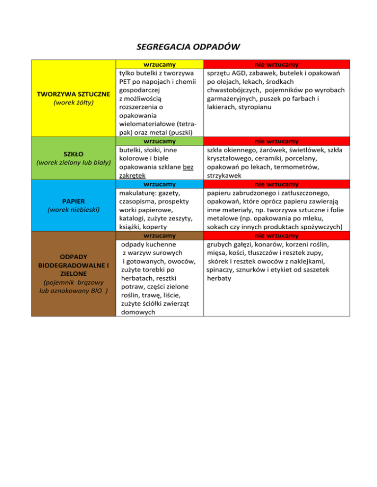 SEGREGACJA ODPADÓW TWORZYWA SZTUCZNE (worek żółty) SZKŁO (worek zielony lub biały) PAPIER (worek niebieski) ODPADY BIODEGRADOWALNE I ZIELONE (pojemnik brązowy lub oznakowany BIO ) wrzucamy tylko butelki z tworzywa PET po napojach i chemii gospodarczej z możliwością rozszerzenia o opakowania wielomateriałowe (tetrapak) oraz metal (puszki) wrzucamy butelki, słoiki, inne kolorowe i białe opakowania szklane bez zakrętek wrzucamy makulaturę: gazety, czasopisma, prospekty worki papierowe, katalogi, zużyte zeszyty, książki, koperty wrzucamy odpady kuchenne z warzyw surowych i gotowanych, owoców, zużyte torebki po herbatach, resztki potraw, części zielone roślin, trawę, liście, zużyte ściółki zwierząt domowych nie wrzucamy sprzętu AGD, zabawek, butelek i opakowań po olejach, lekach, środkach chwastobójczych, pojemników po wyrobach garmażeryjnych, puszek po farbach i lakierach, styropianu nie wrzucamy szkła okiennego, żarówek, świetlówek, szkła kryształowego, ceramiki, porcelany, opakowań po lekach, termometrów, strzykawek nie wrzucamy papieru zabrudzonego i zatłuszczonego, opakowań, które oprócz papieru zawierają inne materiały, np. tworzywa sztuczne i folie metalowe (np. opakowania po mleku, sokach czy innych produktach spożywczych) nie wrzucamy grubych gałęzi, konarów, korzeni roślin, mięsa, kości, tłuszczów i resztek zupy, skórek i resztek owoców z naklejkami, spinaczy, sznurków i etykiet od saszetek herbaty