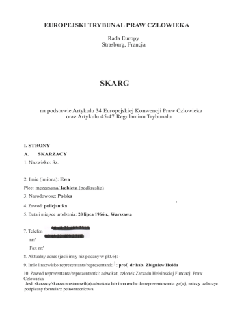 Skarga zostala przygotowana w ramach prac Programu Spraw Precedensowych Helsinskiej Fundacji