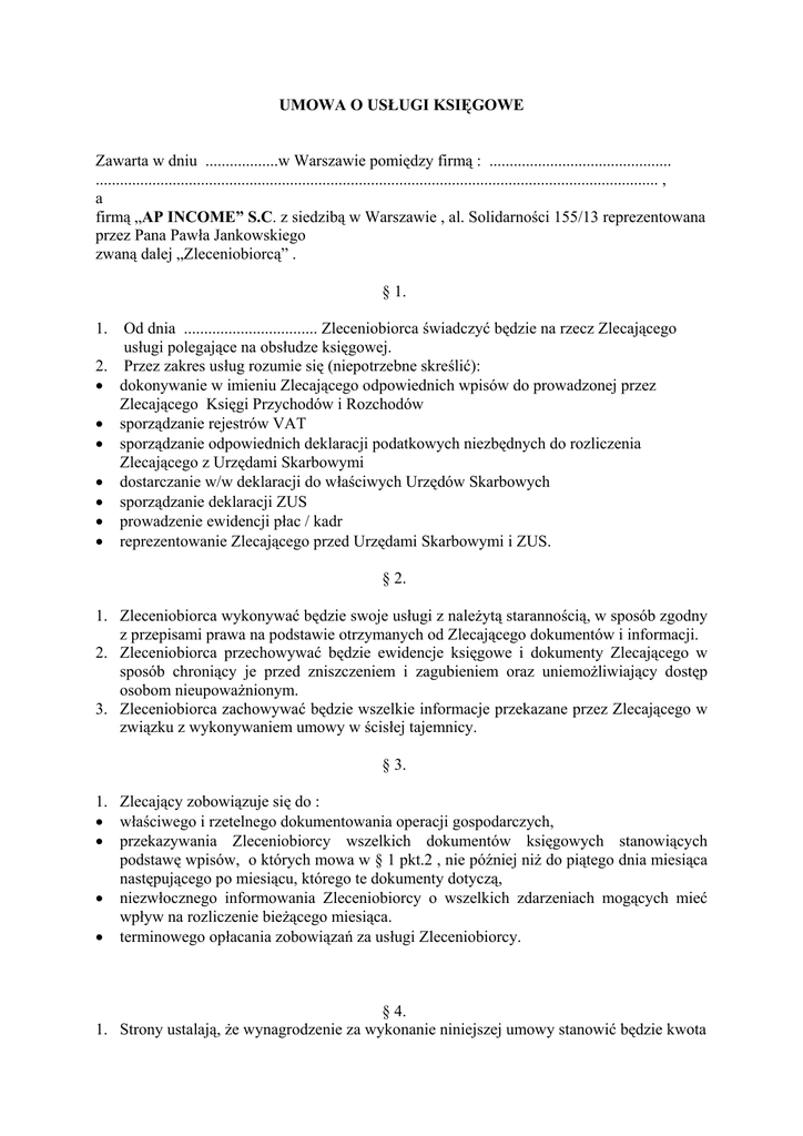 UMOWA O USŁUGI KSIĘGOWE Zawarta w dniu ..................w Warszawie pomiędzy firmą : ............................................. ........................................................................................................................................... , a firmą „AP INCOME” S.C. z siedzibą w Warszawie , al. Solidarności 155/13 reprezentowana przez Pana Pawła Jankowskiego zwaną dalej „Zleceniobiorcą” . § 1. 1. Od dnia ................................. Zleceniobiorca świadczyć będzie na rzecz Zlecającego usługi polegające na obsłudze księgowej. 2. Przez zakres usług rozumie się (niepotrzebne skreślić): • dokonywanie w imieniu Zlecającego odpowiednich wpisów do prowadzonej przez Zlecającego Księgi Przychodów i Rozchodów • sporządzanie rejestrów VAT • sporządzanie odpowiednich deklaracji podatkowych niezbędnych do rozliczenia Zlecającego z Urzędami Skarbowymi • dostarczanie w/w deklaracji do właściwych Urzędów Skarbowych • sporządzanie deklaracji ZUS • prowadzenie ewidencji płac / kadr • reprezentowanie Zlecającego przed Urzędami Skarbowymi i ZUS. § 2. 1. Zleceniobiorca wykonywać będzie swoje usługi z należytą starannością, w sposób zgodny z przepisami prawa na podstawie otrzymanych od Zlecającego dokumentów i informacji. 2. Zleceniobiorca przechowywać będzie ewidencje księgowe i dokumenty Zlecającego w sposób chroniący je przed zniszczeniem i zagubieniem oraz uniemożliwiający dostęp osobom nieupoważnionym. 3. Zleceniobiorca zachowywać będzie wszelkie informacje przekazane przez Zlecającego w związku z wykonywaniem umowy w ścisłej tajemnicy. § 3. 1. Zlecający zobowiązuje się do : • właściwego i rzetelnego dokumentowania operacji gospodarczych, • przekazywania Zleceniobiorcy wszelkich dokumentów księgowych stanowiących podstawę wpisów, o których mowa w § 1 pkt.2 , nie później niż do piątego dnia miesiąca następującego po miesiącu, którego te dokumenty dotyczą, • niezwłocznego informowania Zleceniobiorcy o wszelkich zdarzeniach mogących mieć wpływ na rozliczenie bieżącego miesiąca. • terminowego opłacania zobowiązań za usługi Zleceniobiorcy. § 4. 1. Strony ustalają, że wynagrodzenie za wykonanie niniejszej umowy stanowić będzie kwota wynikająca z załącznika nr 1 stanowiącego integralną część umowy. 2. Wynagrodzenie, o którym mowa w ust. 1, opłacane będzie przez Zlecającego po otrzymaniu faktury za wykonaną usługę biura , najpóźniej w terminie 7 dni od odebrania faktury. 3. W przypadku jednomiesięcznej zwłoki w płatności za fakturę Zleceniobiorca ma prawo do rozwiązania niniejszej umowy ze skutkiem natychmiastowym. 4. W przypadku rozwiązania umowy Zleceniobiorca przekaże Zlecającemu dokumentację księgową wraz z wydrukami zapisów księgowych oraz kopiami deklaracji podatkowych po zaksięgowaniu ostatniego miesiąca księgowego nie wcześniej jednak niż w dniu uregulowania płatności za ostatnią fakturę wystawioną za wykonaną usługę. § 5. 1. W przypadku gdy Zlecający opóźni przekazanie dokumentów, o których mowa w § 3. tak, że nastąpi to po dziesiątym dniu właściwego miesiąca, Zleceniobiorca ma prawo do odmowy wykonania usługi, wykonania jej po terminie lub podwyższenia stawek za zleconą usługę o 25%. 2. W przypadku trudności z dostarczeniem w/w dokumentów w terminie Zlecający zobowiązany jest powiadomić o tym fakcie Zleceniobiorcę, który odbierze dokumenty z siedziby Zlecającego własnym transportem. § 6. 1. Zleceniobiorca ponosi odpowiedzialność za szkody wynikłe jedynie z zawinionego przez siebie niewykonania lub nienależytego wykonania niniejszej umowy. § 7. 1. Umowa zostaje zawarta na czas nieoznaczony . 2. Umowa może być rozwiązana przez każdą ze stron z miesięcznym okresem wypowiedzenia przed dniem, w którym Zleceniobiorca ostatni raz przekaże deklaracje na zaliczki podatkowe Zlecającego lub na skutek sytuacji wymienionej w par.4 pkt.3. 1. § 8. Wszelkie zmiany niniejszej umowy wymagają formy pisemnej pod rygorem nieważności. § 9. 1. Kwestie sporne, które mogą zaistnieć pomiędzy stronami niniejszej umowy w czasie jej trwania, a dotyczące jej wykonania, strony zobowiązują się rozwiązać w drodze negocjacji. 2. W sprawach nieuregulowanych mają zastosowanie przepisy Kodeksu cywilnego. § 10. Umowę sporządzono w dwóch jednobrzmiących egzemplarzach po jednym dla stron umowy. ZLECAJĄCY ZLECENIOBIORCA