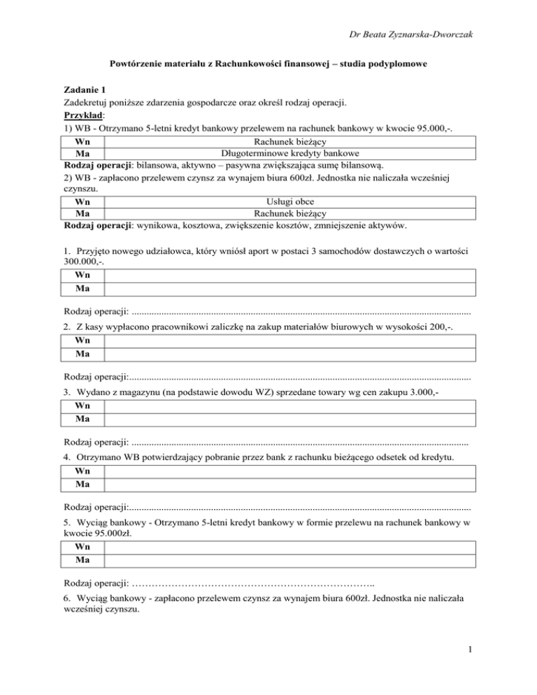 Dr Beata Zyznarska-Dworczak Powtórzenie materiału z Rachunkowości finansowej – studia podyplomowe Zadanie 1 Zadekretuj poniższe zdarzenia gospodarcze oraz określ rodzaj operacji. Przykład: 1) WB - Otrzymano 5-letni kredyt bankowy przelewem na rachunek bankowy w kwocie 95.000,-. Rachunek bieżący Wn Długoterminowe kredyty bankowe Ma Rodzaj operacji: bilansowa, aktywno – pasywna zwiększająca sumę bilansową. 2) WB - zapłacono przelewem czynsz za wynajem biura 600zł. Jednostka nie naliczała wcześniej czynszu. Usługi obce Wn Rachunek bieżący Ma Rodzaj operacji: wynikowa, kosztowa, zwiększenie kosztów, zmniejszenie aktywów. 1. Przyjęto nowego udziałowca, który wniósł aport w postaci 3 samochodów dostawczych o wartości 300.000,-. Wn Ma Rodzaj operacji: ......................................................................................................................................... 2. Z kasy wypłacono pracownikowi zaliczkę na zakup materiałów biurowych w wysokości 200,-. Wn Ma Rodzaj operacji:.......................................................................................................................................... 3. Wydano z magazynu (na podstawie dowodu WZ) sprzedane towary wg cen zakupu 3.000,Wn Ma Rodzaj operacji: ........................................................................................................................................ 4. Otrzymano WB potwierdzający pobranie przez bank z rachunku bieżącego odsetek od kredytu. Wn Ma Rodzaj operacji:.......................................................................................................................................... 5. Wyciąg bankowy - Otrzymano 5-letni kredyt bankowy w formie przelewu na rachunek bankowy w kwocie 95.000zł. Wn Ma Rodzaj operacji: ……………………………………………………………….. 6. Wyciąg bankowy - zapłacono przelewem czynsz za wynajem biura 600zł. Jednostka nie naliczała wcześniej czynszu. 1 Dr Beata Zyznarska-Dworczak Wn Ma Rodzaj operacji: ………………………………………………………………….. 7. Jednostka przeprowadziła regulacje płac pracowników umysłowych, podwyższając średnio miesięczne stawki wynagrodzeń o 10%, przewidywana łączna kwota podwyżki wynosi 60.000 zł. Wn Ma Rodzaj operacji: ………………………………………………………………….. 8. Pracownik przedłożył rozliczenie kosztów podróży służbowej, na którą wcześniej otrzymał zaliczkę w wysokości 500,Wn Ma Rodzaj operacji: ........................................................................................................................... Zadanie 2 (rzeczowe aktywa trwałe) Amortyzacja jest wyższa w początkowym okresie od liniowej, a więc amortyzacja degresywna dla środka trwałego o wartości 20.000 zł i liniowej stawce 30 % będzie wynosiła przy współczynniku podwyższającym 2,0 w dwóch pierwszych latach: - w roku 1. .................. - w roku 2. .................. Zadanie 3 (rzeczowe aktywa trwałe - amortyzacja) Jednostka gospodarcza jest podatnikiem podatku VAT. W marcu 2001 r. zakupiła nową maszynę produkcyjną, której: cena zakupu netto wynosiła 8 000 zł (VAT 22%), koszty transportu 300 zł (+VAT 22%), koszty ubezpieczenia transportu 230 zł (+VAT 22%), koszty montażu 200 zł (+VAT 22%). Maszyna została przekazana do eksploatacji 6 kwietnia 2001 r. Okres eksploatacji maszyny ustalony metodą liniową wyniósł 4 lata, przyjęto jednak, że odpisy amortyzacyjne będą dokonywane przy zastosowaniu metody degresywnej ze współczynnikiem podwyższającym na poziomie 2,0. Ustalić: 1. wartość początkową maszyny ........................ 2. wartość bilansową tej maszyny na dzień 31.12.2001 r. ........................ 3. wartość bilansową tej maszyny na dzień 31.12.2002 r. ........................ 4. wartość bilansową tej maszyny na dzień 31.12.2003 r. ........................ 5. miesiąc ostatniego odpisu amortyzacyjnego maszyny ......................... Zadanie 4 (rzeczowe aktywa trwałe) Sprzedano za gotówkę budynek produkcyjny za 2.440 zł ( w tym VAT 22%) o wartości początkowej 3.000 umorzony w 50 %. Gotówką opłacono koszty związane ze sprzedażą budynku wynoszą 200. Ustal wpływ tej operacji na wynik finansowy. ...................... 2 Dr Beata Zyznarska-Dworczak Zadanie 5 (inwestycje) MAX spółka z o.o. na dzień 31.09.200X r na koncie „Rachunek bieżący” wykazywało saldo 180.000 zł. W październiku otrzymano wyciąg bankowy, potwierdzający następujące operacje: 1) 12.10.200X r. spółka nabyła bon skarbowy o wartości nominalnej 10.000 zł płacąc przelewem 9.400 zł, 2) 18.10.200X r. spółka nabyła 400 akcji spółki „Kolor” po cenie 300 zł za akcję opłacając jednocześnie prowizję maklerską w kwocie 360 zł (uznano ją za koszt istotny), 3) 20.11.200X r. spółka sprzedała połowę akcji spółki „Kolor” uzyskując cenę 320 zł/szt., opłacając prowizję w kwocie 160 zł. Polecenia: 1. Zaksięgować operacje związane z zakupem i sprzedażą papierów wartościowych otwierając odpowiednie konta syntetyczne i analityczne, podając na koncie obok kwoty operacji jej numer. 2. Ustalić wynik na sprzedaży akcji spółki „Kolor” 3. Ustalić bilansową wartość posiadanych na koniec roku krótkoterminowych papierów wartościowych, dokonując przy tym odpowiednich księgowań, wiedząc, że przedsiębiorstwo wycenia papiery wartościowe po cenie nabycia lub cenie rynkowej, w zależności, która z nich jest niższa. Cena rynkowa na 31.12.200X r. posiadanych papierów wartościowych wynosi: akcje spółki „Kolor” 290, bony skarbowe 9350,Wartość krótkoterminowych papierów wartościowych w bilansie ....................... Wynik na sprzedaży akcji spółki „Kolor” ........................ Zadanie 6 (inwestycje) Spółka ,,Aligator” posiadała na dzień 1 grudnia nast