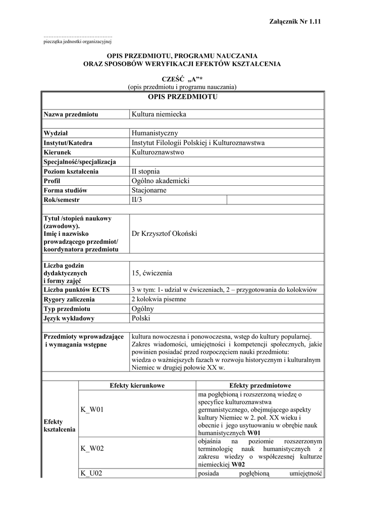 OPIS PRZEDMIOTU Kultura niemiecka Humanistyczny Instytut