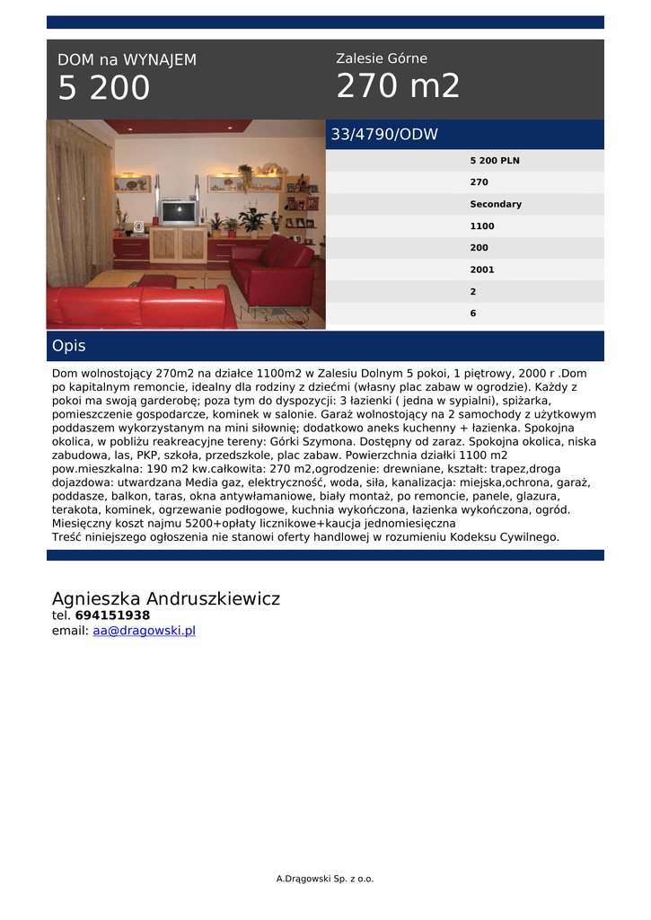 Zalesie Górne DOM na WYNAJEM 270 m2 5 200 33/4790/ODW 5 200 PLN 270 Secondary 1100 200 2001 2 6 Opis Dom wolnostojący 270m2 na działce 1100m2 w Zalesiu Dolnym 5 pokoi, 1 piętrowy, 2000 r .Dom po kapitalnym remoncie, idealny dla rodziny z dziećmi (własny plac zabaw w ogrodzie). Każdy z pokoi ma swoją garderobę; poza tym do dyspozycji: 3 łazienki ( jedna w sypialni), spiżarka, pomieszczenie gospodarcze, kominek w salonie. Garaż wolnostojący na 2 samochody z użytkowym poddaszem wykorzystanym na mini siłownię; dodatkowo aneks kuchenny + łazienka. Spokojna okolica, w pobliżu reakreacyjne tereny: Górki Szymona. Dostępny od zaraz. Spokojna okolica, niska zabudowa, las, PKP, szkoła, przedszkole, plac zabaw. Powierzchnia działki 1100 m2 pow.mieszkalna: 190 m2 kw.całkowita: 270 m2,ogrodzenie: drewniane, kształt: trapez,droga dojazdowa: utwardzana Media gaz, elektryczność, woda, siła, kanalizacja: miejska,ochrona, garaż, poddasze, balkon, taras, okna antywłamaniowe, biały montaż, po remoncie, panele, glazura, terakota, kominek, ogrzewanie podłogowe, kuchnia wykończona, łazienka wykończona, ogród. Miesięczny koszt najmu 5200+opłaty licznikowe+kaucja jednomiesięczna Treść niniejszego ogłoszenia nie stanowi oferty handlowej w rozumieniu Kodeksu Cywilnego. Agnieszka Andruszkiewicz tel. 694151938 email: [email protected] A.Drągowski Sp. z o.o. Powered by TCPDF (www.tcpdf.org)