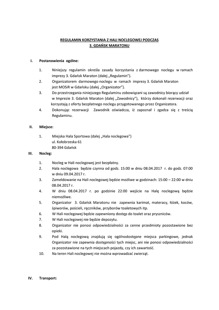 REGULAMIN KORZYSTANIA Z HALI NOCLEGOWEJ PODCZAS 3. GDAŃSK MARATONU I. Postanowienia ogólne: 1. 2. 3. 4. II. Niniejszy regulamin określa zasady korzystania z darmowego noclegu w ramach imprezy 3. Gdańsk Maraton (dalej „Regulamin"). Organizatorem darmowego noclegu w ramach imprezy 3. Gdańsk Maraton jest MOSiR w Gdańsku (dalej „Organizator”). Do przestrzegania niniejszego Regulaminu zobowiązani są zawodnicy biorący udział w Imprezie 3. Gdańsk Maraton (dalej „Zawodnicy”), którzy dokonali rezerwacji oraz korzystają z oferty bezpłatnego noclegu przygotowanego przez Organizatora. Dokonując rezerwacji Zawodnik oświadcza, iż zapoznał i zgadza się z treścią Regulaminu. Miejsce: 1. III. Miejska Hala Sportowa (dalej „Hala noclegowa”) ul. Kołobrzeska 61 80-394 Gdańsk Nocleg: 1. 2. 3. 4. 5. 6. 7. 8. 9. 10. IV. Nocleg w Hali noclegowej jest bezpłatny. Hala noclegowa będzie czynna od godz. 15:00 w dniu 08.04.2017 r. do godz. 07:00 w dniu 09.04.2017 r. Zameldowanie na Hali noclegowej będzie możliwe w godzinach: 15:00 – 22:00 w dniu 08.04.2017 r. W dniu 08.04.2017 r. po godzinie 22:00 wejście na Halę noclegową będzie niemożliwe. Organizator 3. Gdańsk Maratonu nie zapewnia karimat, materacy, łóżek, koców, śpiworów, pościeli, ręczników, przyborów toaletowych itp. W Hali noclegowej będzie zapewniony dostęp do toalet oraz pryszniców. W Hali noclegowej nie będzie depozytu. Organizator nie ponosi odpowiedzialności za cenne przedmioty pozostawione bez opieki. Pod Halą noclegową znajdują się ogólnodostępne miejsca parkingowe, jednak Organizator nie zapewnia dostępności tych miejsc, ani nie ponosi odpowiedzialności za pozostawione na tych miejscach pojazdy, czy ich zawartość. Na teren Hali noclegowej nie można wprowadzać zwierząt. Transport: 1. V. Przeznaczenie : 1. VI. Noclegi przeznaczone są tylko dla zawodników 3. Gdańsk Maratonu, którzy są zarejestrowani, uiścili wpisowe i dokonali rezerwacji noclegowej. Rezerwacja : 1. 2. 3. 4. 5. VII. Organizator zapewnia transport autobusowy osobom korzystającym z bezpłatnego noclegu (wyłącznie w jedną stronę), z miejsca noclegu, umożliwiający dotarcie na start maratonu. Wyjazd spod Hali noclegowej o godzinie 7:00. Liczba miejsc noclegowych jest ograniczona i wynosi 200 osób. O przyznaniu miejsca w Hali noclegowej decyduje kolejność rezerwacji. Zawodnik ma prawo zarezerwować tylko jedno, darmowe miejsce w Hali noclegowej. Rezerwacji można dokonywać tylko za pośrednictwem formularza dostępnego pod adresem: www.gdanskmaraton.pl Zawodnik otrzyma mailową informację zwrotną o potwierdzeniu darmowego noclegu. Rezerwacje będą przyjmowane do dnia 07.04.2017 r. do godz. 12:00 lub do wyczerpania limitu miejsc. Meldunek oraz zasady korzystania z noclegu: 1. 2. 3. 4. 5. 6. 7. 8. Zakwaterowanie odbywać się będzie na podstawie weryfikacji dowodu tożsamości z listą rezerwacji. Wejście do Hali noclegowej TYLKO na podstawie dowodu osobistego. Używanie grzałek elektrycznych oraz otwartego ognia w Hali noclegowej jest zabronione. Pracownik recepcji, z uwagi na bezpieczeństwo, ma prawo odmówić otwarcia obiektu w godzinach 22:00 do 06:00. Na terenie Hali noclegowej obowiązuje bezwzględny zakaz palenia. W przypadku uzasadnionego podejrzenia, iż Zawodnik znajduje się w stanie po spożyciu alkoholu lub innych środków odurzających, nie zostanie on wpuszczony do Hali noclegowej, zaś w przypadku stwierdzenia użycia takich środków przez Zawodnika znajdującego się w Hali noclegowej, będzie on zobowiązany do jej opuszczenia. W hali noclegowej obowiązuje cisza nocna w godzinach od 22:00 do 06:00 Zawodnicy nie stosujący się do poleceń Organizatora i pracowników Hali noclegowej, korzystający z darmowego noclegu lub urządzeń Hali noclegowej w sposób sprzeczny z przeznaczeniem, zasadami współżycia społecznego i Regulaminem, zakłócający spokój pozostałych Zawodników, jak również zachowujący się 9. VIII. agresywnie, mogą zostać pozbawieni prawa do noclegu w trybie doraźnym, co skutkuje koniecznością natychmiastowego opuszczenia Hali noclegowej. Zawodnicy przebywający na terenie Hali noclegowej obowiązane są do stosowania się do znaków informacyjnych nakazu i zakazu umieszczonych na terenie Hali noclegowej oraz stosowania się do poleceń oraz komunikatów Pracowników Organizatora, a także służb. Postanowienia końcowe: 1. 2. 3. 4. Każda osoba korzystająca z darmowego noclegu zobowiązana jest do zaakceptowania niniejszego Regulaminu. Organizator zastrzega sobie prawo do wprowadzania zmian w niniejszym regulaminie. Wiążąca i ostateczna interpretacja niniejszego regulaminu przysługuje wyłącznie Organizatorowi Imprezy. W sprawach nieujętych Regulaminem rozstrzyga Organizator. Jeżeli którekolwiek z postanowień Regulaminu zostanie częściowo lub w całości uznane za nieważne lub niemożliwe do wyegzekwowania – wszelkie inne postanowienia (w całości bądź częściowo) zachowują ważność. Osoby niszczące lub uszkadzające wyposażenie lub urządzenia Hali noclegowej ponoszą pełną odpowiedzialność materialną za wyrządzone szkody.