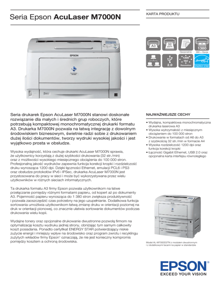 Seria Epson AcuLaser M7000N KARTA PRODUKTU 3 32 ppm 1380 Opcjonalnie 380 + Opcja 1200 dpi Resolution Seria drukarek Epson AcuLaser M7000N stanowi doskonałe rozwiązanie dla małych i średnich grup roboczych, które potrzebują kompaktowej monochromatycznej drukarki formatu A3. Drukarka M7000N pozwala na łatwą integrację z dowolnym środowiskiem biznesowym, świetnie radzi sobie z drukowaniem dużej ilości dokumentów, tworzy wydruki wysokiej jakości i jest wyjątkowo prosta w obsłudze. Wysoka wydajność, która cechuje drukarki AcuLaser M7000N sprawia, że użytkownicy korzystają z dużej szybkości drukowania (32 str./min) oraz z możliwości wysokiego miesięcznego obciążenia do 100 000 stron. Profesjonalną jakość wydruków zapewnia funkcja korekcji kropki i rozdzielczość druku wynosząca 1200 dpi. Dzięki łączności Ethernet, emulacji PCL6 i PS3 oraz obsłudze protokołów IPv6 i IPSec, drukarka AcuLaser M7000N jest przystosowana do pracy w sieci i może być wykorzystywana przez wielu użytkowników w różnych sieciach informatycznych. NAJWAŻNIEJSZE CECHY • Wydajna, kompaktowa monochromatyczna drukarka laserowa A3 • Wysoka wytrzymałość z miesięcznym obciążeniem do 100 000 stron • Drukowanie w formatach od A6 do A3 z szybkością 32 str./min w formacie A4 • Wysoka rozdzielczość 1200 dpi oraz funkcja korekcji kropki • Łączność Gigabit Ethernet, USB 2.0 oraz opcjonalna karta interfejsu równoległego Ta drukarka formatu A3 firmy Epson pozwala użytkownikom na łatwe przełączanie pomiędzy różnymi formatami papieru, od kopert aż po dokumenty A3. Pojemność papieru wynosząca do 1 380 stron zwiększa produktywność i pozwala zaoszczędzić czas potrzebny na jego uzupełnianie. Dodatkowa funkcja sortowania umożliwia użytkownikom łatwą zmianę druku w orientacji poziomej na druk w orientacji pionowej, co znacznie ułatwia sortowanie dokumentów podczas drukowania wielu kopii. Wydajne tonery oraz opcjonalne drukowanie dwustronne pozwolą firmom na optymalizację kosztu wydruku jednej strony, obniżając tym samym całkowity koszt posiadania. Ponadto certyfikat ENERGY STAR potwierdzający niskie zużycie energii i mniejszy wpływ na środowisko oraz program zwrotu i recyklingu zużytych wkładów firmy Epson1 oznaczają, że nie jest konieczny kompromis pomiędzy kosztem a ochroną środowiska. Model AL‑M7000D2TN z modułem dwustronnym i z dodatkowymi tacami na papier w standardzie Seria Epson AcuLaser M7000N DANE TECHNICZNE PRODUKTU TECHNOLOGIA Rozdzielczość druku DRUKOWANIE Szybkość druku Szybkość druku dwustr. Czas drukowania pierwszej strony Czas nagrzewania Maksymalne obciążenie miesięczne Monochromatyczna drukarka laserowa i elektrofotograficzna A3 Do 1200 × 1200 dpi Do 32 str./min (mono A4) Do 21,4 str./min (mono A4) Poniżej 8,5 s (mono A4) Poniżej 16 s lub mniej (od trybu uśpienia do trybu „gotowy do druku”) Do 100 000 stron ŁĄCZNOŚĆ Interfejs standardowy Interfejs opcjonalny Protokoły drukowania sieciowego Gigabit Ethernet, High Speed USB Złącze typu B, interfejs równoległy (przez slot typu B) TCP/IPv4, TCP/IPv6, IPSec, SNMP, HTTP, DHCP (tylko IPv4), BOOTP (tylko IPv4), APIPA (tylko IPv4) PING (tylko IPv4), DDNS, mDNS, SNTP, SSDP (tylko IPv4), ENPC (tylko IPv4), SLP, WSD, LLTD Protokoły zarządzania sieciowego TCP/IPv4, TCP/IPv6, IPSec, LPR, FTP, IPP, PORT9100, WSD, tylko Net BIOS over TCP/IPv4, AppleTalk OBSŁUGA PAPIERU Standardowe podawanie papieru Format papieru Druk dwustronny Gramatura papieru Odbiór papieru Opcjonalne podawanie papieru Maksymalna pojemność papieru WYMAGANIA DOTYCZĄCE ZASILANIA Zużycie energii 970 W (maksymalne), 544 W (średnio podczas drukowania), 82 W (gotowość), 4,7 W (uśpienie), 0 W (wyłączone zasilanie) 220–240 V ± 10% 5,5 A lub mniej 50 Hz/60 Hz ± 3 Hz WYMIARY (szer.×gł.×wys.) Od 518 × 414,5 × 333 mm do 518 × 463,5 × 519 mm WAGA (bez materiałów eksploatacyjnych) Od 21 kg do 35,2 kg Obsługa Mac Sterowniki INNE FUNKCJE Normy środowiskowe Procesor Pamięć Emulacje języka sterowania drukarki Wbudowane kroje czcionek Drukowanie: 7,13 B, tryb gotowości: 5,60 B Drukowanie: 54 dB, tryb gotowości: 33 dB Podczas pracy: 5–35°C, przechowywanie: 0–35°C Podczas pracy: 15–85% wilgotności względnej, przechowywanie: 5–85% wilgotności względnej Windows 7 (32 bit/64 bit) / Windows Vista (32bit/64bit) / Windows XP (32 bit/64 bit) / Server 2008 (32 bit/64 bit) / Server 2008R2 (64 bit) / Server 2003 (32 bit/64 bit) Mac OS 10.4.11 lub nowszy ESC/Page Driver, PCL6 (tylko Windows), PostScript Driver, XPS Driver (tylko Windows) Certyfikat ENERGY STAR 288 MHz Standardowa: 64 MB, maksymalna: 320 MB LCD Adobe PostScript3, PCL5e, PCL6, PDF1.6, ESC/Page, FX, ESCP2, I239X Skalowalne: 84 ESC/Page, 95 PCL5c, 80 PCL6, 136 PS3 Bitmapowe: 7 ESC/Page, 5 PCL5c, 1 PCL6 Kroje czcionek: 10 ESC/P2, 8 FX, 8 I239X LCD 5 wierszy × 22 znaki GWARANCJA Standardowo Opcjonalnie 1 rok, na miejscu 3 lata, na miejscu (ECPGRP50) AcuLaser M7000N Series_ds_1PL_02/12 1 Program zwrotu i recyklingu firmy Epson nie jest dostępny we wszystkich krajach 2 Raporty z testów wydajności wg ISO/IEC19798 oraz ISO/IEC24712 3 Standard w wybranych modelach Epson Europe B.V. Sp. z o.o. Oddział w Polsce ul. Bokserska 66 02‑690 Warszawa Tel.: +48 22 375 7500 Faks: +48 22 375 7501 C11CB61011 • AcuLaser M7000N (obsługa sieci) • AcuLaser M7000DN C11CB61011BZ (druk. dwustr. i obsługa sieci) • AcuLaser M7000TN C11CB61011BV (dodatkowa taca na papier i obsługa sieci) • AcuLaser M7000DTN C11CB61011BT (druk. dwustr., dodatkowa taca na papier i obsługa sieci) • AcuLaser M7000D2TN C11CB61011BR (druk. dwustr., 2 dodatkowe tace na papier i obsługa sieci) ZAWARTOŚĆ OPAKOWANIA Od 380 do 1 380 arkuszy (w zależności od wybranego modelu) A3, A4, A5, A6, B4, B5, LT, HLT, LGL, GLT, GLG, EXE, F4, B (Ledger), Monarch, Com‑10, DL, C5, C6, ISO‑B5, ustawienia użytkownika: długość 98,4–508 mm, s
