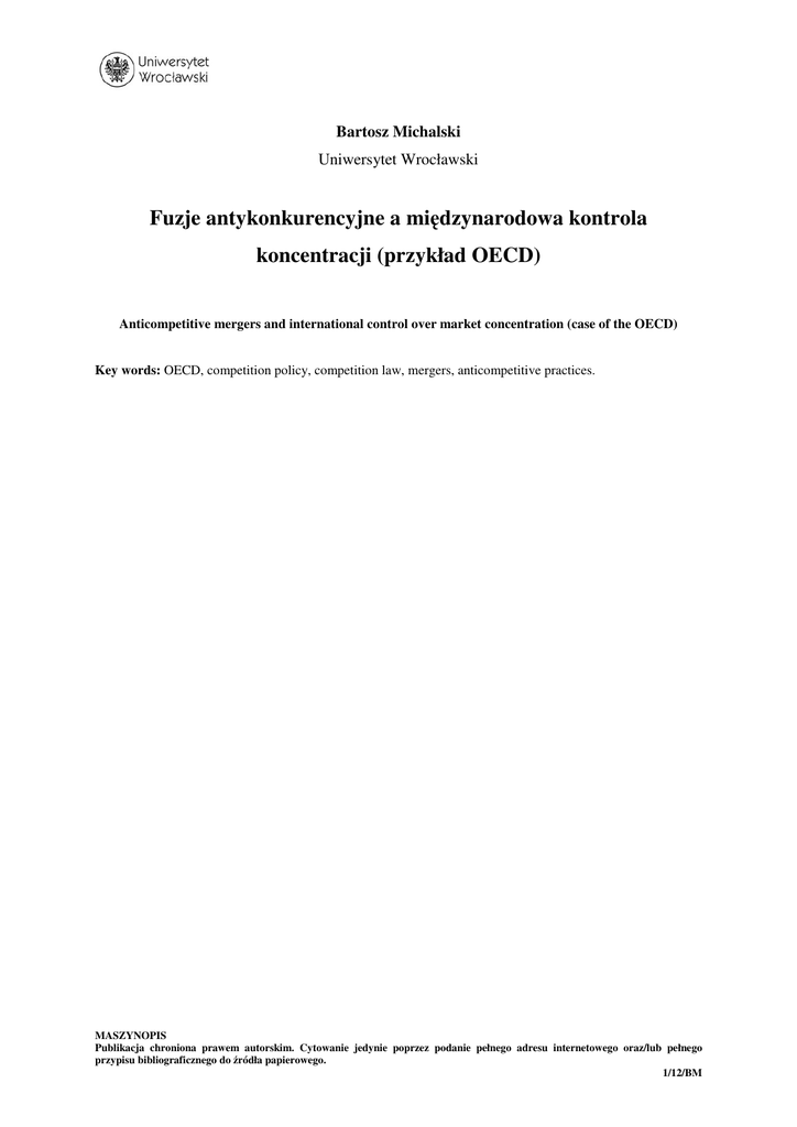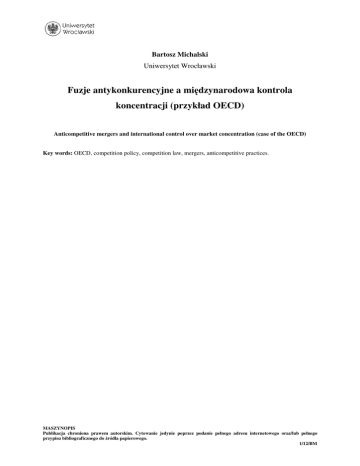 Bartosz Michalski Uniwersytet Wrocławski Fuzje antykonkurencyjne a międzynarodowa kontrola koncentracji (przykład OECD) Anticompetitive mergers and international control over market concentration (case of the OECD) Key words: OECD, competition policy, competition law, mergers, anticompetitive practices. MASZYNOPIS Publikacja chroniona prawem autorskim. Cytowanie jedynie poprzez podanie pełnego adresu internetowego oraz/lub pełnego przypisu bibliograficznego do źródła papierowego. 1/12/BM WPROWADZENIE Intensyfikacja presji konkurencyjnej w gospodarce światowej będąca następstwem liberalizacji handlu oraz coraz skuteczniejszego stosowania prawa konkurencji zarówno na poziomie krajowym1, jak i międzynarodowym2 wymogła szereg dostosowań pośród samych przedsiębiorstw. Stało się tak, gdyż instytucje działające na rzecz zniesienia zbędnych barier w międzynarodowej wymianie (generujących dla międzynarodowego biznesu szereg możliwych do uniknięcia kosztów transakcyjnych) dostrzegły również, że wzmocnienie konkurencji na poziomie globalnym może jednocześnie prowadzić do zachowań, konsekwencją których byłaby częściowa lub całkowita utrata korzyści wynikających z liberalizacji. Z kolei wzmożona konkurencja zmusza przedsiębiorstwa do konieczności utrzymywania pełnej gotowości kapitału ludzkiego, intelektualnego, rzeczowego i finansowego, co z punktu widzenia właścicieli poprzez dodatkowe koszty ogranicza w pewnym stopniu pulę oczekiwanych (satysfakcjonujących) zysków. Tym samym racjonalnym działaniem jest, by dynamikę ekspansji firmy ukierunkować wedle scenariusza przynoszącego maksymalizację korzyści, co może jednak stać w sprzeczności z obowiązującym prawem. Przełom lat 2008/2009 to okres, w którym w gospodarce światowej doszło do intensyfikacji zjawisk kryzysowych mających swoje źródło m.in. w nieodpowiedzialnej polityce amerykańskich instytucji finansowych. Wobec rysujących się problemów oraz spadającej wartości wielu przedsiębiorstw pojawia się szansa, by podmioty, które zgromadziły wystarczające środki na inwestycje, dokonały wrogich przejęć, względnie by dokonały konsolidacji (połączyły się) i wspólnymi siłami przezwyciężyły niekorzystne tendencje. Takie zjednoczenie sił umożliwia przede wszystkim jeszcze bardziej efektywne wykorzystanie posiadanego przez przedsiębiorstwa potencjału (kapitału) intelektualnego, uznawanego współcześnie za jeden z kluczowych czynników konkurencyjności. 1 Prawo konkurencji jest tutaj rozumiane jako ogół regulacji generalnie zabraniających stosowania praktyk wymierzonych w sedno procesu rywalizacji rynkowej (porozumienia kartelowe, nadużywanie pozycji dominującej, koncentracja rynkowa, korzystanie ze wsparcia publicznego). Służy ono w ramach prowadzonej polityki gospodarczej za instrument budowy ładu rynkowego, czyli osiągnięcia takiego natężenia konkurencji w poszczególnych branżach, które modelowo rzecz ujmując pozwala realizować szereg korzyści, przede wszystkim stymulując proces innowacyjny. 2 Organizacjami o międzynarodowym zasięgu działania, które prowadzą prace zmierzające ku skoordynowaniu polityki konkurencji są przede wszystkim Światowa Organizacja Handlu (WTO; choć od roku 2004 jej prace w tym zakresie są tymczasowo zawieszone), Organizacja Współpracy Gospodarczej i Rozwoju (OECD), Konferencja Narodów Zjednoczonych ds. Handlu i Rozwoju (UNCTAD) oraz Międzynarodowa Sieć Konkurencji (ICN). MASZYNOPIS Publikacja chroniona prawem autorskim. Cytowanie jedynie poprzez podanie pełnego adresu internetowego oraz/lub pełnego przypisu bibliograficznego do źródła papierowego. 2/12/BM Wśród najczęściej wskazywanych motywów koncentracji rynkowej wymienia się te o charakterze ofensywnym, sprzyjającym podnoszeniu efektywności — integrację łańcucha wartości w celu obniżki kosztów transakcyjnych, czy dostęp do nowych technologii i zasobów, motyw defensywny — obronę przed konkurencją oraz motyw, który można określić mianem mieszanego (gdyż niejako łączy dwa poprzednie) — eliminację konkurencji. Niniejsze opracowanie poświęcone jest temu ostatniemu zagadnieniu w kontekście działań, jakie podejmuje wspólnota międzynarodowa, by proces konkurencji poprzez nadmierną koncentrację rynkową nie ulegał ograniczeniu. Z uwagi na objętość artykułu uwaga została skoncentrowana na syntetycznej prezentacji prac prowadzonych na forum Organizacji Współpracy Gospodarczej i Rozwoju (OECD). DZIAŁANIA KOMITETU DS. PRAWA I POLITYKI KONKURENCJI OECD W ZAKRESIE KONTROLI KONCENTRACJI RYNKOWEJ Komitet ds. Prawa i Polityki Konkurencji działający w strukturze OECD w obrębie zagadnień powiązanych z procesem łączenia się firm ukierunkował własne prace przede wszystkim na przegląd zagadnień związanych z fuzjami (fuzje poziomie, pionowe 3 i konglomeratowe 4 ), zidentyfikowanie ich potencjalnie antykonkurencyjnego charakteru, z którego z kolei wynika obowiązek notyfikacji zamiaru połączenia oraz koordynację działań na płaszczyźnie międzynarodowej z uwagi na postępujące umiędzynarodowienie tego problemu (fuzje transnarodowe). Całość została w roku 2005 zwieńczona przyjęciem rekomendacji dotyczącej przeglądu fuzji (zob. dalej). Pierwszym kompleksowym dokumentem dotyczącym procesu łączenia przedsiębiorstw było przygotowane w 1994 roku obszerne studium na temat głośnych w owym czasie przypadków (zob. szerzej OECD 1994). Przeanalizowano w nim także kształt 3 Odnośnie antykonkurencyjnych efektów tego rodzaju połączenia spotkać się można z wieloma opiniami, gdyż za pierwszorzędny motyw takiej fuzji uznaje się zazwyczaj dążenie do obniżki kosztów transakcyjnych, czy poprawy efektywności (ang. typical efficiency enhancing). Mogą one jednak skłonić taki podmiot do praktyk wymierzonych w konkurencję (zob. szerzej OECD 2007). 4 Fuzje konglomeratowe to poł