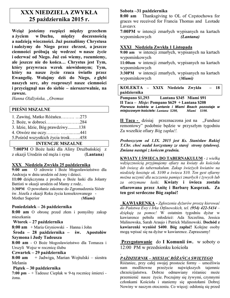 XXX NIEDZIELA ZWYKŁA 25 października 2015 r. Wciąż jesteśmy rozpięci między grzechem a życiem w Duchu, między doczesnością a nadzieją wieczności. Już poznaliśmy Chrystusa i należymy do Niego przez chrzest, a jeszcze ciemności próbują się wedrzeć w nasze życie i oderwać od Niego. Już coś wiemy, rozumiemy, ale jeszcze nie do końca… Chrystus jest Tym, który przywraca wzrok niewidomym; Tym, który na nasze życie rzuca światło przez Ewangelię. Wołajmy dziś do Niego, z głębi naszych serc, aby rozproszył nasze ciemności i przyciągnął nas do siebie – nierozerwalnie, na zawsze. Hanna Ożdżyńska, „Oremus PIEŚNI MSZALNE 1. Zawitaj, Matko Różańca……… …273 2. Boże, w dobroci…………….…….284 3. Idzie, Idzie, Bóg prawdziwy..........138 4. Otwórz me oczy……… ……..…...441 5.Pośród wszystkich życia trosk…….458 INTENCJE MSZALNE 7:00PM O Boże łaski dla Aliny Drużbańskiej z z okazji Urodzin od męża i syna (Lantana) XXX Niedziela Zwykła 25 października 9:00 am O zdrowie i Boże błogosławieństwo dla Andrzeja w dniu urodzin od żony i dzieci. 11:00 dziękczynna z prośbą o Boże łaski dla Jolanty Battisti w okazji urodzin od Mamy z rodz.. 3:30PM O powołanie zakonne do Zgromadzenia Sióstr św. Józefa z okazji Roku życia konsekrowanego Mother Superior (Miami) Poniedziałek – 26 października 8:00 am O obronę przed złem i pomyślny zakup mieszkania Wtorek – 27 października 8:00 am + Maria Gryniowski - Hanna i John Środa – 28 października – św. Apostołów Szymona i Judy Tadeusza 8:00 am - O Boże błogosławieństwo dla Tomasza i Urszyli Wojsz w rocznicę ślubu Czwartek – 29 października 8:00 am + Jadwiga, Marian Wojtulski – siostra Melania Piątek – 30 października 7:00 pm – + Tadeusz Cieplak w 9-tą rocznicę śmierci żona. Sobota –31 października 8:00 am Thanksgiving to OL of Częstochowa for graces we received for Francia Thomas and Leotade Laveavx 7:00PM w intencji zmarłych wypisanych na kartach wypominkowych (Lantana) XXXI Niedziela Zwykła 1 Listopada 9:00 am w intencji zmarłych, wypisanych na kartach wypominkowych 11:00am w intencji zmarłych, wypisanych na kartach wypominkowych 3:30PM w intencji zmarłych, wypisanych na kartach wypominkowych (Miami) KOLEKTA – XXIX Niedziela Zwykła – 18 października Pompano $1,293 Lantana $345 Miami $91 II Taca – Misje: Pompano $629 + Lantana $208 Pierwsza kolekta w Lantanie i Miami Beach pozostaje w miejscowym kościele: Lantana $200, Miami $100. II Taca - dzisiaj przeznaczona jest na „Fundusz remontowy” podobnie będzie w przyszłym tygodniu Za wszelkie ofiary Bóg zapłać!. Proboszczem od 1.IX. 2015 jest Ks. Stanisław Rakiej T.Chr. choć nadal korzystamy ze starej strony tytułowej. Zmiana nastąpi z końcem grudnia. KWIATY I ŚWIECA DO TABERNAKULUM - z wielką wdzięcznością przyjmujemy ofiary na kwiaty do kościoła lub świecę do tabernakulum. Zakup świeżych kwiatów na niedzielę kosztuje ok. $100 a świeca $10. Ten gest ofiarny można uczynić dla uczczenia pamięci zmarłych i żywych lub za otrzymane łaski. Kwiaty i świeca została ofiarowana przez Anitę i Barbarę Kasprzak. Za ten gest serdeczne Bóg zapłać! KAWIARENKA - Zgłoszenia dyżurów proszę kierować do Państwa Ewy i Irka Otfinowskich, tel. (954) 422-5434 – dziękuję za pomoc! W ostatnim tygodniu dyżur w kawiarence pełniła młodzież: Ada Szczelina, Jessica Malinowska, Sarah Araujo i Patrick Malinowski. Dochód z kawiarenki wyniósł $400. Bóg zapłać! Kolejne osoby mogą wpisać się na dyżur w kawiarence. Zapraszamy! Przygotowanie do I Komunii św. w soboty o 12:00 PM w przedsionku kościoła . PAŹDZIERNIK – MIESIĄC RÓŻAŃCA SWIĘTEGO Różaniec, przy całej swojej prostocie formy – umożliwia nam modlitewne przeżycie największych tajemnic chrześcijaństwa. Dobrze odmawiany różaniec może przemienić nasze życie. Poczujmy się żywymi, czynnymi członkami Kościoła i staniemy się apostołami Dobrej Nowiny w naszym otoczeniu. Co więcej: odsłonią się przed nami tajemnice zjednoczonych Serc Jezusa i Maryi, Boga- Człowieka i Tej, której cała wielkość wyraziła się w prostym akcie woli: Oto ja Służebnica Pańska. Zapraszamy na Nabożeństwo Różańcowe w piątki po mszy św. NOWI PARAFIANIE Witamy serdecznie kolejną rodzinę w naszej Wspólnocie Parafialnej: Jerzy & Danuta Rynkiewicz OGŁOSZENIA BIZNESOWE W BIULETYNIE -osoby, firmy czy organizacje, pragnące na stałe ogłaszać się w biuletynie proszone są o kontakt z biurem Misji (954) 545-3861. Przypominam, iż koszt ogłoszenia wynosi $350 na rok. Kolejna edycja biuletynu ukaże się na Boże Narodzenie. TELEFONY KOMÓRKOWE Bardzo proszę o wyłączanie swoich telefonów przed wejściem do kościoła. Dziękuję za współpracę. OGŁOSZENIA POLONIJNE Na zabawę „Halloween” godz. 7:30 pm wstęp $10 rezerwacja Jola 954-709-0605 Kopertki na wypominki wyłożone są w przedsionku kościoła. Wiara to twórczość Miał czterdzieści pięć lat i wyższe wykształcenie. Wiele udzielał się w pracy społecznej. Lekarze odkryli, że na jego żołądku rośnie guz. Pobrano wycinek do analizy. On przerażony uwierzył, że ma raka. Uwierzył. Nie pomogły perswazje. Załatwiał wszystkie sprawy tak, by je wykończyć i oddać w cudze ręce. Porządkował mieszkanie. Oddawał rzeczy pożyczone. Stopniowo wyłączył się z wszelkiej pracy. Był coraz słabszy, nie wychodził z domu, nie mógł jeść, coraz częściej leżał i czekał na zbliżającą się śmierć. Lekarze bezradnie rozkładali ręce. Wiedzieli, że nie jest chory, ale wiedzieli również, że jeśli nie uwierzy, że jest zdrowy, to wkrótce umrze. Do dziś nie wiadomo, kto lub co wpłynęło na zmianę jego podejścia — uwierzył, że nie ma raka. Po miesiącu wrócił do zdrowia i pracy. Uwierzył, że może żyć, i żyje. Od tego głębokiego kryzysu upłynęło ponad piętnaście 