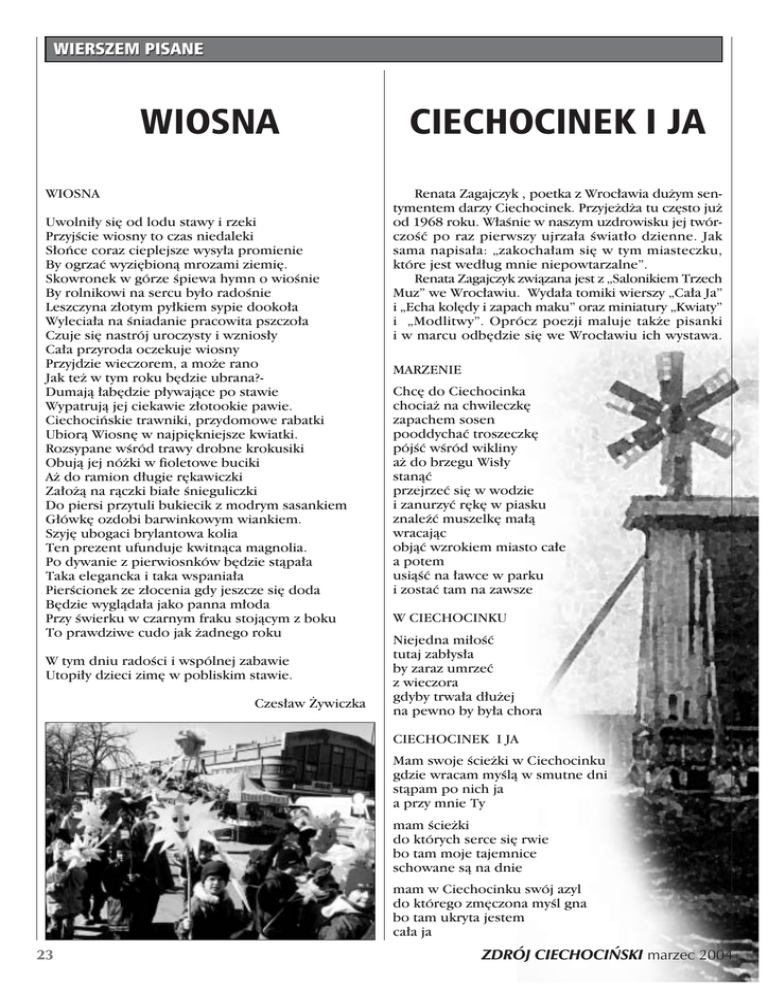 WIERSZEM PISANE WIOSNA WIOSNA Uwolni∏y si´ od lodu stawy i rzeki PrzyjÊcie wiosny to czas niedaleki S∏oƒce coraz cieplejsze wysy∏a promienie By ogrzaç wyzi´bionà mrozami ziemi´. Skowronek w górze Êpiewa hymn o wioÊnie By rolnikowi na sercu by∏o radoÊnie Leszczyna z∏otym py∏kiem sypie dooko∏a Wylecia∏a na Êniadanie pracowita pszczo∏a Czuje si´ nastrój uroczysty i wznios∏y Ca∏a przyroda oczekuje wiosny Przyjdzie wieczorem, a mo˝e rano Jak te˝ w tym roku b´dzie ubrana?Dumajà ∏ab´dzie p∏ywajàce po stawie Wypatrujà jej ciekawie z∏otookie pawie. Ciechociƒskie trawniki, przydomowe rabatki Ubiorà Wiosn´ w najpi´kniejsze kwiatki. Rozsypane wÊród trawy drobne krokusiki Obujà jej nó˝ki w fioletowe buciki A˝ do ramion d∏ugie r´kawiczki Za∏o˝à na ràczki bia∏e Ênieguliczki Do piersi przytuli bukiecik z modrym sasankiem G∏ówk´ ozdobi barwinkowym wiankiem. Szyj´ ubogaci brylantowa kolia Ten prezent ufunduje kwitnàca magnolia. Po dywanie z pierwiosnków b´dzie stàpa∏a Taka elegancka i taka wspania∏a PierÊcionek ze z∏ocenia gdy jeszcze si´ doda B´dzie wyglàda∏a jako panna m∏oda Przy Êwierku w czarnym fraku stojàcym z boku To prawdziwe cudo jak ˝adnego roku W tym dniu radoÊci i wspólnej zabawie Utopi∏y dzieci zim´ w pobliskim stawie. Czes∏aw ˚ywiczka CIECHOCINEK I JA Renata Zagajczyk , poetka z Wroc∏awia du˝ym sentymentem darzy Ciechocinek. Przyje˝d˝a tu cz´sto ju˝ od 1968 roku. W∏aÊnie w naszym uzdrowisku jej twórczoÊç po raz pierwszy ujrza∏a Êwiat∏o dzienne. Jak sama napisa∏a: „zakocha∏am si´ w tym miasteczku, które jest wed∏ug mnie niepowtarzalne”. Renata Zagajczyk zwiàzana jest z „Salonikiem Trzech Muz” we Wroc∏awiu. Wyda∏a tomiki wierszy „Ca∏a Ja” i „Echa kol´dy i zapach maku” oraz miniatury „Kwiaty” i „Modlitwy”. Oprócz poezji maluje tak˝e pisanki i w marcu odb´dzie si´ we Wroc∏awiu ich wystawa. MARZENIE Chc´ do Ciechocinka chocia˝ na chwileczk´ zapachem sosen pooddychaç troszeczk´ pójÊç wÊród wikliny a˝ do brzegu Wis∏y stanàç przejrzeç si´ w wodzie i zanurzyç r´k´ w piasku znaleêç muszelk´ ma∏à wracajàc objàç wzrokiem miasto ca∏e a potem usiàÊç na ∏awce w parku i zostaç tam na zawsze W CIECHOCINKU Niejedna mi∏oÊç tutaj zab∏ys∏a by zaraz umrzeç z wieczora gdyby trwa∏a d∏u˝ej na pewno by by∏a chora CIECHOCINEK I JA Mam swoje Êcie˝ki w Ciechocinku gdzie wracam myÊlà w smutne dni stàpam po nich ja a przy mnie Ty mam Êcie˝ki do których serce si´ rwie bo tam moje tajemnice schowane sà na dnie mam w Ciechocinku swój azyl do którego zm´czona myÊl gna bo tam ukryta jestem ca∏a ja 23 ZDRÓJ CIECHOCI¡SKI marzec 2004