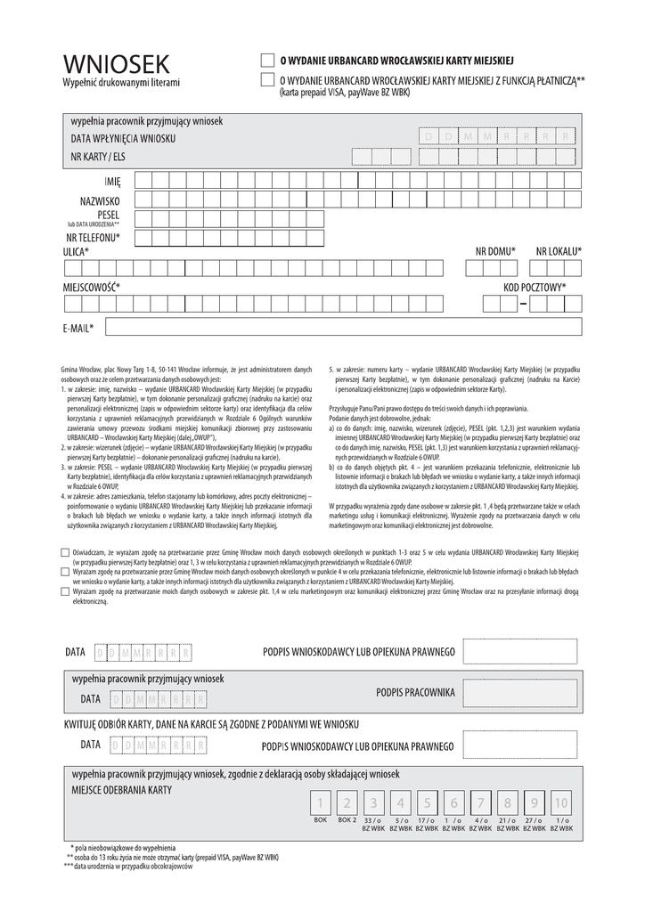 PESEL lub DATA URODZENIA** Gmina Wrocław, plac Nowy Targ 1-8, 50-141 Wrocław informuje, że jest administratorem danych osobowych oraz że celem przetwarzania danych osobowych jest: 1. w zakresie: imię, nazwisko – wydanie URBANCARD Wrocławskiej Karty Miejskiej (w przypadku pierwszej Karty bezpłatnie), w tym dokonanie personalizacji graficznej (nadruku na karcie) oraz personalizacji elektronicznej (zapis w odpowiednim sektorze karty) oraz identyfikacja dla celów korzystania z uprawnień reklamacyjnych przewidzianych w Rozdziale 6 Ogólnych warunków zawierania umowy przewozu środkami miejskiej komunikacji zbiorowej przy zastosowaniu URBANCARD – Wrocławskiej Karty Miejskiej (dalej „OWUP”), 2. w zakresie: wizerunek (zdjęcie) – wydanie URBANCARD Wrocławskiej Karty Miejskiej (w przypadku pierwszej Karty bezpłatnie) – dokonanie personalizacji graficznej (nadruku na karcie), 3. w zakresie: PESEL – wydanie URBANCARD Wrocławskiej Karty Miejskiej (w przypadku pierwszej Karty bezpłatnie), identyfikacja dla celów korzystania z uprawnień reklamacyjnych przewidzianych w Rozdziale 6 OWUP, 4. w zakresie: adres zamieszkania, telefon stacjonarny lub komórkowy, adres poczty elektronicznej – poinformowanie o wydaniu URBANCARD Wrocławskiej Karty Miejskiej lub przekazanie informacji o brakach lub błędach we wniosku o wydanie karty, a także innych informacji istotnych dla użytkownika związanych z korzystaniem z URBANCARD Wrocławskiej Karty Miejskiej, 5. w zakresie: numeru karty – wydanie URBANCARD Wrocławskiej Karty Miejskiej (w przypadku pierwszej Karty bezpłatnie), w tym dokonanie personalizacji graficznej (nadruku na Karcie) i personalizacji elektronicznej (zapis w odpowiednim sektorze Karty). Przysługuje Panu/Pani prawo dostępu do treści swoich danych i ich poprawiania. Podanie danych jest dobrowolne, jednak: a) co do danych: imię, nazwisko, wizerunek (zdjęcie), PESEL (pkt. 1,2,3) jest warunkiem wydania imiennej URBANCARD Wrocławskiej Karty Miejskiej (w przypadku pierwszej Karty bezpłatnie) oraz co do danych imię, nazwisko, PESEL (pkt. 1,3) jest warunkiem korzystania z uprawnień reklamacyjnych przewidzianych w Rozdziale 6 OWUP. b) co do danych objętych pkt. 4 – jest warunkiem przekazania telefonicznie, elektronicznie lub listownie informacji o brakach lub błędach we wniosku o wydanie karty, a także innych informacji istotnych dla użytkownika związanych z korzystaniem z URBANCARD Wrocławskiej Karty Miejskiej. W przypadku wyrażenia zgody dane osobowe w zakresie pkt. 1 ,4 będą przetwarzane także w celach marketingu usług i komunikacji elektronicznej. Wyrażenie zgody na przetwarzania danych w celu marketingowym oraz komunikacji elektronicznej jest dobrowolne. Oświadczam, że wyrażam zgodę na przetwarzanie przez Gminę Wrocław moich danych osobowych określonych w punktach 1-3 oraz 5 w celu wydania URBANCARD Wrocławskiej Karty Miejskiej (w przypadku pierwszej Karty bezpłatnie) oraz 1, 3 w celu korzystania z uprawnień reklamacyjnych przewidzianych w Rozdziale 6 OWUP. Wyrażam zgodę na przetwarzanie przez Gminę Wrocław moich danych osobowych określonych w punkcie 4 w celu przekazania telefonicznie, elektronicznie lub listownie informacji o brakach lub błędach we wniosku o wydanie karty, a także innych informacji istotnych dla użytkownika związanych z korzystaniem z URBANCARD Wrocławskiej Karty Miejskiej. Wyrażam zgodę na przetwarzanie moich danych osobowych w zakresie pkt. 1,4 w celu marketingowym oraz komunikacji elektronicznej przez Gminę Wrocław oraz na przesyłanie informacji drogą elektroniczną. ** *** data urodzenia w przypadku obcokrajowców