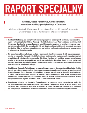 Raport Specjalny 0 9 . 0 7. 2 0 0 8 | o ś r o d e k s t u d i ó w w s c h o d n i c h i m . m a r k a k a r p i a Abchazja, Osetia Południowa, Górski Karabach: rozmrożone konflikty pomiędzy Rosją a Zachodem Wojciech Bar tuzi, Kat arzyna Pełczyńska-Nałęcz, Krzysztof Strachot a współpraca : Maciej Falkowski i Wojciech Górecki ● Kaukaz Południowy jest areną trzech nierozwiązanych od lat zbrojnych konfliktów separatystycznych – w Gruzji są to konflikty w Abchazji i Osetii Południowej; w Azerbejdżanie konflikt wokół Górskiego Karabachu (wraz z obszarami wokół Karabachu zajętymi w wyniku wojny przez separatystów ormiańskich). Od początku lat 90. ani Gruzja, ani Azerbejdżan nie kontrolują spornych terytoriów. Oba te państwa skonfliktowane są także z nieformalnymi patronami separatystów – odpowiednio Rosją i Armenią. ● Po ponad dekadzie względnego spokoju i zamrożenia konfliktów doszło do ich znacznego zaostrzenia: w przypadku Abchazji i Osetii Południowej istnieje groźba wybuchu walk na dużą skalę już w najbliższych miesiącach, w przypadku Górskiego Karabachu i konfliktu azersko-ormiańskiego groźba ta jest realna w perspektywie najbliższych pięciu lat. Istniejąca dotąd formuła politycznej regulacji konfliktów jest nieefektywna i bliska wyczerpania, a perspektywa wypracowania alternatywnych planów pokojowych odległa. ● Konflikty na Kaukazie Południowym w coraz większym stopniu dotyczą również Zachodu. Jest to przede wszystkim związane z jego stale rosnącym zaangażowaniem politycznym (wsparcie reform) i gospodarczym (m.in. budowa infrastruktury przesyłu gazu i ropy) w Gruzji i Azerbejdżanie, a także, choć w mniejszym stopniu, w Armenii. Wybuch otwartych walk wokół separatyzmów prowadziłby do destabilizacji Południowego Kaukazu, w znacznym stopniu przekreślając działania podjęte wobec regionu przez UE, NATO i USA w ostatnich latach. ● Dodatkowo sytuacja na Kaukazie Południowym, a zwłaszcza same separatyzmy stały się de facto elementem rozgrywki geopolitycznej między Zachodem a Rosją, w której stawką jest ze strony Rosji utrzymanie wpływów w regionie, ze strony Zachodu zaś demonstracja zdolności do efektywnego promowania w krajach sąsiedzkich demokracji i modernizacji gospodarczej. O S W. W A W. P L Raport specjalny 0 9 . 0 7. 2 0 0 8 | ośrodek studiów wschodnich im. marka karpia Mapa. Konflik t y na Kaukazie Południow ym Wojciech Mańkowski © OSW Geneza Konflikty w Abchazji, Osetii Południowej i Górskim Karabachu wybuchły na przełomie lat 80. i 90. w związku z rozpadaniem się ZSRR. Były efektem zadawnionych konfliktów etnicznych (gruzińsko-abchaskiego, gruzińsko-osetyjskiego i azersko-ormiańskiego), wybuchu nacjonalizmów oraz dążeń niepodległościowych Gruzji i Azerbejdżanu na fali pierestrojki. Przy kluczowej pomocy Rosji (w przypadku Karabachu za pośrednictwem Armenii) separatyści w wyniku konfliktów zbrojnych przejęli kontrolę nad spornymi obszarami i obronili swoją niezależność od Gruzji i Azerbejdżanu. Na kontrolowanych przez siebie obszarach utworzyli nieuznane przez społeczność międzynarodową organizmy parapaństwowe, będące de facto protektoratami Rosji (Abchazja i Osetia Południowa) oraz Armenii (Górski Karabach). Dynamika „Gorąca faza konfliktów” zakończyła się w połowie lat 90. rozejmami zawartymi pod dyktando Rosji i auspicjami ONZ (Abchazja) oraz OBWE (Osetia Południowa, Karabach – tzw. Mińska Grupa OBWE). Przez niemal dekadę przy udziale patronów porozumień rozejmowych oraz stron konfliktów trwały rokowania, które nie doprowadziły jednak do postępu w kwestii rozwiązania sporów. Stopniowe rozmrażanie konfliktów rozpoczęło się ok. 2004. U źródeł tego zjawiska legły dwa czynniki: O S W. W A W. P L Raport specjalny 0 9 . 0 7. 2 0 0 8 | ośrodek studiów wschodnich im. marka karpia 1) Okrzepnięcie państwowości i gospodarek Azerbejdżanu i Gruzji (intensywny program reform po 2003 r.), związane głównie z rozwojem sektora energetycznego i infrastruktury transportowej. Skutkiem tych zmian jest wzrost potencjału – m.in. militarnego – Gruzji i Azerbejdżanu, a także rosnąca kontestacja dotychczasowych mechanizmów rozwiązywania konfliktów oraz determinacja w działaniach na rzecz odzyskania integralności terytorialnej. 2) Wzrastające zaangażowanie w regionie Zachodu (m.in. wdrożenie Europejskiej Polityki Sąsiedztwa, a także otwarcie perspektyw członkowskich w NATO dla Gruzji). Aktywność ta została odebrana przez Rosję jako zagrażająca jej wpływom na Kaukazie. Separatyzmy zaś zostały potraktowane przez Moskwę jako instrument w geopolitycznej konkurencji z Zachodem. W efekcie, zwłaszcza w ostatnim roku, doszło do zdecydowanego nasilenia incydentów zbrojnych i intensyfikacji wrogiej retoryki pomiędzy stronami. Interesy stron Dla Gruzji i Azerbejdżanu odzyskanie realnej kontroli nad utraconymi prowincjami należy do ścisłych priorytetów polityki państwa: ma znaczenie symboliczne i prestiżowe oraz odpowiada – podsycanym przez władze – oczekiwaniom społecznym. Rozwiązanie konfliktów znacząco zmniejszyłoby instrumentarium politycznej presji Rosji wywieranej na te kraje. Zwiększyłoby także możliwości rozwoju gospodarczego (poprawa klimatu inwestycyjnego; bezpieczeństwo strategicznej infrastruktury gazowej i naftowej) oraz ułatwiło zacieśnienie współpracy z Zachodem (dla Gruzji integracja ze strukturami euroatlantyckimi jest strategicznym celem politycznym). Wybuch konfliktu zbrojnego, do którego skądinąd oba państwa się przygotowują, choć daje pewną szansę na odzyskanie kontroli nad utraconymi terytoriami, przekreśliłby albo znacząco odsunął integrację z Zachodem, dlatego jest traktowany jako absolutna ostateczność. Optymalnym (zwł. dla Tbilisi) rozwiązaniem jest polityczne uregulowanie konfliktów przy zdecydowanym zaangażowaniu Zachodu. Dla