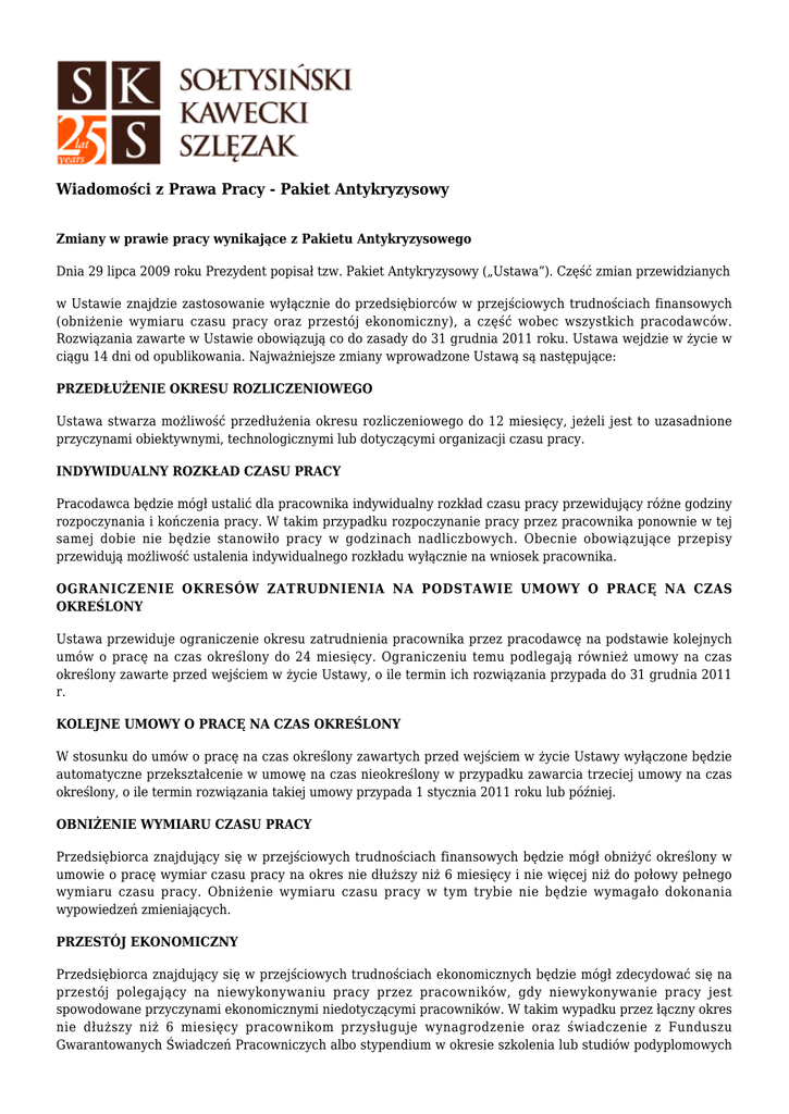 Wiadomości z Prawa Pracy - Pakiet Antykryzysowy Zmiany w prawie pracy wynikające z Pakietu Antykryzysowego Dnia 29 lipca 2009 roku Prezydent popisał tzw. Pakiet Antykryzysowy („Ustawa”). Część zmian przewidzianych w Ustawie znajdzie zastosowanie wyłącznie do przedsiębiorców w przejściowych trudnościach finansowych (obniżenie wymiaru czasu pracy oraz przestój ekonomiczny), a część wobec wszystkich pracodawców. Rozwiązania zawarte w Ustawie obowiązują co do zasady do 31 grudnia 2011 roku. Ustawa wejdzie w życie w ciągu 14 dni od opublikowania. Najważniejsze zmiany wprowadzone Ustawą są następujące: PRZEDŁUŻENIE OKRESU ROZLICZENIOWEGO Ustawa stwarza możliwość przedłużenia okresu rozliczeniowego do 12 miesięcy, jeżeli jest to uzasadnione przyczynami obiektywnymi, technologicznymi lub dotyczącymi organizacji czasu pracy. INDYWIDUALNY ROZKŁAD CZASU PRACY Pracodawca będzie mógł ustalić dla pracownika indywidualny rozkład czasu pracy przewidujący różne godziny rozpoczynania i kończenia pracy. W takim przypadku rozpoczynanie pracy przez pracownika ponownie w tej samej dobie nie będzie stanowiło pracy w godzinach nadliczbowych. Obecnie obowiązujące przepisy przewidują możliwość ustalenia indywidualnego rozkładu wyłącznie na wniosek pracownika. OGRANICZENIE OKRESÓW ZATRUDNIENIA NA PODSTAWIE UMOWY O PRACĘ NA CZAS OKREŚLONY Ustawa przewiduje ograniczenie okresu zatrudnienia pracownika przez pracodawcę na podstawie kolejnych umów o pracę na czas określony do 24 miesięcy. Ograniczeniu temu podlegają również umowy na czas określony zawarte przed wejściem w życie Ustawy, o ile termin ich rozwiązania przypada do 31 grudnia 2011 r. KOLEJNE UMOWY O PRACĘ NA CZAS OKREŚLONY W stosunku do umów o pracę na czas określony zawartych przed wejściem w życie Ustawy wyłączone będzie automatyczne przekształcenie w umowę na czas nieokreślony w przypadku zawarcia trzeciej umowy na czas określony, o ile termin rozwiązania takiej umowy przypada 1 stycznia 2011 roku lub później. OBNIŻENIE WYMIARU CZASU PRACY Przedsiębiorca znajdujący się w przejściowych trudnościach finansowych będzie mógł obniżyć określony w umowie o pracę wymiar czasu pracy na okres nie dłuższy niż 6 miesięcy i nie więcej niż do połowy pełnego wymiaru czasu pracy. Obniżenie wymiaru czasu pracy w tym trybie nie będzie wymagało dokonania wypowiedzeń zmieniających. PRZESTÓJ EKONOMICZNY Przedsiębiorca znajdujący się w przejściowych trudnościach ekonomicznych będzie mógł zdecydować się na przestój polegający na niewykonywaniu pracy przez pracowników, gdy niewykonywanie pracy jest spowodowane przyczynami ekonomicznymi niedotyczącymi pracowników. W takim wypadku przez łączny okres nie dłuższy niż 6 miesięcy pracownikom przysługuje wynagrodzenie oraz świadczenie z Funduszu Gwarantowanych Świadczeń Pracowniczych albo stypendium w okresie szkolenia lub studiów podyplomowych finansowane z środków Funduszu Pracy.
