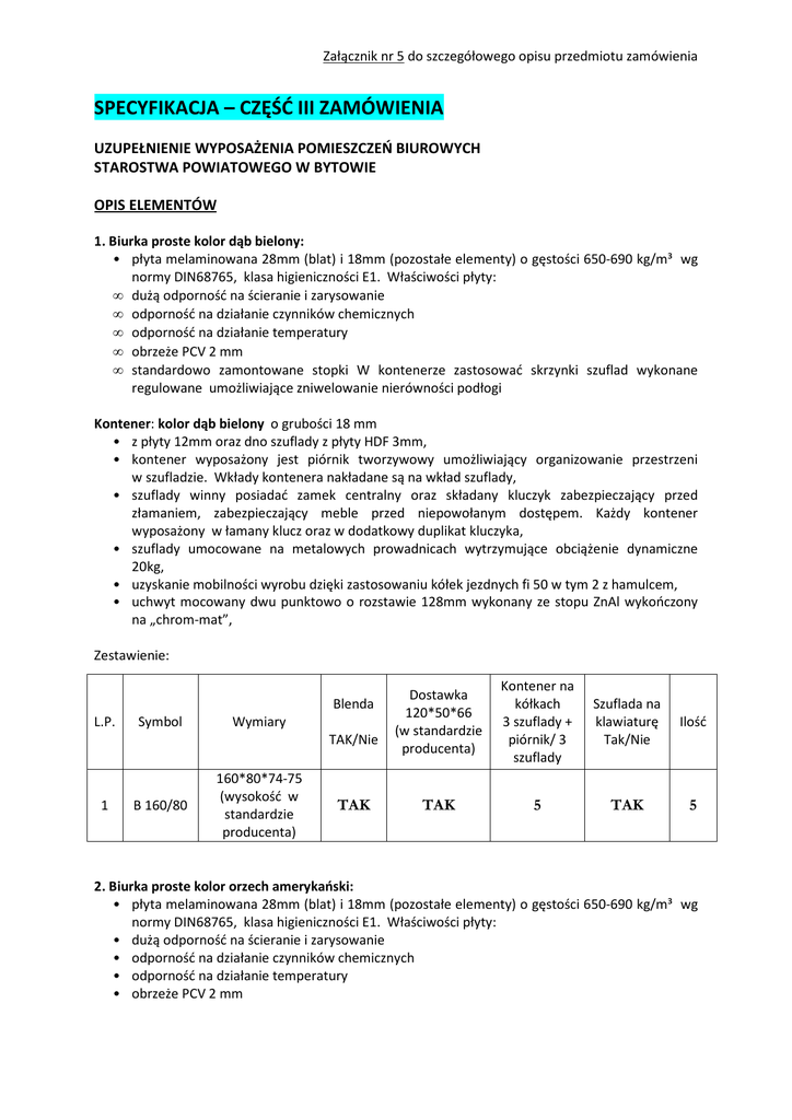 Załącznik nr 5 do szczegółowego opisu przedmiotu zamówienia SPECYFIKACJA – CZĘŚĆ III ZAMÓWIENIA UZUPEŁNIENIE WYPOSAŻENIA POMIESZCZEŃ BIUROWYCH STAROSTWA POWIATOWEGO W BYTOWIE OPIS ELEMENTÓW 1. Biurka proste kolor dąb bielony: • płyta melaminowana 28mm (blat) i 18mm (pozostałe elementy) o gęstości 650-690 kg/m³ wg normy DIN68765, klasa higieniczności E1. Właściwości płyty: • dużą odporność na ścieranie i zarysowanie • odporność na działanie czynników chemicznych • odporność na działanie temperatury • obrzeże PCV 2 mm • standardowo zamontowane stopki W kontenerze zastosować skrzynki szuflad wykonane regulowane umożliwiające zniwelowanie nierówności podłogi Kontener: kolor dąb bielony o grubości 18 mm • z płyty 12mm oraz dno szuflady z płyty HDF 3mm, • kontener wyposażony jest piórnik tworzywowy umożliwiający organizowanie przestrzeni w szufladzie. Wkłady kontenera nakładane są na wkład szuflady, • szuflady winny posiadać zamek centralny oraz składany kluczyk zabezpieczający przed złamaniem, zabezpieczający meble przed niepowołanym dostępem. Każdy kontener wyposażony w łamany klucz oraz w dodatkowy duplikat kluczyka, • szuflady umocowane na metalowych prowadnicach wytrzymujące obciążenie dynamiczne 20kg, • uzyskanie mobilności wyrobu dzięki zastosowaniu kółek jezdnych fi 50 w tym 2 z hamulcem, • uchwyt mocowany dwu punktowo o rozstawie 128mm wykonany ze stopu ZnAl wykończony na „chrom-mat”, Zestawienie: Blenda L.P. Symbol Wymiary TAK/Nie 1 B 160/80 160*80*74-75 (wysokość w standardzie producenta) TAK Dostawka 120*50*66 (w standardzie producenta) Kontener na kółkach 3 szuflady + piórnik/ 3 szuflady Szuflada na klawiaturę Tak/Nie Ilość TAK 5 TAK 5 2. Biurka proste kolor orzech amerykański: • płyta melaminowana 28mm (blat) i 18mm (pozostałe elementy) o gęstości 650-690 kg/m³ wg normy DIN68765, klasa higieniczności E1. Właściwości płyty: • dużą odporność na ścieranie i zarysowanie • odporność na działanie czynników chemicznych • odporność na działanie temperatury • obrzeże PCV 2 mm Załącznik nr 5 do szczegółowego opisu przedmiotu zamówienia • standardowo zamontowane stopki regulowane podłogi umożliwiające zniwelowanie nierówności Kontener: kolor orzech amerykański:o grubości 18 mm • w kontenerze zastosować skrzynki szuflad wykonane z płyty 12mm oraz dno szuflady z płyty HDF 3mm • kontener wyposażony jest piórnik tworzywowy umożliwiający organizowanie przestrzeni w szufladzie. Wkłady kontenera nakładane są na wkład szuflady. • szuflady winny posiadać zamek centralny oraz składany kluczyk zabezpieczający przed złamaniem, zabezpieczający meble przed niepowołanym dostępem. Każdy kontener wyposażony w łamany klucz oraz w dodatkowy duplikat kluczyka. • szuflady umocowane na metalowych prowadnicach wytrzymujące obciążenie dynamiczne 20kg • uzyskanie mobilności wyrobu dzięki zastosowaniu kółek jezdnych fi 50 w tym 2 z hamulcem • uchwyt mocowany dwu punktowo o rozstawie 128mm wykonany ze stopu ZnAl wykończony na „chrom-mat” Zestawienie: Blenda L.P Symbol Wymiary TAK/Nie 1 B 160/80 160*80*74-75 (wysokość w standardzie producenta) TAK Dostawka 120*50*66 (w standardzie producenta) Kontener na kółkach 3 szuflady + piórnik/ 3 szuflady TAK 2 Szuflada na klawiaturę Ilość Tak/Nie Nie × 1 Tak × 1 2 3. Biurka narożne: kolor dąb bielony • płyta melaminowana 28mm (blat) i 18mm (pozostałe elementy) o gęstości 650-690 kg/m³ wg normy DIN68765, klasa higieniczności E1. Właściwości płyty: • dużą odporność na ścieranie i zarysowanie, • odporność na działanie czynników chemicznych, • odporność na działanie temperatury, • obrzeże PCV 2 mm, • standardowo zamontowane stopki regulowane umożliwiające zniwelowanie nierówności podłogi, • kontener: kolor dąb bielony o grubości 18 mm, • w kontenerze zastosować skrzynki szuflad wykonane z płyty 12mm oraz dno szuflady z płyty HDF 3mm , • kontener wyposażony jest piórnik tworzywowy umożliwiający organizowanie przestrzeni w szufladzie. Wkłady kontenera nakładane są na wkład szuflady, • szuflady winny posiadać zamek centralny oraz składany kluczyk zabezpieczający przed złamaniem, zabezpieczający meble przed niepowołanym dostępem. Każdy kontener wyposażony w łamany klucz oraz w dodatkowy duplikat kluczyka, • szuflady umocowane na metalowych prowadnicach wytrzymujące obciążenie dynamiczne 20kg, • uzyskanie mobilności wyrobu dzięki zastosowaniu kółek jezdnych fi 50 w tym 2 z hamulcem, • uchwyt mocowany dwu punktowo o rozstawie 128mm wykonany ze stopu ZnAl wykończony na „chrom-mat”, Załącznik nr 5 do szczegółowego opisu przedmiotu zamówienia Zestawienie: L.P. Symbol 1 2 3 BN 160*120 L BN 160*120 P BN 180*160 P Wymiar zewnętrzny wariant I 160/80*120/80 160/80*120/80 180/80*160/80 Blenda Tak/Nie TAK TAK TAK Kontener na kółkach z piórnikiem lub bez zamykane na klucz Szuflada na klawiaturę Tak/Nie TAK TAK TAK TAK/piórnik TAK/piórnik TAK/piórnik Ilość 2 3 1 4. Biurka narożne: kolor orzech amerykański • płyta melaminowana 28mm (blat) i 18mm (pozostałe elementy) o gęstości 650-690 kg/m³ wg normy DIN68765, klasa higieniczności E1. Właściwości płyty: • dużą odporność na ścieranie i zarysowanie, • odporność na działanie czynników chemicznych, • odporność na działanie temperatury, • obrzeże PCV 2 mm, • standardowo zamontowane stopki regulowane umożliwiające zniwelowanie nierówności podłogi, • kontener: kolor orzech amerykański o grubości 18 mm , • w kontenerze zastosować skrzynki szuflad wykonane z płyty 12mm oraz dno szuflady z płyty HDF 3mm , • kontener wyposażony jest piórnik tworzywowy umożliwiający organizowanie przestrzeni w szufladzie. Wkłady kontenera nakładane są na wkład szuflady. • szuflady winny posiadać zamek c