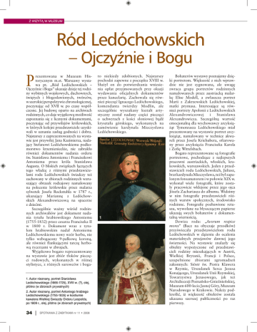 Z WIZYTĄ W MUZEUM Ród Ledóchowskich – Ojczyźnie i Bogu P rezentowana w Muzeum Historycznym m.st. Warszawy wystawa pt. „Ród Ledóchowskich – Ojczyźnie i Bogu” ukazuje dzieje tej rodziny wybitnych wojskowych, duchownych, świętych i błogosławionych, twórców, w szerokiej perspektywie chronologicznej, poczynając od XVII w. po czasy współczesne. Jej budowę oparto na archiwach rodzinnych, co daje wyjątkową możliwość zapoznania się z licznymi dokumentami, poczynając od przywilejów królewskich, w których kolejni przedstawiciele uzyskiwali w uznaniu zasług godności i dobra. Najstarszy z zaprezentowanych na wystawie jest przywilej Jana Kazimierza, nadający Stefanowi Ledóchowskiemu podkomorstwo krzemienieckie, nie zabrakło również dokumentów nadania orderu św. Stanisława Antoniemu i Franciszkowi Antoniemu przez króla Stanisława Augusta. O bliskich związkach łączących tego władcę z różnymi przedstawicielami rodu Ledóchowskich świadczy też zachowany w zbiorach rodzinnych wzruszający obrazek rodzajowy namalowany na polecenie królewskie przez malarza sylwetek Josefa Rockstuhla w 1787 r., ukazujący Mariannę z Ledóchowskich Alexandrowiczową na spacerze z dziećmi. Szczególnie ważny wśród rodzinnych archiwaliów jest dokument nadania tytułu hrabiowskiego Antoniemu (1755-1832) przez cesarza Franciszka II w 1800 r. Dokument wraz z tytułem hrabiowskim nadał Antoniemu Ledóchowskiemu nowy wzór herbu, nie 3 tylko wzbogacony 9-pałkową koroną, ale również flankującymi tarczę herbową rycerzami w zbrojach. Wyjątkowo bogato reprezentowany na wystawie jest zbiór tłoków pieczęci rodowych, wykonanych w różnej stylistyce, z różnych surowców i boga- to niekiedy zdobionych. Najstarszy pochodzi zapewne z początku XVIII w. Służył on do potwierdzania wniesienia opłat przyjmowanych przy okazji wydawania oficjalnych dokumentów przez kancelarię. Zachowała się również pieczęć Ignacego Ledóchowskiego, komendanta twierdzy Modlin, ale szczególnie wyszukany kształt artystyczny został nadany części pieczęci o uchwytach z kości słoniowej bądź kryształu górskiego, wykonanych na zamówienie kardynała Mieczysława Ledóchowskiego. 1 1. Autor nieznany, portret Stanisława Ledóchowskiego (1666-1725), XVIII w. (?), olej, płótno (w zbiorach prywatnych) 2. Autor nieznany, portret Antoniego hrabiego Ledóchowskiego (1755-1835) w kostiumie kawalera Wielkiej Gwiazdy Orderu Leopolda, po 1809 r., olej, płótno (w zbiorach prywatnych) 34 Spotkania z zabytkami nr 11 • 2008 2 Bohaterów wystawy poznajemy dzięki portretom. Większość z nich wprawdzie nie jest sygnowana, ale uwagę zwraca grupa portretów rodzinnych namalowanych przez austriacką malarkę Elise Modell, a zwłaszcza portret Marii z Zakrzewskich Ledóchowskiej, matki prymasa. Interesujące są również portrety Apolonii z Ledóchowskich Alexandrowiczowej i Stanisława Alexandrowicza. Szczególną wartość emocjonalną dla wychowawcy arcyksiążąt Tymoteusza Ledóchowskiego miał prezentowany na wystawie portret arcyksiążąt, namalowany w technice akwareli przez Josefa Kriehubera, ofiarowany przez arcyksięcia Franciszka Karola i Zofię Wittelsbach. Bogato reprezentowane są fotografie portretowe, pochodzące z najlepszych pracowni austriackich, włoskich, krakowskich, warszawskich. Jeden z przedstawicieli rodu Ledóchowskich, Juliusz, brat kardynała Mieczysława, też był zapalonym fotoamatorem i w połowie XIX w. wykonał wiele fotografii, które zostały pracowicie wklejone przez jego ojca Józefa Zachariasza do albumu. Widzimy w nim fotografie przedstawicieli różnych warstw społecznych, środowisko rodzinne. Fotografie pozbawione retuszu, wywołane na błyszczącym papierze ukazują swych bohaterów z dokumentalną wiernością. Dewiza rodu: „Avorum respice mores” (Bacz na obyczaje przodków) przyświecała przedstawicielom rodu Ledóchowskich w dążeniu do ocalenia materialnych przejawów dawnej jego świetności. Na wystawie znalazły się obiekty wypożyczone od przedstawicieli rodziny mieszkających w Austrii, Wielkiej Brytanii, Francji i Polsce, uzupełnione zbiorami zgromadzeń zakonnych: Sióstr św. Piotra Klawera w Rzymie, Urszulanek Serca Jezusa Konającego, Urszulanek Unii Rzymskiej, Towarzystwa Jezusowego, jak też Archidiecezji Poznańsko-Gnieźnieńskiej, Muzeum 600-lecia Jasnej Góry, Muzeum Narodowego w Krakowie. Należy podkreślić, iż większość obiektów została ukazana szerszej publiczności po raz pierwszy. Z WIZYTĄ W MUZEUM Główni bohaterowie wystawy: Stanisław Ledóchowski (1666-1725), rozpoczął swą służbę ojczyźnie pod wodzą króla Jana III Sobieskiego. W 1683 r., wraz z dwoma braćmi, Felicjanem oraz Kazimierzem, wziął udział w odsieczy wiedeńskiej. Po powrocie do Polski stopniowo zyskiwał na znaczeniu. Został wybrany marszałkiem Konfederacji Tarnogrodzkiej. Antoni Ledóchowski (1755-1835), przeżył dramatyczne wydarzenie, jakim była utrata niepodległości. Był posłem na Sejm Czteroletni, uczestnikiem powstania kościuszkowskiego, po rozbiorach Rzeczypospolitej deputowanym szlachty Galicji Zachodniej. W 1800 r. został obdarzony przez Franciszka I dziedzicznym tytułem hrabiowskim. Ignacy Halka Ledóchowski (1789-1870), generał, uczestnik wojen napoleońskich, dowódca Arsenału w Warszawie, komendant twierdzy modlińskiej z czasów powstania listopadowego, odznaczony Krzyżem Legii Honorowej i Krzyżem Virtuti Militari. Kardynał Mieczysław Halka Ledóchowski (1822-1902), arcybiskup gnieźnieńsko-poznański, prymas Polski. Za sprzeciw wobec germanizacji więziony w Ostrowie Wielkopolskim. Po uwolnieniu kontynuował karierę w służbie papieskiej. Wybitny mąż Kościoła. Maria Teresa Ledóchowska (1863-1922), założycielka Stowarzyszenia Sióstr Misyjnych św. Piotra Klawera („Klawerianki”). Na wniosek Kościoła austriackiego w 1975 r. w Rzymie ogłoszona została błogosławioną. 