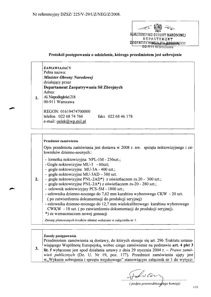 Nr referencyjny DZSZ/ 225/V-29/UZ/NEG/Z/2008. Protok61 postepowania 0 udzielenie, kt6rego przedmiotem jest uzbrojenie ZAMAWIAJACY 1. Pelna nazwa: Minister Obrony Narodowej dzialajacy przez Departament Zaopatrywania Sil Zbrojnych Adres: Ai. NiepJdlegloSci 218 00-911 Warszawa REGON: 01619474700000 telefon 02268 74 766 e-mail: [email protected] faks 0226846 178 Przedmiot zam6wienia Opis przedmiotu zam6wienia jest dostawa w 2008 r. nw. sprzetu noktowizyjnego i ce lownik6w dzienno-nocnych:: 2. - lometka noktowizyjna NPL-IM - 236szt.; - Gogle noktowizyjne MU-3 - 60szt; - gogle noktowizyjne MU-3A - 400 szt.; - gogle noktowizyjne MU-3AD - 380 szt. - gogle noktowizyjne PNL-2AD*) z oswietlaczem zs.20 - 300 szt.; - gogle noktowizyjne PNL-2A*) z oswietlaczem zs-20 - 280 szt.; - celownik noktowizyjny PCS-5M - 1800 szt.; - celownika dzienno-nocnego do 7,62 mm karabinu wyborowego CKW - 20 szt. (po zatwierdzeniu dokumentacji do produkcji seryjnej) - celownika dzienno-nocnego do 12,7 mm wielokalibrowego karabinu wyborowego CWKW - 18 szt. ( po zatwierdzeniu dokumentacji do produkcji seryjnej). *) ze wzmacniaczem nowej geneacji Zmiany planowanych srodkow fHeSei) wskazano w zalqczniku nr 1. Zasady postepowania 3. Przedmiotem zam6wienia sa dostawy, do kt6rych stosuje sie art. 296 Traktatu ustana wiajacego Wspolnote Europejska, wobec czego zam6wienie na podstawie art. 4 pkt 3 lit. f wylaczone jest spod dzialania ustawy z dnia 29 stycznia 2004 r. - Prawo zamo wien publicznych (Dz. U. Nr 19, poz. 177). Przedmiot zam6wienia ujety jest w.Wykazie uzbrojenia i sprzetu wojskowego" stanowiacym zalacznik nr 1 do wytycz 1/12 Nr referencyjny DZSZ/225/V-29/UZ/NEG/Z/2008 nych Ministra Obrony Narodowej w sprawie zasad i trybu zawierania w resorcie obro ny narodowej um6w, kt6rych przedmiotem jest uzbrojenie lub sprzet wojskowy, sta nowiacych zalacznik do decyzji Nr 291/MON Ministra Obrony Narodowej z dnia 26 lipca 2006 r. w sprawie zasad i trybu zawierania w resorcie obrony narodowej um6w, kt6rych przedmiotem jest uzbrojenie lub sprzet wojskowy (Dz. Urz. MON Nr 14, poz. 179) pod pozycja nr pod pozycja Dr 15.4, a zgodnie z Decyzja Nr 217/MON z dnia 09 maja 2007 r. nalezy traktowac go jako sluzacy ochronie podstawowych interes6w bez pieczenstwa panstwa w rozumieniu art.296 Traktatu ustanawiajacego Wspolnote Euro pejska, Tryb postepowania 4. Dzialajac na podstawie §3 ust.2 "post~owanie prowadzi sie z zachowaniem zasad legalnosci, gospodarnosci, celowosci i rzetelnosci" i §3 ust. 3 .zamawiajacy prowadzi postepowanie majac na wzgledzie dazenie do unifikacji i kompatybilnosci UiSW Sil Zbrojnych, racjonalizacji koszt6w jego eksploatacji oraz realizacji umowy, § 22 ust. 1 pkt 1 "gdy z przyczyn technicznych lub z powodu posiadania praw wylacznych wy stepuje jeden wykonawca, § 22 ust. 1 pkt. 2 "gdy wykonawca realizowal wdrozenie wyrobu do produkcji seryjnej" wytycznych Ministra Obrony Narodowej w sprawie zasad i trybu zawierania w resorcie obrony narodowej umow, ktorych przedmiotem jest uzbrojenie lub sprzet wojskowy stanowiacych zalacznik do decyzji nr 291/MON Ministra Obrony Narodowej z dnia 26 lipca 2006r. w ramach dokonanej analizy rynku potencjalnych producent6w i wykonawc6w ustalono, ze Przemyslowe Centrum Opty ki S.A. jest jedynym producentem i dostawca lometek noktowizyjnych NPL-IM .Brom", gogli noktowizyjnych PNL-2AD i PNL-2A, MU-3A i MU-3AD, celowni k6w noktowizyjnych PCS-5 oraz celownik6w dzienno-nocnych CKW i CWKW wy roby te ( dokumentacja wdrozeniowa na celowniki dzienno-nocne CKW i CWKW jest na etapie zatwierdzenia przez DPZ MON, celowniki zostana zakupione po jej za twierdzeniu) uzyskaly pozytywne wyniki badan, zostaly wdrozone do produkcji seryj nej przez PCO S.A. oraz posiadaja dokumentacje techniczna i technologiczna za twierdzona przez MON do produkcji seryjnej dla: lornetka noktowizyjna NPL-1M PCO-93IWT-67, NPL-1M PCO-07IWT-167, celownik noktowizyjny PCS-5 PCO 87IWT-23, gogle noktowizyjne PNL-2A PCO-02IWT-145, PNL-2AD PCO 02IWT-144, MU-3AD zezwolenie nr 78 Szefa IW SZ z dnia 17.09.2007 r. MU 3A zezwolenie nr 79 Szefa IW SZ z dnia 17.09.2007 r. w zwiazku z powyzszym, z przyczyn technicznych PCO S.A. jest jedyna firma mogaca wykonac przedmiotowe zam6wienie. zachodza zatem przeslanki zastosowania § 18 ust.7 wytycznych Ministra Obrony Narodowej w sprawie zasad i trybu zawierania w resorcie obrony narodowej umow, kt6rych przedmiotem jest uzbrojenie lub sprzet wojskowy stanowiacych zalacz nik do decyzji nr 291/MON Ministra Obrony Narodowej z dnia 26 lipca 2006r. oraz artA pkt. 3 lit.f ustawy z dnia 29 stycznia 2004 r. - prawo zamowien publicznych (Dz. U. nr 19, poz. 177). Decyzja Ministra Obrony NarodO\vej 0 wyb6r trybu zostala wyda-na wdniu * DecyrjEl stEl1'lowi rElfttCZIQik do pfotokolu 1'lf ... * Osoby i zakres wykonanych przez nich czynnosci - zalaeznlk nr 2 5. Osoby biorace udzial w postepowaniu oraz zakres wykonywanych przez nie czynnosci okresla zalacznik. Osoby wykonujqce czynnosci w postepowaniu 0 udzielenie zamowienia zlozyly oswiadczenia na zalqczonym druku 2/12 Nr referencyjny DZSZJ225JV-29JUZJNEGJZJ2008 Ogloszenie 0 zamowlenlu 1. Ogloszenie 0 post<woVianiu zostalo zamieszezone: VI' Biuletynie Infonnacji Publieznej MON od dnia .. oo •./..... .1200.. .f. na stfonie internetovl'ej ofganizatofa vI'VI,.v.dostawy.vl'p.mil.pl od dnia .. oo •.I ..... ./200 ... f. VI siedzibie ofganizatofa na taelic}' ogioszen 6. od dnia ..... ./ ..... ./200 ... f. 2. Zaproszenie do negocjacji JfokoVl'ail* wyslano w dniu 11.06.2008 r. -pIsmo Dr 3491JVJDZ. Miejsce i termin skladania ofert Terrnin skladania ofert uplynal w dniu 13.06.12008 r. 7. 0 godz. 0900 Termin zlotenia {'}fert przedlutono * pismo nr ... ...../.../DZ z ..... ./oo ... ./200... f. przesuniQto z dnia ..... ./..... ./200 ... f. !'la dzidl ..... ./ ..... ./200 ... f.+ Termin otwarcia ofert 1. Otwarcie ofert odbylo sie w dniu 13/06/2008r. 2. 3. Departamencie Zaopatrywania Sil Zbrojnych adres: AI. Niepodleglosci 218, 00-911 Warszawa, pok. 020/A. Do uplywu terrni