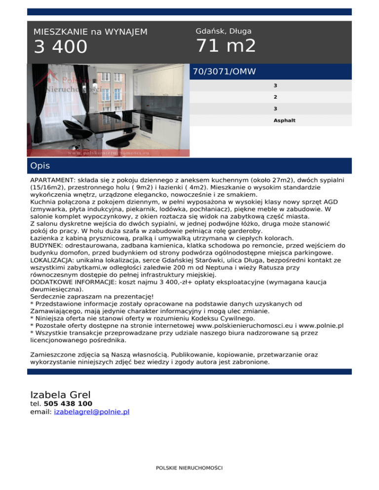 MIESZKANIE na WYNAJEM 3 400 Gdańsk, Długa 71 m2 70/3071/OMW 3 2 3 Asphalt Opis APARTAMENT: składa się z pokoju dziennego z aneksem kuchennym (około 27m2), dwóch sypialni (15/16m2), przestronnego holu ( 9m2) i łazienki ( 4m2). Mieszkanie o wysokim standardzie wykończenia wnętrz, urządzone elegancko, nowocześnie i ze smakiem. Kuchnia połączona z pokojem dziennym, w pełni wyposażona w wysokiej klasy nowy sprzęt AGD (zmywarka, płyta indukcyjna, piekarnik, lodówka, pochłaniacz), piękne meble w zabudowie. W salonie komplet wypoczynkowy, z okien roztacza się widok na zabytkową część miasta. Z salonu dyskretne wejścia do dwóch sypialni, w jednej podwójne łóżko, druga może stanowić pokój do pracy. W holu duża szafa w zabudowie pełniąca rolę garderoby. Łazienka z kabiną prysznicową, pralką i umywalką utrzymana w ciepłych kolorach. BUDYNEK: odrestaurowana, zadbana kamienica, klatka schodowa po remoncie, przed wejściem do budynku domofon, przed budynkiem od strony podwórza ogólnodostępne miejsca parkingowe. LOKALIZACJA: unikalna lokalizacja, serce Gdańskiej Starówki, ulica Długa, bezpośredni kontakt ze wszystkimi zabytkami,w odległości zaledwie 200 m od Neptuna i wieży Ratusza przy równoczesnym dostępie do pełnej infrastruktury miejskiej. DODATKOWE INFORMACJE: koszt najmu 3 400,-zł+ opłaty eksploatacyjne (wymagana kaucja dwumiesięczna). Serdecznie zapraszam na prezentację! * Przedstawione informacje zostały opracowane na podstawie danych uzyskanych od Zamawiającego, mają jedynie charakter informacyjny i mogą ulec zmianie. * Niniejsza oferta nie stanowi oferty w rozumieniu Kodeksu Cywilnego. * Pozostałe oferty dostępne na stronie internetowej www.polskienieruchomosci.eu i www.polnie.pl * Wszystkie transakcje przeprowadzane przy udziale naszego biura nadzorowane są przez licencjonowanego pośrednika. Zamieszczone zdjęcia są Naszą własnością. Publikowanie, kopiowanie, przetwarzanie oraz wykorzystanie niniejszych zdjęć bez wiedzy i zgody autora jest zabronione. Izabela Grel tel. 505 438 100 email: [email protected] POLSKIE NIERUCHOMOŚCI Powered by TCPDF (www.tcpdf.org)