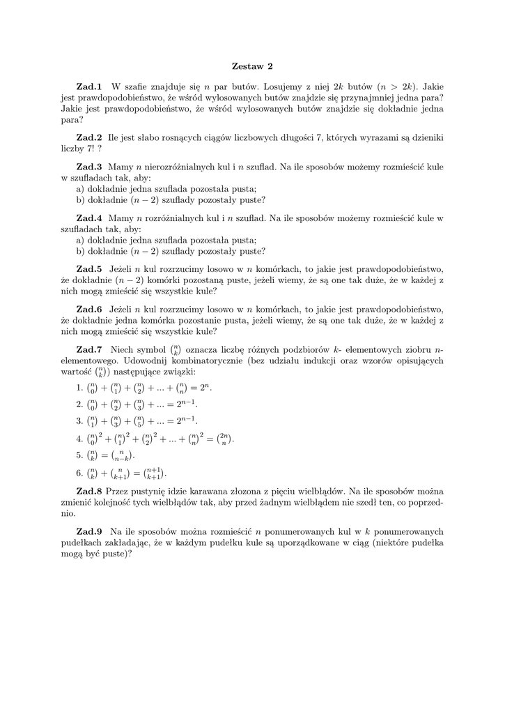 Zestaw 2 Zad.1 W szafie znajduje się n par butów. Losujemy z niej 2k butów (n > 2k). Jakie jest prawdopodobieństwo, że wśród wylosowanych butów znajdzie się przynajmniej jedna para? Jakie jest prawdopodobieństwo, że wśród wylosowanych butów znajdzie się dokładnie jedna para? Zad.2 Ile jest słabo rosnących ciągów liczbowych długości 7, których wyrazami są dzieniki liczby 7! ? Zad.3 Mamy n nierozróżnialnych kul i n szuflad. Na ile sposobów możemy rozmieścić kule w szufladach tak, aby: a) dokładnie jedna szuflada pozostała pusta; b) dokładnie (n − 2) szuflady pozostały puste? Zad.4 Mamy n rozróżnialnych kul i n szuflad. Na ile sposobów możemy rozmieścić kule w szufladach tak, aby: a) dokładnie jedna szuflada pozostała pusta; b) dokładnie (n − 2) szuflady pozostały puste? Zad.5 Jeżeli n kul rozrzucimy losowo w n komórkach, to jakie jest prawdopodobieństwo, że dokładnie (n − 2) komórki pozostaną puste, jeżeli wiemy, że są one tak duże, że w każdej z nich mogą zmieścić się wszystkie kule? Zad.6 Jeżeli n kul rozrzucimy losowo w n komórkach, to jakie jest prawdopodobieństwo, że dokładnie jedna komórka pozostanie pusta, jeżeli wiemy, że są one tak duże, że w każdej z nich mogą zmieścić się wszystkie kule? ( ) Zad.7 Niech symbol nk oznacza liczbę różnych podzbiorów k- elementowych ziobru nelementowego. Udowodnij kombinatorycznie (bez udziału indukcji oraz wzorów opisujących ( ) wartość nk ) następujące związki: 1. 2. 3. 4. 5. 6. (n) (n) (n) (n) n 0 + 1 + 2 + ... + n = 2 . (n) (n) (n) n−1 . 0 + 2 + 3 + ... = 2 (n) (n) (n) n−1 . 1 + 3 + 5 + ... = 2 (n)2 (n)2 (n)2 ( )2 ( ) + 1 + 2 + ... + nn = 2n 0 n . (n) ( n ) k = n−k . (n) k + ( n ) k+1 = (n+1) k+1 . Zad.8 Przez pustynię idzie karawana złozona z pięciu wielbłądów. Na ile sposobów można zmienić kolejność tych wielbłądów tak, aby przed żadnym wielbłądem nie szedł ten, co poprzednio. Zad.9 Na ile sposobów można rozmieścić n ponumerowanych kul w k ponumerowanych pudełkach zakładając, że w każdym pudełku kule są uporządkowane w ciąg (niektóre pudełka mogą być puste)?