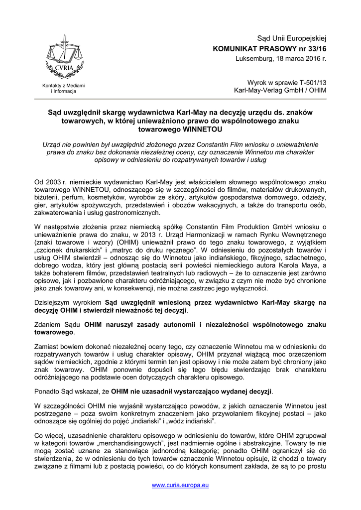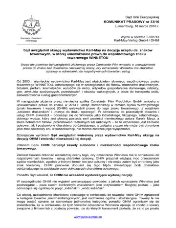 Sąd Unii Europejskiej KOMUNIKAT PRASOWY nr 33/16 Luksemburg, 18 marca 2016 r. Wyrok w sprawie T-501/13 Karl-May-Verlag GmbH / OHIM Kontakty z Mediami i Informacja Sąd uwzględnił skargę wydawnictwa Karl-May na decyzję urzędu ds. znaków towarowych, w której unieważniono prawo do wspólnotowego znaku towarowego WINNETOU Urząd nie powinien był uwzględnić złożonego przez Constantin Film wniosku o unieważnienie prawa do znaku bez dokonania niezależnej oceny, czy oznaczenie Winnetou ma charakter opisowy w odniesieniu do rozpatrywanych towarów i usług Od 2003 r. niemieckie wydawnictwo Karl-May jest właścicielem słownego wspólnotowego znaku towarowego WINNETOU, odnoszącego się w szczególności do filmów, materiałów drukowanych, biżuterii, perfum, kosmetyków, wyrobów ze skóry, artykułów gospodarstwa domowego, odzieży, gier, artykułów spożywczych, przedstawień i obozów wakacyjnych, a także do transportu osób, zakwaterowania i usług gastronomicznych. W następstwie złożenia przez niemiecką spółkę Constantin Film Produktion GmbH wniosku o unieważnienie prawa do znaku, w 2013 r. Urząd Harmonizacji w ramach Rynku Wewnętrznego (znaki towarowe i wzory) (OHIM) unieważnił prawo do tego znaku towarowego, z wyjątkiem „czcionek drukarskich” i „matryc do druku ręcznego”. W odniesieniu do pozostałych towarów i usług OHIM stwierdził – odnosząc się do Winnetou jako indiańskiego, fikcyjnego, szlachetnego, dobrego wodza, który jest główną postacią serii powieści niemieckiego autora Karola Maya, a także bohaterem filmów, przedstawień teatralnych lub radiowych – że to oznaczenie jest zarówno opisowe, jak i pozbawione charakteru odróżniającego, w związku z czym nie może być chronione jako znak towarowy ani, w konsekwencji, nie można zastrzec jego wyłączności. Dzisiejszym wyrokiem Sąd uwzględnił wniesioną przez wydawnictwo Karl-May skargę na decyzję OHIM i stwierdził nieważność tej decyzji. Zdaniem Sądu OHIM naruszył zasady autonomii i niezależności wspólnotowego znaku towarowego. Zamiast bowiem dokonać niezależnej oceny tego, czy oznaczenie Winnetou ma w odniesieniu do rozpatrywanych towarów i usług charakter opisowy, OHIM przyznał wiążącą moc orzeczeniom sądów niemieckich, zgodnie z którymi termin ten jest opisowy i nie może zatem być chroniony jako znak towarowy. OHIM ponownie dopuścił się tego błędu stwierdzając brak charakteru odróżniającego na podstawie ocen dotyczących charakteru opisowego. Ponadto Sąd wskazał, że OHIM nie uzasadnił wystarczająco wydanej decyzji. W szczególności OHIM nie wyjaśnił wystarczająco powodów, z jakich oznaczenie Winnetou jest postrzegane – poza swoim konkretnym znaczeniem jako przywołaniem fikcyjnej postaci – jako odnoszące się ogólniej do pojęć „indiański” i „wódz indiański”. Co więcej, uzasadnienie charakteru opisowego w odniesieniu do towarów, które OHIM zgrupował w kategorii towarów „merchandisingowych”, jest nadmiernie ogólne i abstrakcyjne. Towary te nie mogą zostać uznane za stanowiące jednorodną kategorię; ponadto OHIM ograniczył się do stwierdzenia, że w odniesieniu do tych towarów oznaczenie Winnetou opisuje, iż chodzi o towary związane z filmami lub z postacią powieści, co do których konsument zakłada, że są to po prostu www.curia.europa.eu towary reklamowe „Winnetou”, nie wnioskując w przedmiocie pochodzenia towarów. Brak zatem szczegółowej analizy dotyczącej charakteru i cech rozpatrywanych towarów. Z uwagi na to, że dzisiejszym wyrokiem Sąd stwierdził nieważność decyzji, OHIM powinien obecnie ponownie orzec w przedmiocie złożonego przez Constantin Film wniosku o unieważnienie prawa do znaku, uwzględniając uzasadnienie wyroku Sądu. UWAGA: Odwołanie od orzeczenia Sądu, ograniczone do kwestii prawnych, może zostać wniesione do Trybunału w terminie dwóch miesięcy od dnia zawiadomienia o tym orzeczeniu. UWAGA: Celem skargi o stwierdzenie nieważności jest doprowadzenie do uznania za nieważne aktów instytucji Unii, które są sprzeczne z prawem Unii. Państwa członkowskie, instytucje wspólnotowe oraz jednostki mogą, pod pewnymi warunkami, wnieść skargę o stwierdzenie nieważności do Trybunału Sprawiedliwości lub Sądu. Jeżeli skarga jest zasadna, stwierdza się nieważność aktu. Instytucja, której to dotyczy, powinna zaradzić ewentualnej próżni prawnej spowodowanej nieważnością tego aktu. UWAGA: Wspólnotowy znak towarowy jest skuteczny na całym obszarze Unii Europejskiej i współistnieje ze znakami krajowymi. Zgłoszenia znaku towarowego kierowane są do OHIM. Odwołanie od jego decyzji może zostać wniesione do Sądu. Dokument nieoficjalny, sporządzony na użytek mediów, który nie wiąże Sądu. Pełny tekst wyroku jest publikowany na stronie internetowej CURIA w dniu ogłoszenia. Osoba odpowiedzialna za kontakty z mediami: Ireneusz Kolowca (+352) 4303 2793 www.curia.europa.eu