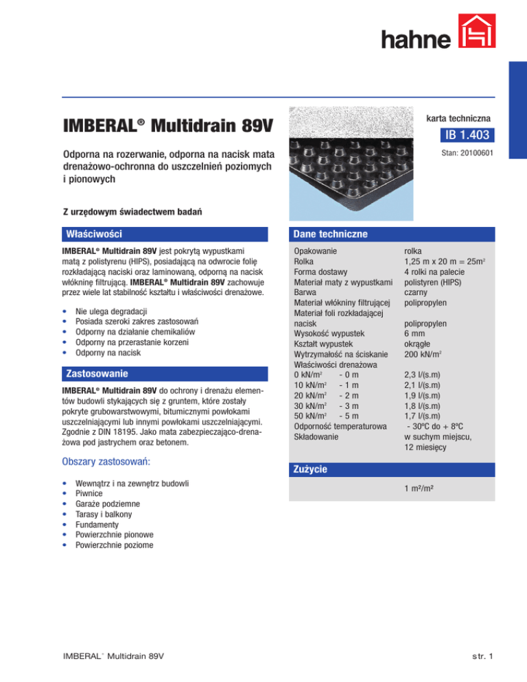 karta techniczna IMBERAL® Multidrain 89V IB 1.403 Stan: 20100601 Odporna na rozerwanie, odporna na nacisk mata drenażowo-ochronna do uszczelnień poziomych i pionowych Z urzędowym świadectwem badań Właściwości ® IMBERAL Multidrain 89V jest pokrytą wypustkami matą z polistyrenu (HIPS), posiadającą na odwrocie folię rozkładającą naciski oraz laminowaną, odporną na nacisk włókninę filtrującą. IMBERAL® Multidrain 89V zachowuje przez wiele lat stabilność kształtu i właściwości drenażowe. • • • • • Nie ulega degradacji Posiada szeroki zakres zastosowań Odporny na działanie chemikaliów Odporny na przerastanie korzeni Odporny na nacisk Zastosowanie ® IMBERAL Multidrain 89V do ochrony i drenażu elementów budowli stykających się z gruntem, które zostały pokryte grubowarstwowymi, bitumicznymi powłokami uszczelniającymi lub innymi powłokami uszczelniającymi. Zgodnie z DIN 18195. Jako mata zabezpieczająco-drenażowa pod jastrychem oraz betonem. Obszary zastosowań: • • • • • • • Wewnątrz i na zewnętrz budowli Piwnice Garaże podziemne Tarasy i balkony Fundamenty Powierzchnie pionowe Powierzchnie poziome IMBERAL® Multidrain 89V Dane techniczne Opakowanie Rolka Forma dostawy Materiał maty z wypustkami Barwa Materiał włókniny filtrującej Materiał foli rozkładającej nacisk Wysokość wypustek Kształt wypustek Wytrzymałość na ściskanie Właściwości drenażowa 0 kN/m2 -0m 10 kN/m2 - 1 m 20 kN/m2 - 2 m 30 kN/m2 - 3 m 50 kN/m2 - 5 m Odporność temperaturowa Składowanie rolka 1,25 m x 20 m = 25m2 4 rolki na palecie polistyren (HIPS) czarny polipropylen polipropylen 6 mm okrągłe 200 kN/m2 2,3 l/(s.m) 2,1 l/(s.m) 1,9 l/(s.m) 1,8 l/(s.m) 1,7 l/(s.m) - 30ºC do + 8ºC w suchym miejscu, 12 miesięcy Zużycie 1 m²/m² s tr. 1 Przygotowanie podłoża Grubowarstwowe powłoki bitumiczne, papy bitumiczne, mineralne mikrozaprawy uszczelniające lub inne uszczelnienia muszą być suche i utwardzone. Wykonanie 1. Przyciąć matę IMBERAL® Multidrain 89V z rolki na dokładny wymiar i mechanicznie przymocować wkładkami talerzowymi lub podobnymi elementami mocującymi. Zachować zapas u góry. 2. W celu wykonania zakładki zawsze wsuwa się matę łączoną pod brzeg włókniny. 3. W przypadku krawędzi zewnętrznych naciąć laminat włókniny i przykleić nacięte powierzchnie taśmą klejącą. Na narożnikach wewnętrznych matę IMBERAL® Multidrain 89V wystarczy tylko zagiąć. 4. W dolnym obszarze mata powinna kończyć się w warstwie żwiru dokładnie przylegając do rury drenażowej. 5. W przypadku przejść kabli rur lub szybów piwnicznych należy matę po prostu dopasować docinając ją nożem. 6. Po zakończeniu prac zabezpieczyć krawędzie maty IMBERAL® Multidrain 89V. 7. W przypadku jeszcze otwartego wykopu podczas wykonywania robót budowlanych dociążyć dół maty żwirem. Ważne wskazówki • Mata IMBERAL® Multidrain 89V jest neutralna dla wód gruntowych. • Drenaż zgodny z DIN 4095. • Mata IMBERAL® Multidrain 89V musi być zawsze mechanicznie umocowana. Składniki Polistyren, polipropylen Bezpieczeństwo pracy / zalecenia Nie są wymagane żadne środki specjalne. Usuwanie odpadów Odpady mogą być utylizowane zgodnie z aktualnymi krajowymi przepisami. Produkty systemowe Hahne Materiały do bitumicznej hudroizolacji Rozkładająca nacisk, zachowująca trwale właściwości drenażowe mata ochronna. Opisane wyżej właściwości materiału oparte są na wieloletnim doświadczeniu i badaniach laboratoryjnych. Właściwości materiału nie odnoszą się do wszstkich podłoży i przypadków zastosowania. W przypadkach powierzchni wątpliwych należy wykonać próby. Zmiany techniczne w ramach doskonalenia produktu zastrzeżone. W pozostałym zakresie obowiązują nasze ogólne warunki handlowe. Stan: 02.2010 IMBERAL® Multidrain 89V s tr. 2