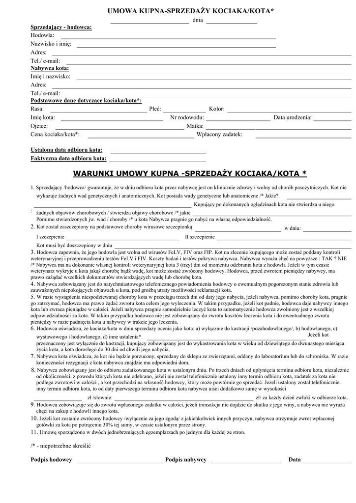 UMOWA KUPNA-SPRZEDAŻY KOCIAKA/KOTA* dnia Sprzedający - hodowca: Hodowla: Nazwisko i imię: Adres: Tel./ e-mail: Nabywca kota: Imię i nazwisko: Adres: Tel./ e-mail: Podstawowe dane dotyczące kociaka/kota*: Rasa: Imię kota: Ojciec: Cena kociaka/kota*: Płeć: Kolor: Nr rodowodu: Matka: Wpłacony zadatek: Data urodzenia: Ustalona data odbioru kota: Faktyczna data odbioru kota: WARUNKI UMOWY KUPNA -SPRZEDAŻY KOCIAKA/KOTA * 1. Sprzedający /hodowca/ gwarantuje, że w dniu odbioru kota przez nabywcę jest on klinicznie zdrowy i wolny od chorób pasożytniczych. Kot nie wykazuje żadnych wad genetycznych i anatomicznych. Kot posiada wady genetyczne lub anatomiczne /* Jakie?. Kupujący po dokonanych oględzinach kota nie stwierdza u niego : żadnych objawów chorobowych / stwierdza objawy chorobowe /* jakie Pomimo stwierdzonych jw. wad / choroby /* u kota Nabywca pragnie go nabyć na własną odpowiedzialność. 2. Kot został zaszczepiony na podstawowe choroby wirusowe szczepionką w dniu: I szczepienie II szczepienie Kot musi być doszczepiony w dniu 3. Hodowca zapewnia, że jego hodowla jest wolna od wirusów FeLV, FIV oraz FIP. Kot na zlecenie kupującego może zostać poddany kontroli weterynaryjnej i przeprowadzeniu testów FeLV i FIV. Koszty badań i testów pokrywa nabywca. Nabywca wyraża chęć na powyższe : TAK ? NIE /* Nabywca ma na dokonanie własnej kontroli weterynaryjnej kota 3 (trzy) dni od momentu odebrania kota z hodowli. Jeżeli w tym czasie weterynarz wykryje u kota jakąś chorobę bądź wadę, kot może zostać zwrócony hodowcy. Hodowca, przed zwrotem pieniędzy nabywcy, ma prawo zażądać wszelkich dokumentów stwierdzających wadę lub chorobę kota. 4. Nabywca zobowiązany jest do natychmiastowego telefonicznego powiadomienia hodowcy o ewentualnym pogorszonym stanie zdrowia lub zauważonych niepokojących objawach u kota, pod groźbą utraty możliwości reklamacji kota. 5. W razie wystąpienia niespodziewanej choroby kota w przeciągu trzech dni od daty jego nabycia, jeżeli nabywca, pomimo choroby kota, pragnie go zatrzymać, hodowca ma prawo żądać zwrotu kota celem jego wyleczenia. W takim przypadku, jeżeli kot padnie, hodowca daje nabywcy innego kota lub zwraca pieniądze w całości. Jeżeli nabywca pragnie samodzielnie leczyć kota to automatycznie hodowca zwolniony jest z wszelkiej odpowiedzialności za kota. W takim przypadku hodowca nie jest zobowiązany do zwrotu kosztów leczenia kota i do ewentualnego zwrotu pieniędzy w razie padnięcia kota u nabywcy w trakcie jego leczenia. 6. Hodowca oświadcza, że kociaka/kota w dniu sprzedaży ocenia jako kota: a) wyłącznie do kastracji /pozahodowlanego/, b) hodowlanego, c) Jeżeli kot wystawowego i hodowlanego, d) inne ustalenia*. przeznaczony jest wyłącznie do kastracji, kupujący zobowiązany jest do wykastrowania kota w wieku od dziewiątego do dwunastego miesiąca życia kota, a kota dorosłego do 30 dni od chwili jego nabycia. 7. Nabywca kota oświadcza, że kot nie będzie porzucony, sprzedany do sklepu ze zwierzętami, oddany do laboratorium lub do schroniska. W razie konieczności rezygnacji z kota nabywca znajdzie mu odpowiedni dom. 8. Nabywca zobowiązany jest do odbioru zadatkowanego kota w ustalonym dniu. Po trzech dniach od upłynięcia terminu odbioru kota, niezależnie od okoliczności, z powodu których kota nie odebrano, jeżeli nie został telefonicznie ustalony inny termin odbioru kota, zadatek za kota nie podlega zwrotowi w całości , a kot przechodzi na własność hodowcy, który może powtórnie go sprzedać. Jeżeli ustalony został telefonicznie inny termin odbioru kota, to od daty pierwszego terminu odbioru kota nabywca uiści dodatkowo sumę w wysokości zł /słownie: zł/ za każdy dzień zwłoki w odbiorze kota. 9. Hodowca zobowiązuje się do zwrotu wpłaconego zadatku w całości, jeżeli transakcja nie dojdzie do skutku z jego winy, a nabywca nie wyraża chęci na zakup z hodowli innego kota. 10. Jeżeli kot zostanie zwrócony hodowcy /wyłącznie za jego zgodą/ z jakichkolwiek innych przyczyn, nabywca otrzymuje zwrot wpłaconej gotówki za kota po potrąceniu 30% tej sumy, w czasie ustalonym przez strony. 11. Umowę sporządzono w dwóch jednobrzmiących egzemplarzach po jednym dla każdej ze stron. /* - niepotrzebne skreślić Podpis hodowcy Podpis nabywcy Data