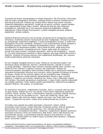 Wielki Czwartek - Wydarzenia ewangeliczne Wielkiego Czwartku Czwartek był dniem poprzedzającym święta żydowskie. Dla Chrystusa i Dwunastu stał się dniem pożegnalnej wieczerzy, podczas której uczniowie uczestniczyli w pierwszej Eucharystii. Podczas jej trwania Mistrz obmył nogi swoim uczniom, ustanowił Najświętszy sakrament, modlił się za swoich uczniów, ujawnił zdrajcę oraz zapowiedział swoją mękę i śmierć. Wieczernik stał się więc miejscem szczególnym: dokonały się w nim pierwsze święcenia kapłańskie, została odprawiona Msza Święta Prymicyjna, a także nastąpiło pierwsze odejście kapłańskie- zdrada Judasza. Ostatnia Wieczerza słusznie nosi tę nazwę, ponieważ był to pożegnalny posiłek Chrystusa. Żydowska pascha rozpoczynał się dnia następnego. Chrystus uprzedził ją, przewidując wydarzenia piątkowe. Z opisu Ewangelistów wynika, iż miała ona szczególnie uroczysty charakter. Świadczy o tym przemówienie Jezusa zawarte w Ewangelii janowej, zwane modlitwą arcykapłańską Jezusa . Zanim jednak przystąpiono do spożywania posiłku, Jezus wstał od stołu, zdjął wierzchnie okrycie, wziął ręcznik i przepasał się nim. Potem nalał wody do miednicy i zaczął myć nogi uczniom i wycierać ręcznikiem, którym był przepasany . Uczynił to, co zwykł wykonywać niewolnik w domu bogaczy, gdy jego właściciele wrócili z podróży. Uniżenie Chrystusa stanowi wzór kapłaństwa służebnego, ale i stanowi wielkie podkreślenie godności człowieka. Po tym wstępie nastąpiła skromna uczta. Wtedy po raz pierwszy padły z ust Chrystusa słowa konsekracji: bierzcie i jedzcie& bierzcie i pijcie& to czyńcie na moją pamiątkę . Tajemnica tego wieczoru przeszła jednak obok uczniów i nie trafiła do nich, bowiem w Ogrójcu wszyscy się rozpierzchli. Dopiero po zmartwychwstaniu szczególny znak Łamania Chleba (tak w pierwszych wiekach nazywano Eucharystię) otworzył oczy uczniom, którzy spotkali Chrystusa na drodze do Emaus i byliby Go nie poznali, gdyby nie ów szczególny gest. Podniosły nastrój tego wieczoru został popsuty zapowiedziami Jezusa o jego rychłym odejściu, o zaparciu się uczniów, zwłaszcza św. Piotra, oraz o obecności między nimi zdrajcy. Dwunastu gorączkowo wypytywało, o kogo chodzi, jednak odpowiedź nie została udzielona. Tylko Judasz opuścił zgromadzenie, tajemniczo ponaglony słowami Mistrza: rób szybko, co zamierzasz . Po skończeniu wieczerzy i odśpiewaniu hymnów, Jezus z uczniami udał się spać na górę oliwną. Jednak tej nocy nie zasnął. Prosił trzech najbardziej zaufanych uczniów: Piotra, Jakuba i Jana, o towarzystwo podczas czuwania, jednak wszyscy oni usnęli, bo oczy im się kleiły do snu . Jezus zaś modlił się: Ojcze, jeśli chcesz, zabierz ode mnie ten kielich, jednak nie moja, lecz Twój wola niech się stanie . I ukazał Mu się anioł z nieba, który podtrzymywał Go na duchu. W środku nocy zjawiła się wielka gromada z mieczami i kijami, której przewodził uczeń Jezusa, Judasz Iskariota. Pocałunek pokoju, którym pozdrowił Nauczyciela, był wskazówką dla oprawców: Ten, którego pocałuję, to On. Poczwyćcie Go i prowadźcie ostrożnie . Ostatnim, rozpaczliwym gestem sprzeciwu przeciwko przemocy tłumu był niefortunny atak Piotra, który miał skończyć się wyzwoleniem Jezusa, a spowodował jedynie odcięcie ucha jednemu ze sług świątynnych. Chwilę potem na placu boju pozostali tylko oprawcy i związany Jezus. Uczniowie uciekli. Chwilę później Chrystus został uprowadzony do domu arcykapłana Kajfasza i uwięziony. Tymczasem Piotr nie zrezygnował z Mistrza. Mimo strachu podążał za http://www.abobola.aplus.pl - Parafia św. Andrzeja Boboli M. w Białymstoku Powered by Mambo Generated: 2 March, 2017, 20:52 zgrają i zaszedł aż na dziedziniec domu arcykapłańskiego, na którym czuwali służący, skupieni wokół ogniska. Wówczas nastąpiło wypełnienie proroctwa sprzed kilku godzin: Książe Apostołów trzykrotnie wyparł się Jezusa. http://www.abobola.aplus.pl - Parafia św. Andrzeja Boboli M. w Białymstoku Powered by Mambo Generated: 2 March, 2017, 20:52