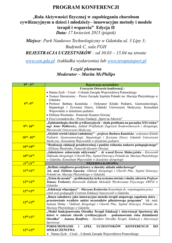 PROGRAM KONFERENCJI „Rola Aktywności fizycznej w zapobieganiu chorobom cywilizacyjnym u dzieci i młodzieży– innowacyjne metody i modele terapii i wsparcia” Edycja II Data: 17 kwiecień 2015 (piątek) Miejsce: Park Naukowo Technologiczny w Gdańsku ul. 3 Lipy 3; Budynek C, sala FGH REJESTRACJA UCZESTNIKÓW : od 30.03 – 15.04 na stronie www.cen.gda.pl (zakładka wydarzenia) lub www.terapiaisport.pl I część plenarna Moderator – Marita McPhilips 900 - 930 930- 950 950- 1010 1010- 1030 1030-1050 1050-1120 1120-1150 1150-1210 1210-1230 1230-1245 1245-1300 1300-1315 1315-1330 Rejestracja uczestników Uroczyste Otwarcie konferencji : Hanna Zych – Cisoń – Członek Zarządu Województwa Pomorskiego Tomasz Sławatyniec – Prezes Zarządu Szpitala Polanki im. Macieja Płażyńskiego w Gdańsku Profesor Barbara Kamińska - Ordynator Kliniki Pediatrii, Gastroenterologii, Hepatologii i Żywienia Dzieci, Gdański Uniwersytet Medyczny; Konsultant Wojewódzki w dziedzinie pediatrii Elżbieta Wasilenko - Pomorski Kurator Oświaty Ewa Lewandowska - Prezes Fundacji „Sport na Zdrowie” „Epidemiologia chorób cywilizacyjnych – skala problemu na początku XXI wieku” mgr Artur Walkiewicz, Zakład Profilaktyki Zagrożeń Środowiskowych i Alergologii, Warszawski Uniwersytet Medyczny „Otyłość wśród i dzieci i młodzieży” – profesor Barbara Kamińska - ordynator Kliniki Pediatrii, Gastroenterologii, Hepatologii i Żywienia Dzieci, Gdański Uniwersytet Medyczny; Konsultant Wojewódzki w dziedzinie pediatrii "Realizacja edukacji prozdrowotnej z punktu widzenia nadzoru pedagogicznego" - Elżbieta Wasilenko, Pomorski Kurator Oświaty „Jakościowe zaburzenia odżywania” – dr n.med.Teresa Małaczyńska - Kierownik Oddziału Alergologii i Chorób Płuc, Szpital Dziecięcy Polanki im. Macieja Płażyńskiego w Gdańsku, Konsultant Wojewódzki w dziedzinie alergologii PRZERWA KAWOWA „Refluks żołądkowo-przełykowy a choroby układu oddechowego” lek. med. Elżbieta Gąsecka; Oddział Alergologii i Chorób Płuc, Szpital Dziecięcy Polanki im. Macieja Płażyńskiego w Gdańsku „Tyłem do ucznia” - problematyka styku systemu oświaty i służby zdrowia Profesor Tomasz Frołowicz Kierownik Zakładu Metodyki Wychowania Fizycznego AWFiS w Gdańsku „Edukacja włączająca” - Marzena Kozłowska Konsultant ds. wspomagania pracy szkół oraz pedagogiki Centrum Edukacji Nauczycieli w Gdańsku „Basen solankowy jako innowacyjna metoda terapii atopowego zapalenia skóry – przestawienie wyników ankiet uczestników pilotażowego programu” lek. med. Justyna Dolny - Oddział Alergologii i Chorób Płuc, Szpital Dziecięcy Polanki im. Macieja Płażyńskiego w Gdańsku „Model funkcjonowania Ośrodka Terapii Edukacji i Aktywizacji Sportowej dla dzieci w zakresie chorób cywilizacyjnych – podsumowanie roku działalności Ośrodka” – Joanna Rentfleisz – Dyrektor Ośrodka Terapii, Edukacji i Aktywizacji Sportowej PODSUMOWANIE i APEL UCZESTNIKÓW KONFERENCJI DO SPOŁECZEŃSTWA Hanna Zych – Cisoń – Członek Zarządu Województwa Pomorskiego Profesor Barbara Kamińska- Konsultant Wojewódzki w dziedzinie pediatrii dr n.med.Teresa Małaczyńska - Konsultant Wojewódzki w dziedzinie alergologii Profesor Tomasz Frołowicz Kierownik Zakładu Metodyki Wychowania Fizycznego AWFiS w Gdańsku Marzena Kozłowska Konsultant ds. wspomagania pracy szkół oraz pedagogiki Centrum Edukacji Nauczycieli w Gdańsku Ewa Lewandowska - Prezes Fundacji „Sport na Zdrowie” II Część warsztatowa dla rodziców /sale FGHA/ /Zapewniamy opiekę dla dzieci 4-12 lat/ 1530 - 1600 Rejestracja uczestników 1600 - 1620 „Problem suchej skóry – nie tylko w atopii” – dr n.farm Bogusław Pilarski Jakość życia dzieci i młodzieży z otyłością - ekspert: prof. Barbara Kamińska ordynator Kliniki Pediatrii, Gastroenterologii, Hepatologii i Żywienia Dzieci, Gdański Uniwersytet Medyczny; Konsultant Wojewódzki w dziedzinie pediatrii Zaproszeni paneliści: nauczyciel, fizjoterapeuta, Jakość życia dzieci i młodzieży z atopowym zapaleniem skóry i alergią pokarmową ekspert: lek. Med. Justyna Dolny Oddział Alergologii i Chorób Płuc, Szpital Dziecięcy Polanki im. Macieja Płażyńskiego w Gdańsku Zaproszeni paneliści: nauczyciel, fizjoterapeuta, dietetyk, Jakość życia dzieci i młodzieży z astmą ekspert: lek.med Elżbieta Gąsecka Oddział Alergologii i Chorób Płuc, Szpital Dziecięcy Polanki im. Macieja Płażyńskiego w Gdańsku Zaproszeni paneliści Jakość życia dzieci i młodzieży z chorobami neurologicznymi ekspert: lek. med. Hanna Prajs Oddział Alergologii i Chorób Płuc, Szpital Dziecięcy Polanki im. Macieja Płażyńskiego w Gdańsku Zaproszeni paneliści Warsztaty z zakresu teorii praktyki WET Wrappingu (mokrych opatrunków) Prowadzący: Hubert Godziątkowski /obowiązuje osobna rejestracja/ SALA F 1620- 1800 SALA G 1620-1800 SALA H 1620-1800 SALA A 1620-1800 1800-1900 Patronat medialny Projekt jest współfinansowany przez Unię Europejską w ramach środków Europejskiego Funduszu Społecznego
