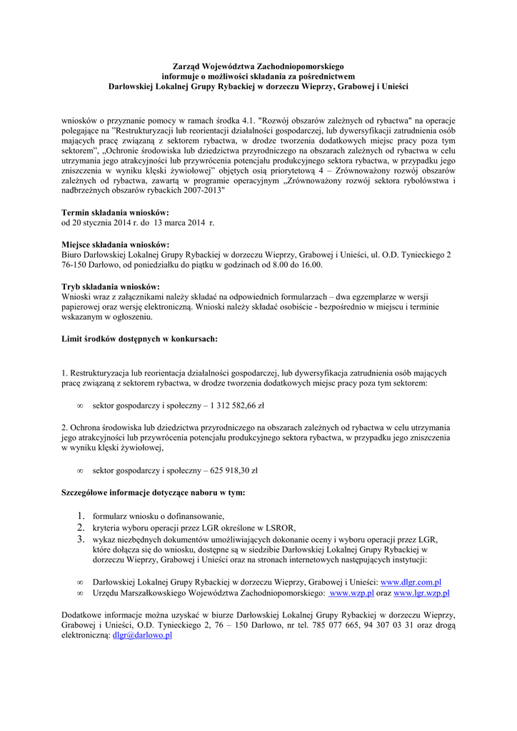 Zarząd Województwa Zachodniopomorskiego informuje o możliwości składania za pośrednictwem Darłowskiej Lokalnej Grupy Rybackiej w dorzeczu Wieprzy, Grabowej i Unieści wniosków o przyznanie pomocy w ramach środka 4.1. "Rozwój obszarów zależnych od rybactwa" na operacje polegające na ”Restrukturyzacji lub reorientacji działalności gospodarczej, lub dywersyfikacji zatrudnienia osób mających pracę związaną z sektorem rybactwa, w drodze tworzenia dodatkowych miejsc pracy poza tym sektorem”, „Ochronie środowiska lub dziedzictwa przyrodniczego na obszarach zależnych od rybactwa w celu utrzymania jego atrakcyjności lub przywrócenia potencjału produkcyjnego sektora rybactwa, w przypadku jego zniszczenia w wyniku klęski żywiołowej” objętych osią priorytetową 4 – Zrównoważony rozwój obszarów zależnych od rybactwa, zawartą w programie operacyjnym „Zrównoważony rozwój sektora rybołówstwa i nadbrzeżnych obszarów rybackich 2007-2013" Termin składania wniosków: od 20 stycznia 2014 r. do 13 marca 2014 r. Miejsce składania wniosków: Biuro Darłowskiej Lokalnej Grupy Rybackiej w dorzeczu Wieprzy, Grabowej i Unieści, ul. O.D. Tynieckiego 2 76-150 Darłowo, od poniedziałku do piątku w godzinach od 8.00 do 16.00. Tryb składania wniosków: Wnioski wraz z załącznikami należy składać na odpowiednich formularzach – dwa egzemplarze w wersji papierowej oraz wersję elektroniczną. Wnioski należy składać osobiście - bezpośrednio w miejscu i terminie wskazanym w ogłoszeniu. Limit środków dostępnych w konkursach: 1. Restrukturyzacja lub reorientacja działalności gospodarczej, lub dywersyfikacja zatrudnienia osób mających pracę związaną z sektorem rybactwa, w drodze tworzenia dodatkowych miejsc pracy poza tym sektorem: • sektor gospodarczy i społeczny – 1 312 582,66 zł 2. Ochrona środowiska lub dziedzictwa przyrodniczego na obszarach zależnych od rybactwa w celu utrzymania jego atrakcyjności lub przywrócenia potencjału produkcyjnego sektora rybactwa, w przypadku jego zniszczenia w wyniku klęski żywiołowej, • sektor gospodarczy i społeczny – 625 918,30 zł Szczegółowe informacje dotyczące naboru w tym: 1. formularz wniosku o dofinansowanie, 2. kryteria wyboru operacji przez LGR określone w LSROR, 3. wykaz niezbędnych dokumentów umożliwiających dokonanie oceny i wyboru operacji przez LGR, które dołącza się do wniosku, dostępne są w siedzibie Darłowskiej Lokalnej Grupy Rybackiej w dorzeczu Wieprzy, Grabowej i Unieści oraz na stronach internetowych następujących instytucji: • • Darłowskiej Lokalnej Grupy Rybackiej w dorzeczu Wieprzy, Grabowej i Unieści: www.dlgr.com.pl Urzędu Marszałkowskiego Województwa Zachodniopomorskiego: www.wzp.pl oraz www.lgr.wzp.pl Dodatkowe informacje można uzyskać w biurze Darłowskiej Lokalnej Grupy Rybackiej w dorzeczu Wieprzy, Grabowej i Unieści, O.D. Tynieckiego 2, 76 – 150 Darłowo, nr tel. 785 077 665, 94 307 03 31 oraz drogą elektroniczną: [email protected]