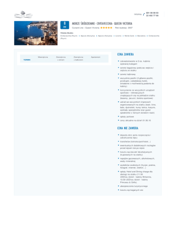 Infolinia 8 MORZE ŚRÓDZIEMNE- CIVITAVECCHIA- QUEEN VICTORIA DNI Cunard Line - Queen Victoria 801 08 08 03 22 492 77 90 | Rok budowy: 2007 TRASA REJSU: Civitavecchia (Rzym) Ajaccio (Korsyka) Ajaccio (Korsyka) Livorno Monte Carlo Barcelona Civitavecchia (Rzym) Wewnętrzna TERMIN Zewnętrzna Zewnętrzna z oknem z balkonem Apartament CENA ZAWIERA zakwaterowanie w 2-os. kabinie wybranej kategorii serwis bagażowy podczas wejścia i zejścia ze statku serwis kabinowy wszystkie posiłki (3 główne posiłki, przekąski, całodobowy bufet, śniadanie z możliwością podania do kabiny) korzystanie ze wszystkich urządzeń sportowo – rekreacyjnych znajdujących się na pokładzie statku (baseny, jacuzzi, boiska sportowe) udział we wszystkich imprezach organizowanych na statku (teatr, kino, bale, dyskoteki, kursy tańca, kasyno, wykłady specjalistów oraz guest speakerów z różnych dziedzin nauk) opłaty portowe ceny aktualne na dzień 01.06.16 CENA NIE ZAWIERA dojazdu do/z portu rozpoczęcia i zakończenia rejsu transferów (lotnisko/port/hotel...) ewentualnych dodatkowych noclegów przed rejsem lub po rejsie kosztu wycieczek fakultatywnych (kupowanych na statku) napojów gazowanych, alkoholowych, wody mineralnej wydatków osobistych (fryzjer, pralnia, fotograf, internet, telefon...) opłaty Hotel and Dining charge dla obsługi na statku (11.50 USD/os./dzień - kabiny Britannia, 13.50 USD/os./dzień - kabiny Princess & Grills) ubezpieczenia turystycznego kosztu wymaganych wiz