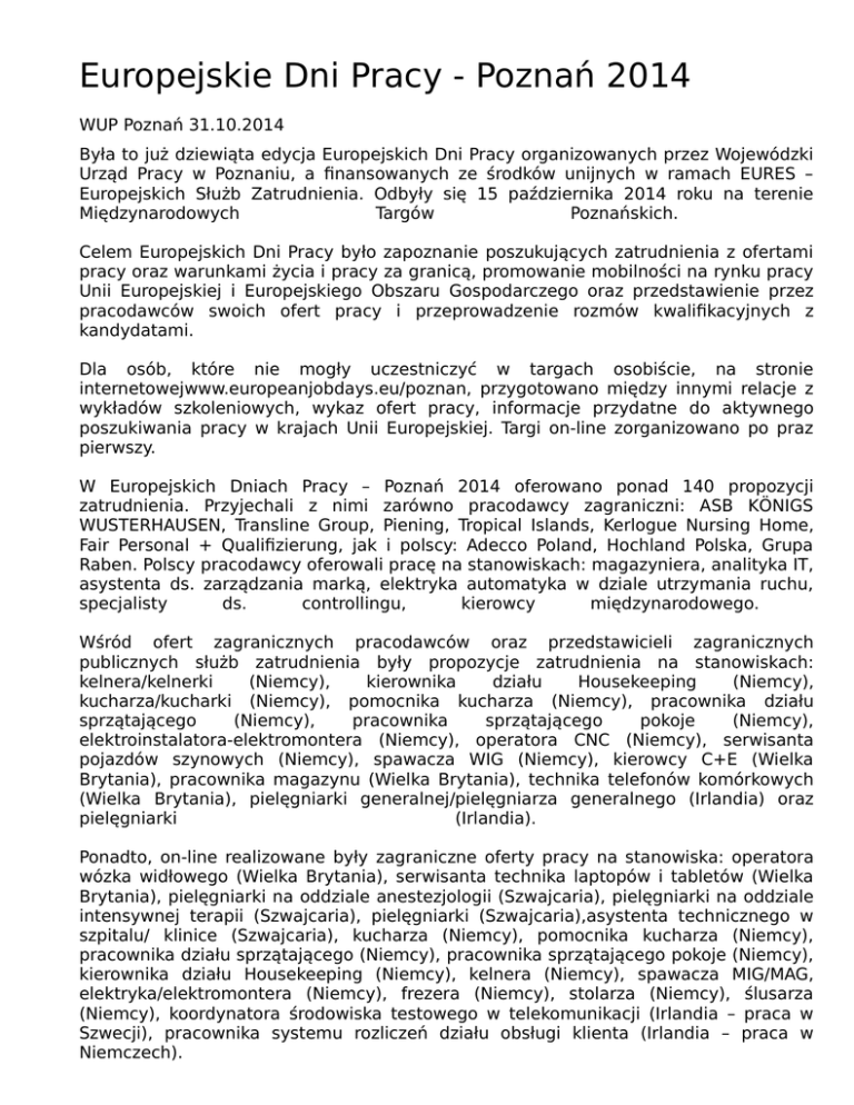 Europejskie Dni Pracy - Poznań 2014 WUP Poznań 31.10.2014 Była to już dziewiąta edycja Europejskich Dni Pracy organizowanych przez Wojewódzki Urząd Pracy w Poznaniu, a finansowanych ze środków unijnych w ramach EURES – Europejskich Służb Zatrudnienia. Odbyły się 15 października 2014 roku na terenie Międzynarodowych Targów Poznańskich. Celem Europejskich Dni Pracy było zapoznanie poszukujących zatrudnienia z ofertami pracy oraz warunkami życia i pracy za granicą, promowanie mobilności na rynku pracy Unii Europejskiej i Europejskiego Obszaru Gospodarczego oraz przedstawienie przez pracodawców swoich ofert pracy i przeprowadzenie rozmów kwalifikacyjnych z kandydatami. Dla osób, które nie mogły uczestniczyć w targach osobiście, na stronie internetowejwww.europeanjobdays.eu/poznan, przygotowano między innymi relacje z wykładów szkoleniowych, wykaz ofert pracy, informacje przydatne do aktywnego poszukiwania pracy w krajach Unii Europejskiej. Targi on-line zorganizowano po praz pierwszy. W Europejskich Dniach Pracy – Poznań 2014 oferowano ponad 140 propozycji zatrudnienia. Przyjechali z nimi zarówno pracodawcy zagraniczni: ASB KӦNIGS WUSTERHAUSEN, Transline Group, Piening, Tropical Islands, Kerlogue Nursing Home, Fair Personal + Qualifizierung, jak i polscy: Adecco Poland, Hochland Polska, Grupa Raben. Polscy pracodawcy oferowali pracę na stanowiskach: magazyniera, analityka IT, asystenta ds. zarządzania marką, elektryka automatyka w dziale utrzymania ruchu, specjalisty ds. controllingu, kierowcy międzynarodowego. Wśród ofert zagranicznych pracodawców oraz przedstawicieli zagranicznych publicznych służb zatrudnienia były propozycje zatrudnienia na stanowiskach: kelnera/kelnerki (Niemcy), kierownika działu Housekeeping (Niemcy), kucharza/kucharki (Niemcy), pomocnika kucharza (Niemcy), pracownika działu sprzątającego (Niemcy), pracownika sprzątającego pokoje (Niemcy), elektroinstalatora-elektromontera (Niemcy), operatora CNC (Niemcy), serwisanta pojazdów szynowych (Niemcy), spawacza WIG (Niemcy), kierowcy C+E (Wielka Brytania), pracownika magazynu (Wielka Brytania), technika telefonów komórkowych (Wielka Brytania), pielęgniarki generalnej/pielęgniarza generalnego (Irlandia) oraz pielęgniarki (Irlandia). Ponadto, on-line realizowane były zagraniczne oferty pracy na stanowiska: operatora wózka widłowego (Wielka Brytania), serwisanta technika laptopów i tabletów (Wielka Brytania), pielęgniarki na oddziale anestezjologii (Szwajcaria), pielęgniarki na oddziale intensywnej terapii (Szwajcaria), pielęgniarki (Szwajcaria),asystenta technicznego w szpitalu/ klinice (Szwajcaria), kucharza (Niemcy), pomocnika kucharza (Niemcy), pracownika działu sprzątającego (Niemcy), pracownika sprzątającego pokoje (Niemcy), kierownika działu Housekeeping (Niemcy), kelnera (Niemcy), spawacza MIG/MAG, elektryka/elektromontera (Niemcy), frezera (Niemcy), stolarza (Niemcy), ślusarza (Niemcy), koordynatora środowiska testowego w telekomunikacji (Irlandia – praca w Szwecji), pracownika systemu rozliczeń działu obsługi klienta (Irlandia – praca w Niemczech). Informacje można było uzyskać także u przedstawicieli kilku instytucji. Samorząd Województwa Wielkopolskiego – Wojewódzki Urząd Pracy w Poznaniu informował na temat zagranicznych ofert pracy oraz Europejskiego Funduszu Społecznego; Wielkopolski Oddział Wojewódzki Narodowego Funduszu Zdrowia w Poznaniu i Zakład Ubezpieczeń Społecznych – na temat świadczeń, w tym nabywanych za granicą: Wydział Działalności Gospodarczej i Rolnictwa Urzędu Miasta Poznania na temat zakładania własnej działalności gospodarczej oraz możliwości uzyskania wsparcia w tym zakresie; Państwowa Inspekcja Pracy na temat przestrzegania przepisów prawa pracy oraz zasad bezpieczeństwa i higieny pracy; Starostwo Powiatowe – Powiatowy Urząd Pracy w Poznaniu prezentował oferty pracy oraz informacje na temat świadczeń dla osób bezrobotnych. Swoje stoiska miały też Izba Skarbowa w Poznaniu, Wielkopolska Wojewódzka Komenda Ochotniczych Hufców Pracy w Poznaniu, biura karier Akademii Wychowania Fizycznego w Poznaniu oraz Uniwersytetu im. Adama Mickiewicza w Poznaniu, Centrum Praktyk i Karier Studentów i Absolwentów Politechniki Poznańskiej, Biuro Karier i Relacji z Absolwentami Uniwersytetu Ekonomicznego w Poznaniu a także Poznańskie Centrum Edukacji Ustawicznej i Praktycznej, Centrum Kształcenia Zawodowego i Ustawicznego w Poznaniu, Europass oraz Eurodesk. Działał również punkt konsultacyjny, w którym przybyli na targi pracy mogli skorzystać z porady doradcy zawodowego. Podczas wykładów zagraniczni doradcy EURES mówili o warunkach życia i pracy na Litwie, w Szwecji, w Irlandii, Niemczech. Pracownicy Wojewódzkiego Urzędu Pracy i zaproszeni goście prezentowali praktyczne aspekty ubezpieczenia zdrowotnego w Niemczech, ubezpieczenia społeczne w Unii Europejskiej, wsparcie kobiet z Programu Operacyjnego Kapitał Ludzki w województwie wielkopolskim, informowali, jak założyć własną firmę oraz o zasadach podlegania ubezpieczeniom i opłacania składek, a także przeprowadzili cieszące się dużym zainteresowaniem warsztaty. Ich tematy to „Bądź aktywna na rynku pracy", „Szukaj pracy z głową" a także „Od zera do milionera – droga do sukcesu w biznesie". Dostosowano je do idei przewodniej, czyli sytuacji kobiet na rynku pracy oraz dążenia do utrzymania na rynku nowo zakładanych podmiotów gospodarczych. W Europejskich Dniach Pracy wzięło udział jedenastu doradców EURES z różnych krajów. Do Poznania przyjechało sześciu doradców z Irlandii, Szwecji, Litwy i Niemiec, natomiast on-line dostępnych było pięciu doradców EURES z Holandii, Hiszpanii, Belgii i Portugalii. Targi odwiedziło około tysiąc osób, przeprowadzono rozmowy kwalifikacyjne z kilkuset osobami.